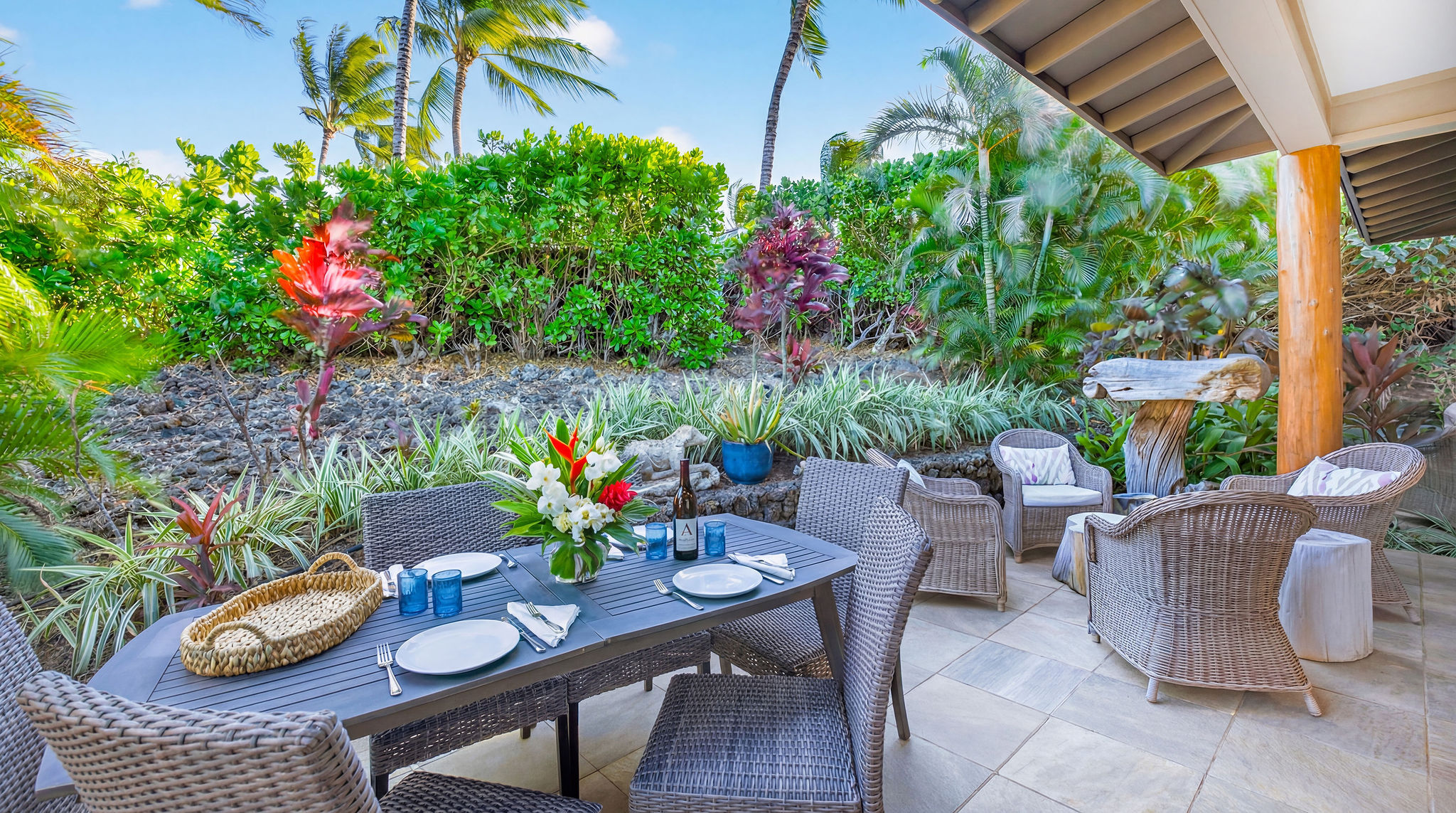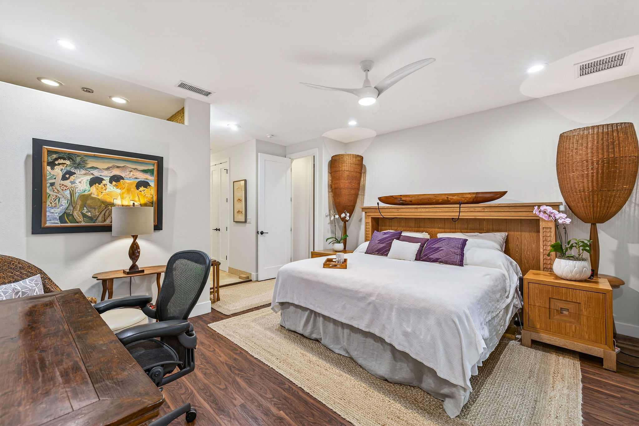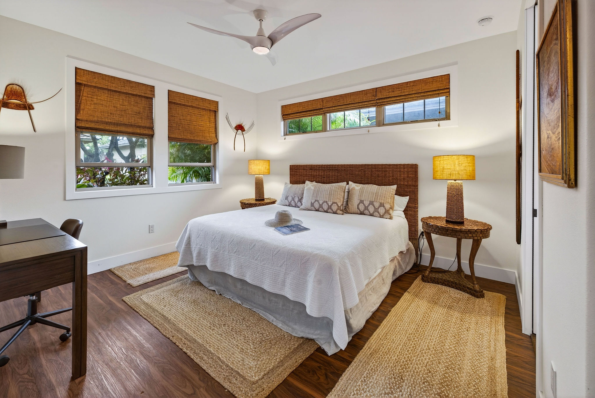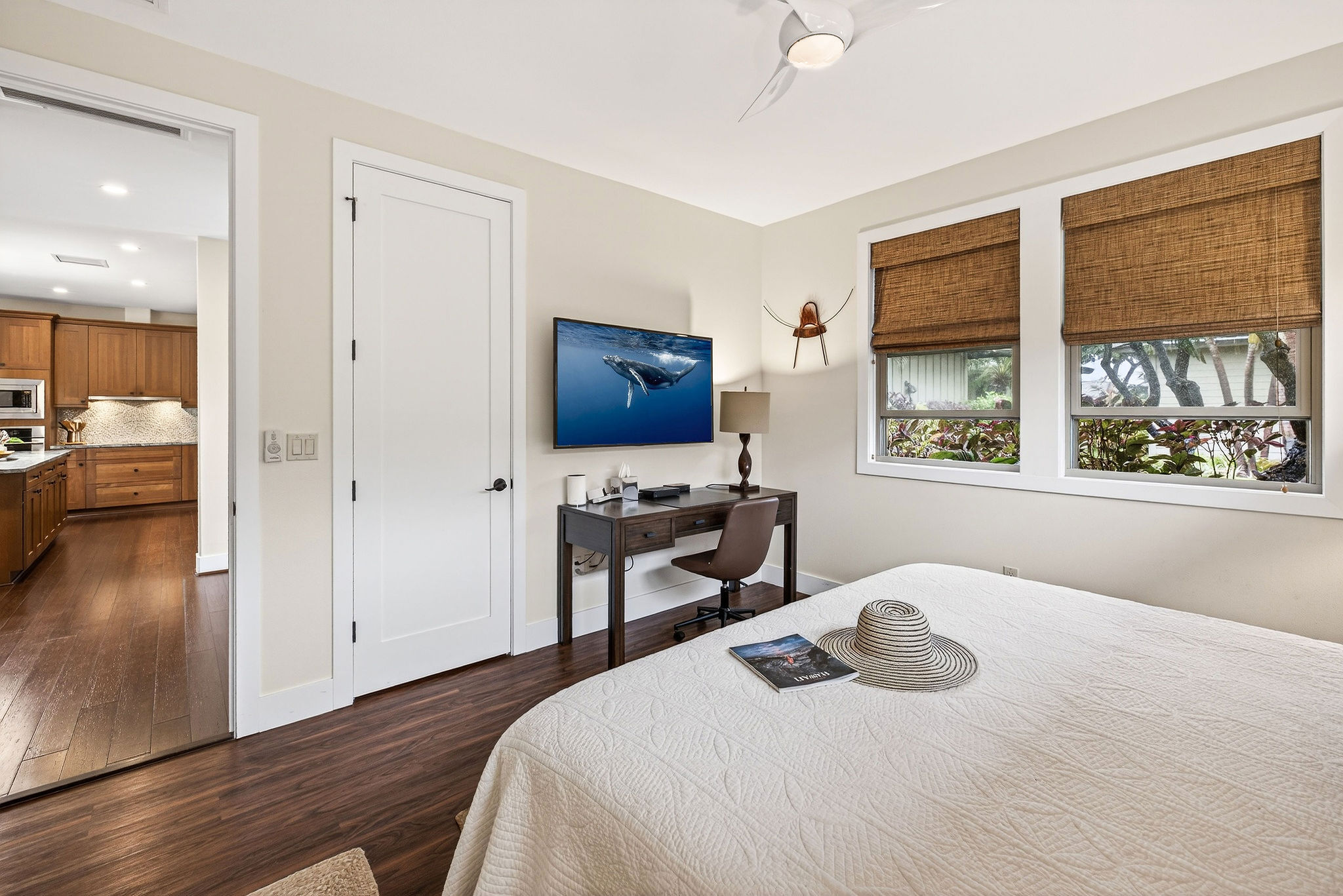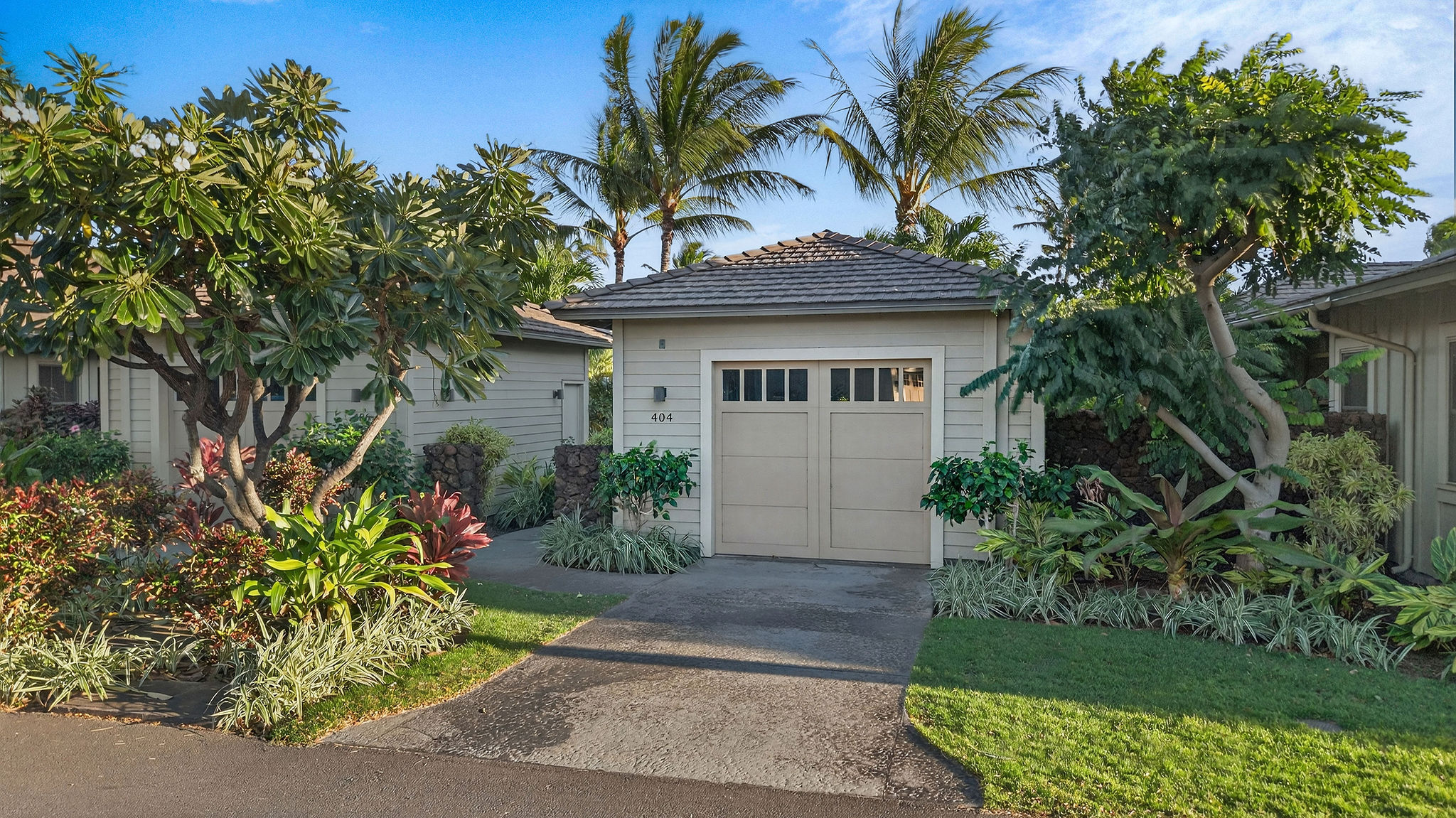 Welcome to KaMilo Cottage 404, a rare detached, single-level residence offering the privacy and comfort of a single-family home with the ease of low-maintenance condo living. Beautifully furnished and move-in ready, this highly desirable 3-bedroom, 3-bath home is one of only six Keanu A floorplans ever built in the KaMilo community and is rarely available. Thoughtfully designed for privacy and comfort, the home features two primary suites, each with spa-inspired bathrooms, double vanities, and floor-to-ceiling tile. The primary bath showcases a spa-style wet room with a freestanding soaking tub and walk-in shower. The open-concept great room is enhanced by beautiful wood flooring throughout, 9-foot ceilings, and a signature grass-cloth ceiling treatment, creating a refined island aesthetic. The contemporary kitchen is ideal for entertaining, featuring granite countertops, a large center island, and stainless steel appliances. Large sliding doors open to a private lanai surrounded by lush tropical landscaping, seamlessly blending indoor and outdoor living–perfect for morning coffee or evening gatherings under the stars. Additional highlights include acacia cabinetry, custom tile work, a leased photovoltaic system, a one-car garage, and extra storage for beach gear. Currently operating as an active vacation rental, this versatile residence is equally well suited as a primary home, second home, or investment property, offering exceptional flexibility within one of Mauna Lani’s most desirable communities. KaMilo’s 2-acre amenity center, just steps away, features a resort-style family pool, adult lap pool, 2 spas, fitness center, and gathering hale. Ownership also includes access to the Mauna Lani Owners Beach Club, with nearby beaches, golf, dining, shopping, and resort amenities. Rarely available and impeccably maintained, this turnkey residence presents a unique opportunity in one of Mauna Lani’s most sought-after communities