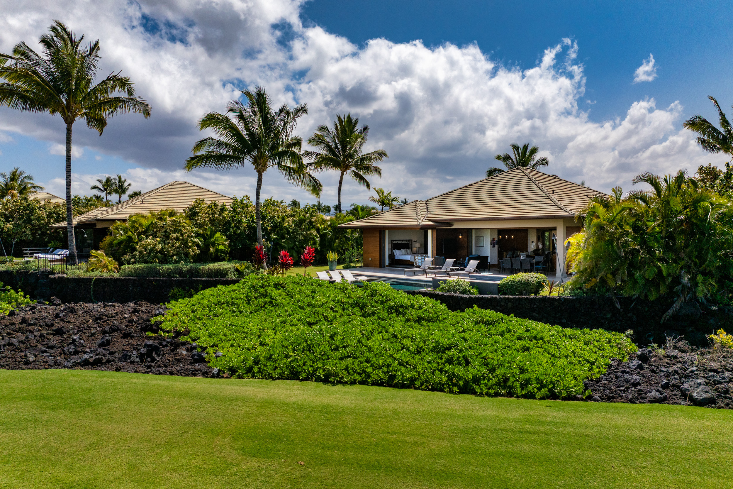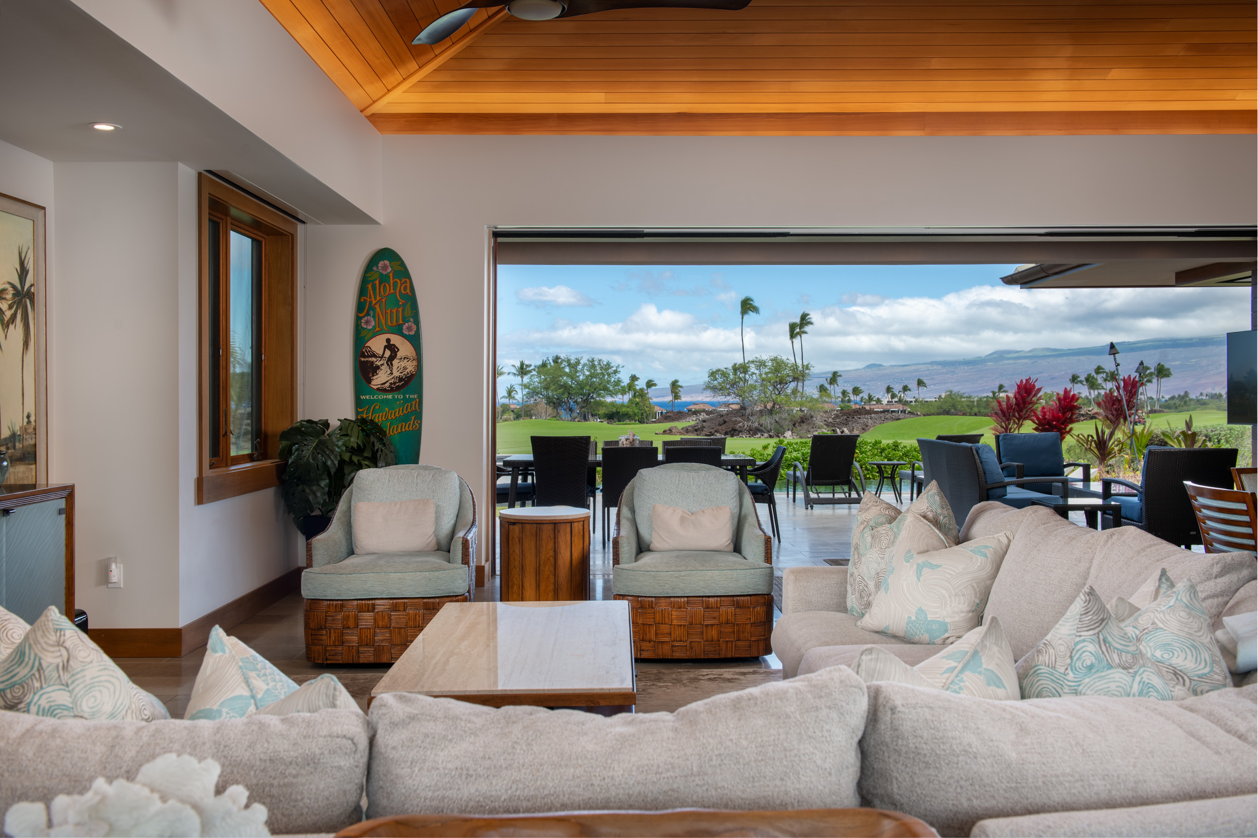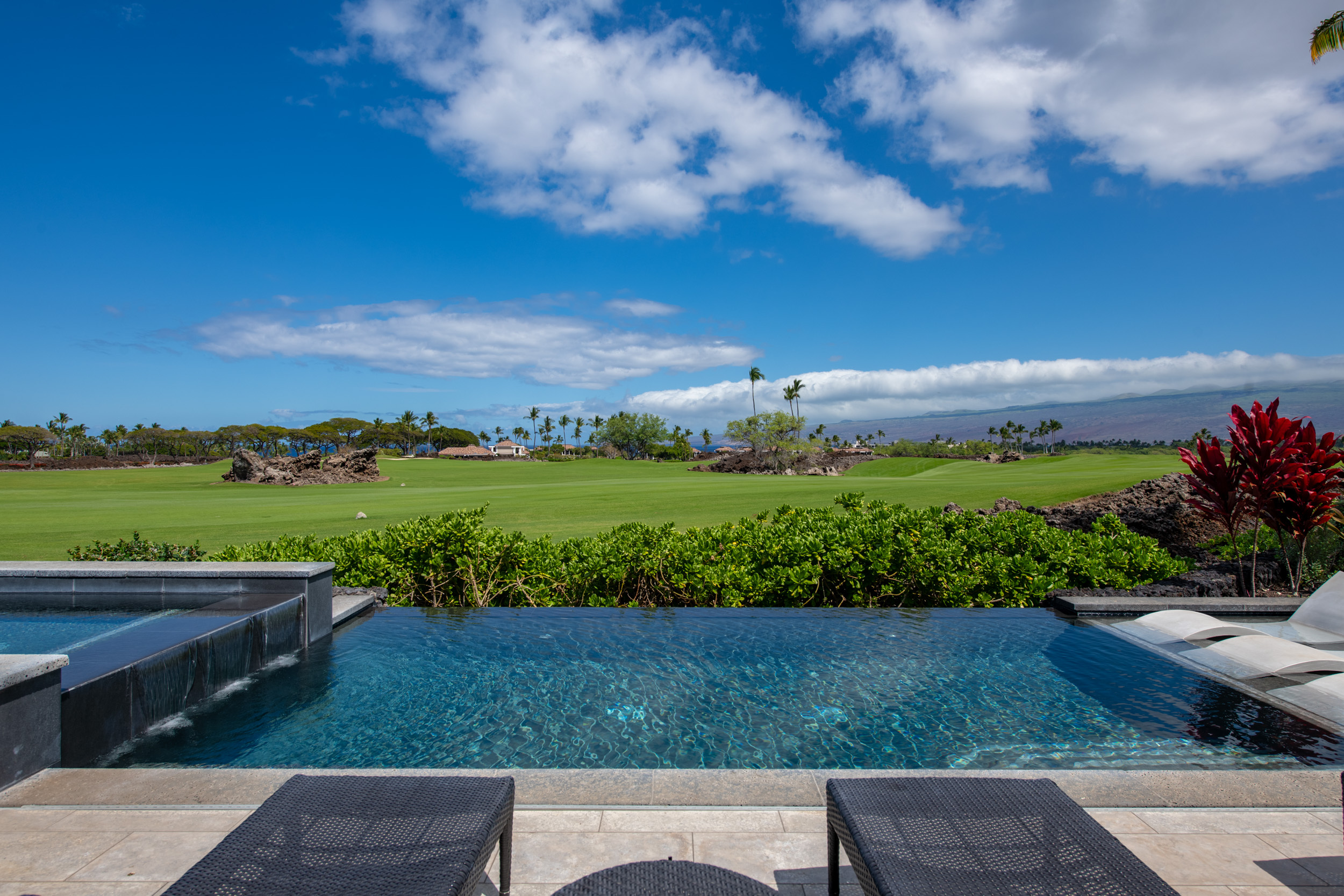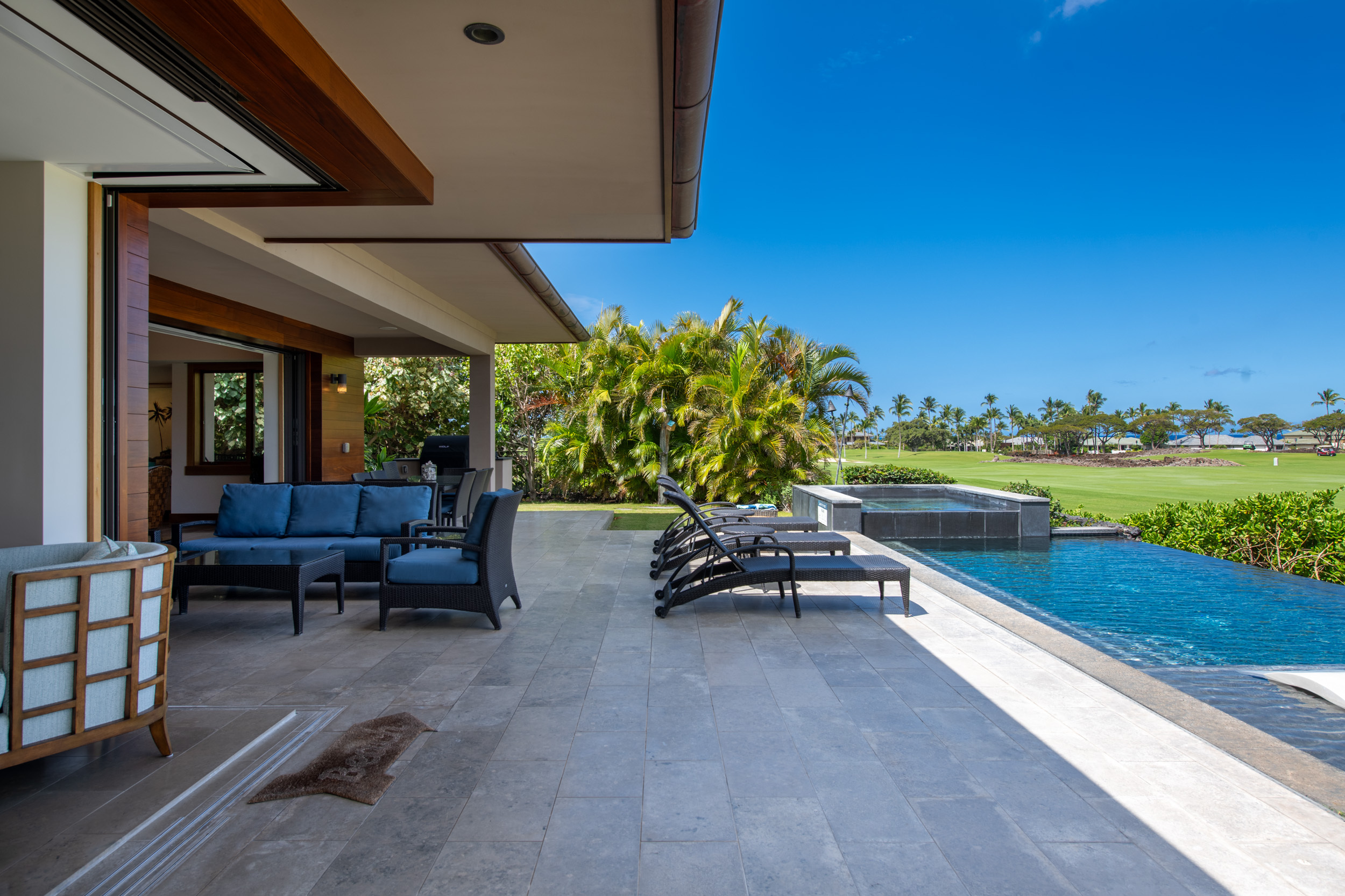 Introducing The Residences of Laule’a #8, a rare opportunity along the renowned Francis I’i Brown South Course in Mauna Lani. Hand-selected for its expansive golf course views and private orientation, this exceptional residence offers refined island living in one of the Kohala Coast’s most desirable communities. Thoughtfully enhanced during design, the home features an expanded resort-style pool with Baja shelf, a flexible den/office with adjacent full bath for guests, and double washer/dryer hook-ups–ideal for larger households or potential short-term rental use. While not currently licensed, the property qualifies for a Short-Term Vacation Rental permit under existing zoning and CC&Rs. Designed by acclaimed architect Wayne Morimoto of Kahiau Design, this single-level floor plan lives like a private home with no shared walls and seamless indoor-outdoor flow. A gated backyard enhances privacy while framing picturesque fairway views. Vaulted tongue-and-groove ceilings, hand-scraped European white oak floors, and refined stone tile create a modern yet distinctly Hawaiian aesthetic. The main home offers four spacious en-suite bedrooms, plus a detached ‘ohana suite–perfect for hosting family and friends. The chef’s kitchen is beautifully appointed with paneled Sub-Zero and Wolf appliances and custom cabinetry. Spa-inspired baths with on-demand hot water, including an outdoor shower off the primary suite, provide a tranquil retreat. Pocketing glass doors invite in trade-winds and stunning sunset views. An extraordinary offering that embodies the very best of Kohala Coast living.