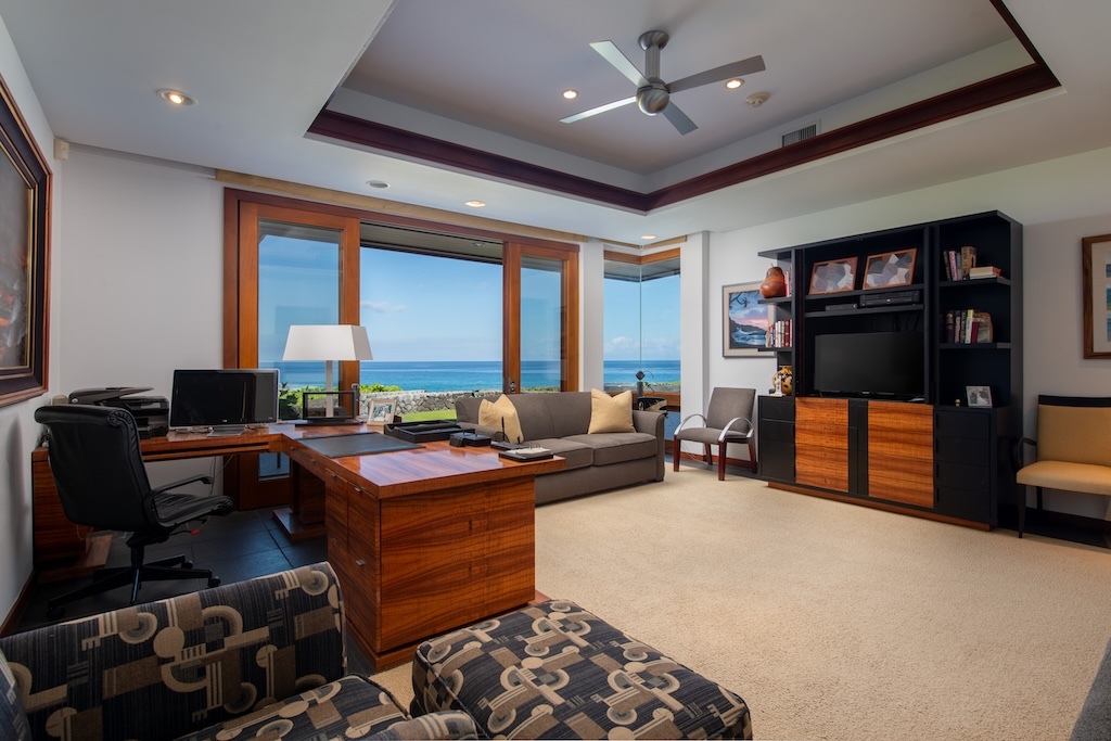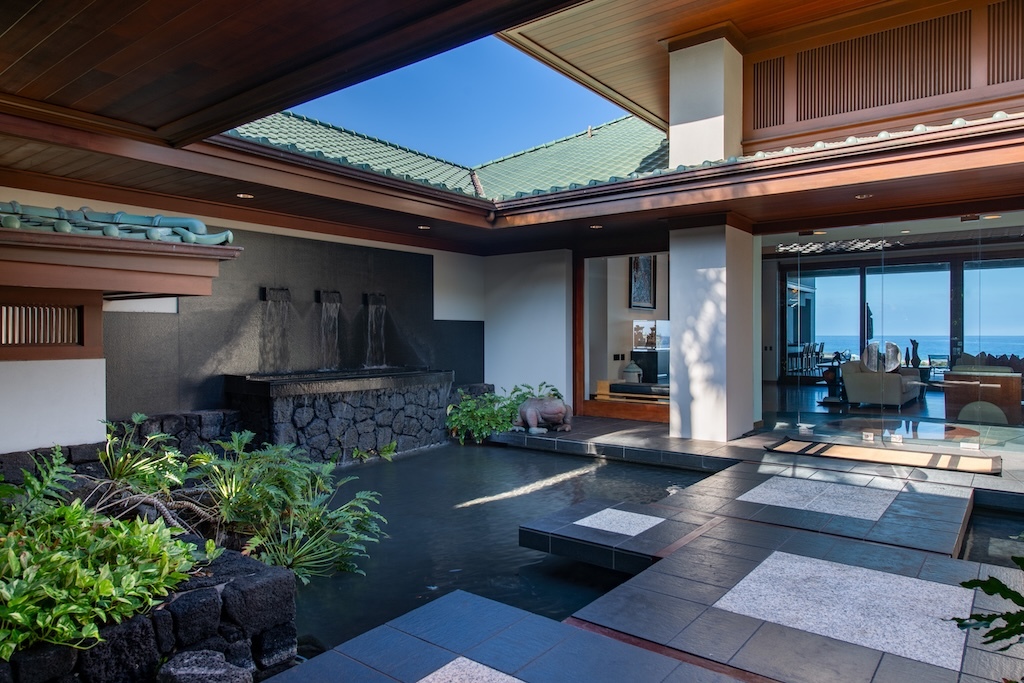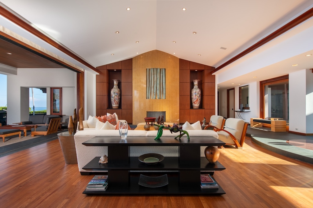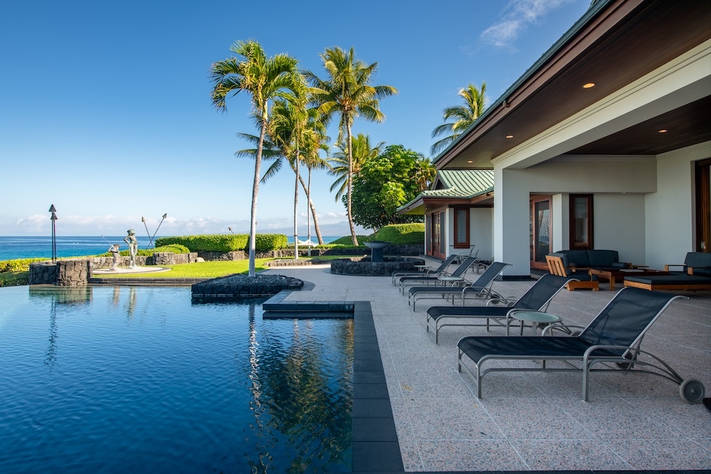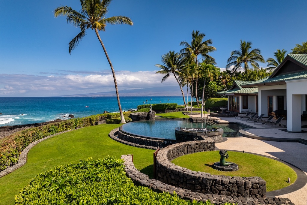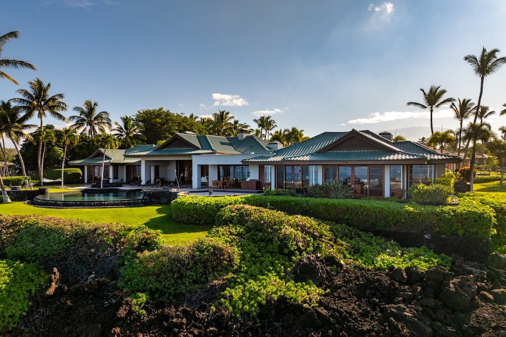 Gracefully positioned in one of the most coveted communities on the Kohala Coast of the Big lsland of Hawaii, this oceanfront 7,844 -square-foot residence on 1.38 acres at the Cape at Mauna Lani offers five bedrooms, seven and a half baths, a spacious media room and a private office, designed by renowned Lucky Bennett to capture sweeping ocean, fairway, mountain and sunset views. A formal entry with waterfalls and ponds creates a dramatic reveal of the great room and the Pacific beyond. Inside, soaring ceilings, Brazilian cherry and flamed granite floors and architectural symmetry define the expansive living space. A striking fireplace wall framed by custom wood paneling and curated niches anchors the room, while disappearing pocket doors open completely to the oceanfront lanai, infinity-edge pools and spa that appear to merge seamlessly with the ocean. The warm chef inspired kitchen features rich, custom cabinetry, generous workspace and a seamless connection to the dining area, outdoor gathering area and ocean beyond. The primary suite is situated on the south corner in a private wing with fairway and ocean frontage and his and her spa-inspired baths. Guest bedroom suites are thoughtfully separated for privacy. The dedicated media room, overlooking the ponds and waterfalls provides an immersive retreat for film and entertainment, while the private office offers a quiet, light-filled workspace with inspiring coastal vistas. Manicured lawns, charming sculptures, lava rock walls, and curated tropical landscaping frame the infinity pool and spa. The property has rare dual frontage–dramatic ocean cliffs and emerald fairways on the other. This is a legacy residence, an architectural statement, dramatic and timeless.
