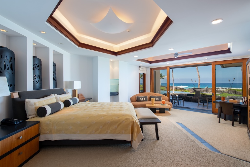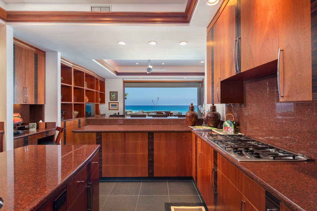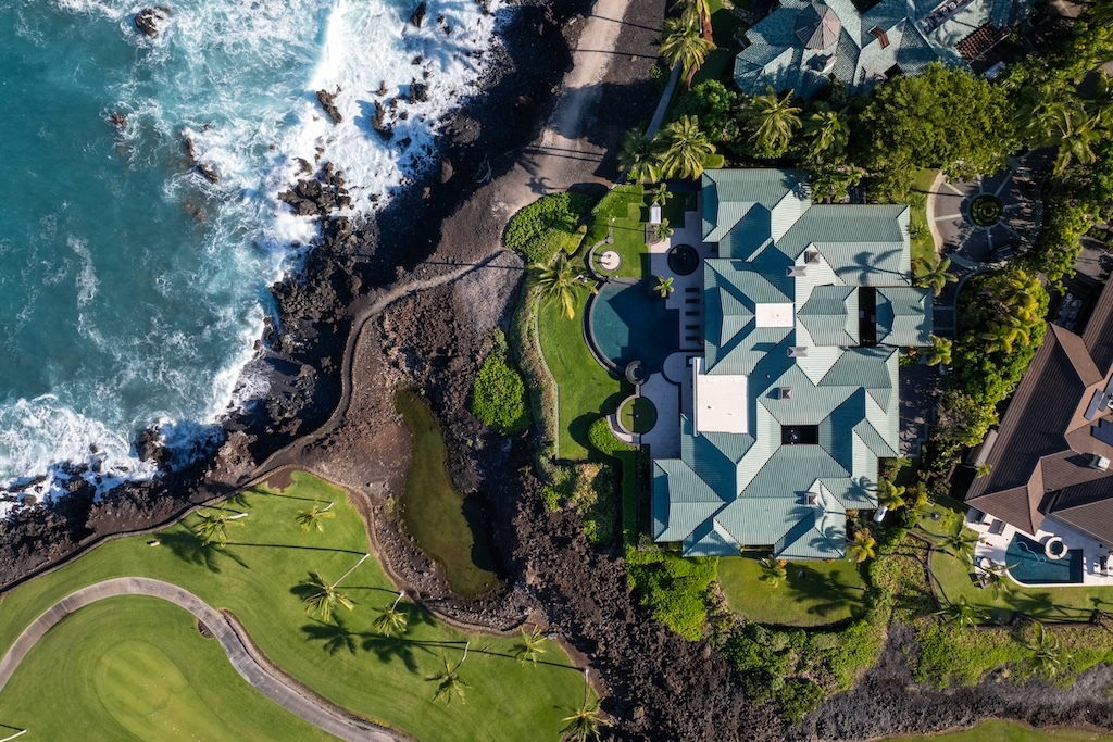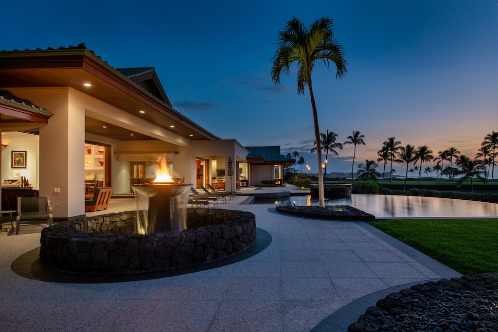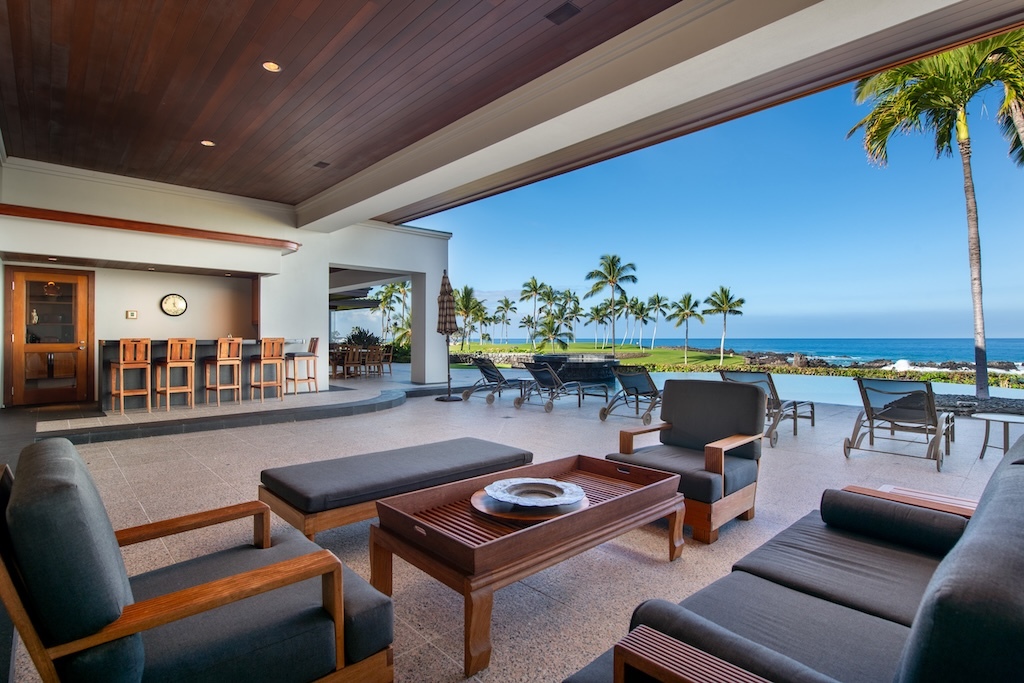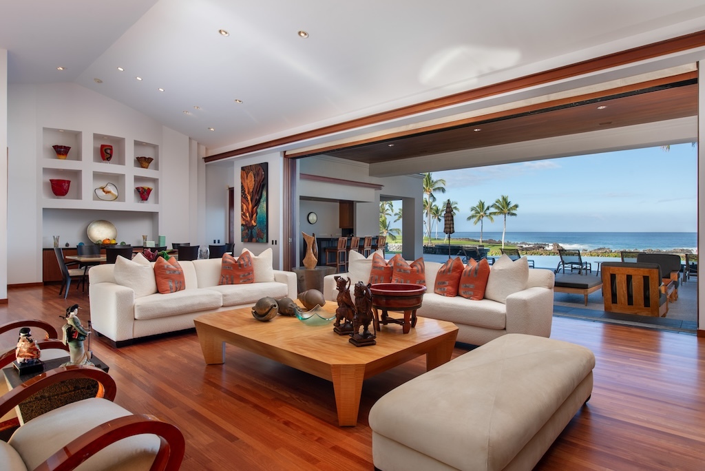 Gracefully positioned in one of the most coveted communities on the Kohala Coast of the Big lsland of Hawaii, this oceanfront 7,844 -square-foot residence on 1.38 acres at the Cape at Mauna Lani offers five bedrooms, seven and a half baths, a spacious media room and a private office, designed by renowned Lucky Bennett to capture sweeping ocean, fairway, mountain and sunset views. A formal entry with waterfalls and ponds creates a dramatic reveal of the great room and the Pacific beyond. Inside, soaring ceilings, Brazilian cherry and flamed granite floors and architectural symmetry define the expansive living space. A striking fireplace wall framed by custom wood paneling and curated niches anchors the room, while disappearing pocket doors open completely to the oceanfront lanai, infinity-edge pools and spa that appear to merge seamlessly with the ocean. The warm chef inspired kitchen features rich, custom cabinetry, generous workspace and a seamless connection to the dining area, outdoor gathering area and ocean beyond. The primary suite is situated on the south corner in a private wing with fairway and ocean frontage and his and her spa-inspired baths. Guest bedroom suites are thoughtfully separated for privacy. The dedicated media room, overlooking the ponds and waterfalls provides an immersive retreat for film and entertainment, while the private office offers a quiet, light-filled workspace with inspiring coastal vistas. Manicured lawns, charming sculptures, lava rock walls, and curated tropical landscaping frame the infinity pool and spa. The property has rare dual frontage–dramatic ocean cliffs and emerald fairways on the other. This is a legacy residence, an architectural statement, dramatic and timeless.