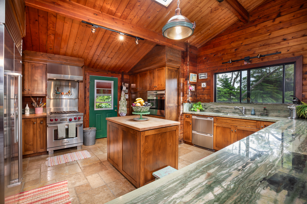 The interior features stone flooring throughout the main areas. Granite countertops adorn the well-appointed kitchen, which includes top-of-the-line appliances such as a Wolf range Sub-Zero refrigerator/freezer, Sub-Zero full-size ice maker, and other high quality amenities.