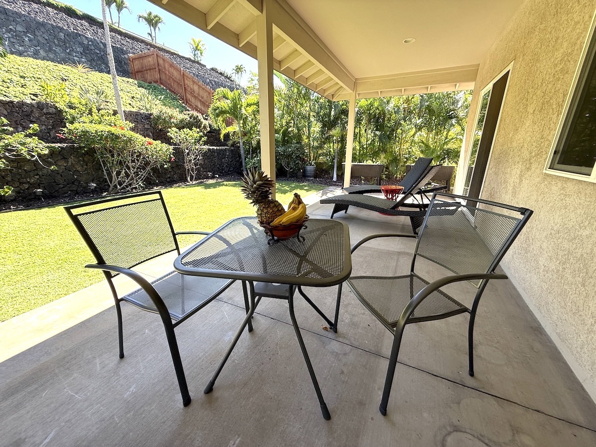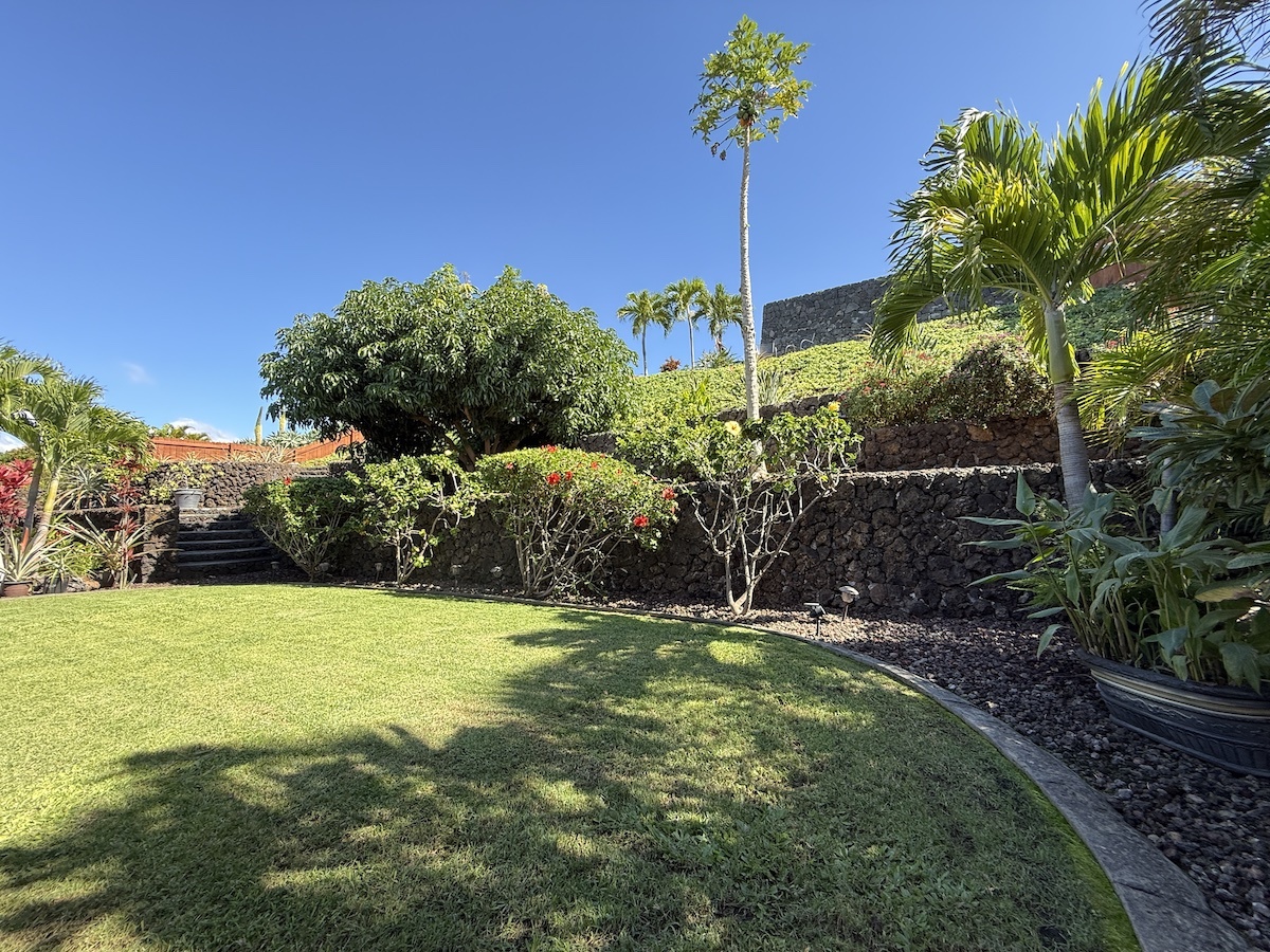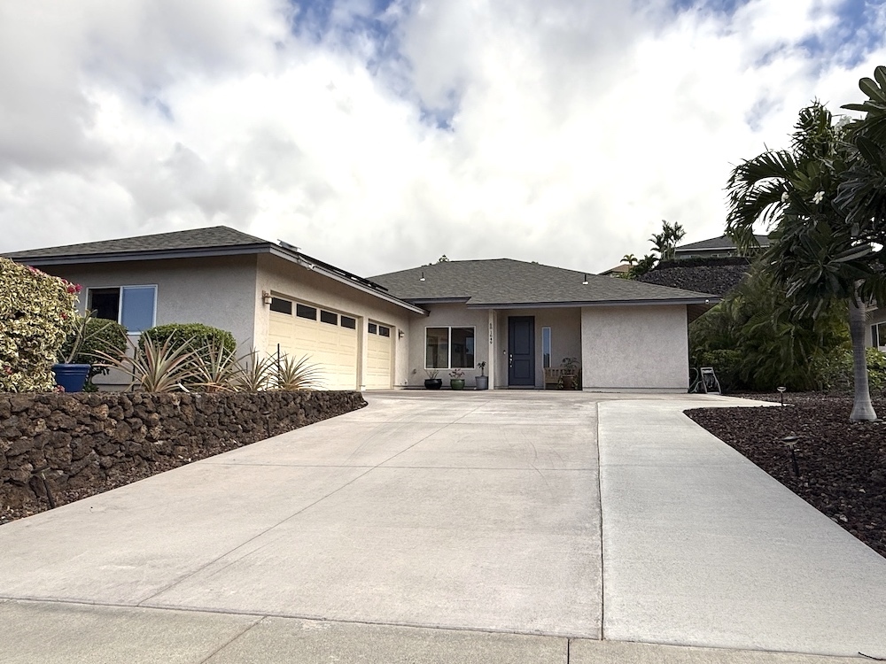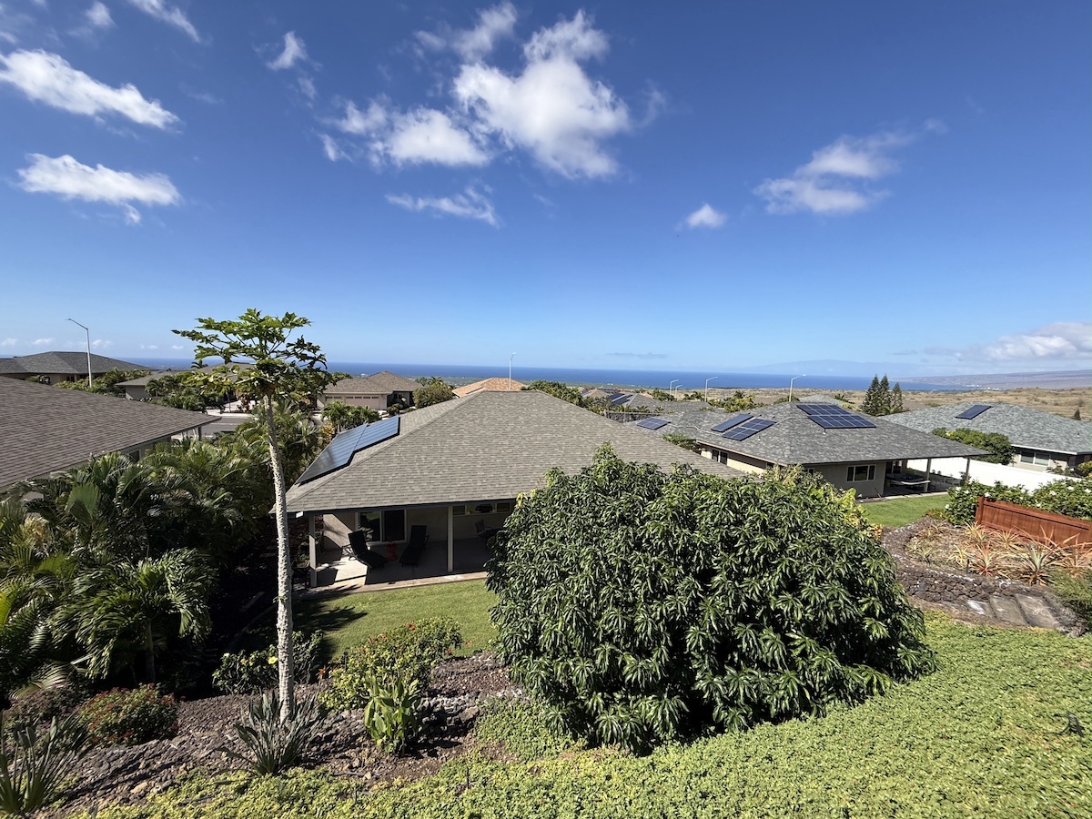 Don't miss this comfortable island-style home with a solar PV system, air conditioning, an oversized garage, and a private, low-maintenance yard. Located on the best street in desirable Sunset Ridge at Waikoloa Village in an area of newer homes, this well-maintained, 3-bedroom, 2-bath, 1,741 sq. ft. home features an open concept living area with 9' ceilings for a spacious feel, direct access from the dining area & primary BR to a large covered lanai, an oversized 3-car garage and more. Additional features include: - Owned PV system w/18 Kw battery and 16 360-watt panels for low electric bills (about $30/month). Installed 2021. - Split-zoned AC installed April 2022 (4 zones). - The Primary suite is located on opposite side of the home from the other bedrooms. - Custom shelving in primary suite - Dedicated laundry room w/sink & built-ins - Wyze wireless security system - Intimate back yard w/an elevated terrace offering amazing ocean & sunset views - Professionally landscaped, low-maintenance grounds planted w/pineapple, mango, papaya, star fruit, lime, orange & lemon trees - Wooden fencing & rock walls for privacy - 6-valve irrigation system for easy watering - Expanded concrete driveway for extra turnaround room - New slim-line refrigerator, newer washer - Solar water heater w/gray box - Custom storage racks in the garage - Solar attic vent installed at garage ceiling - Septic pumped 2022 - Recent interior paint in the living room, kitchen, nook & hallway - Additional dedicated elect. plugs in garage to service an extra freezer & refrigerator. Both appliances included. - Quiet location near the western edge of the subdivision Waikoloa Village Assoc. amenities incl. swimming pool, tennis/pickle ball, discounted golf & more. Offered partly furnished per inventory by the original owner, this 2016 home is priced competitively compared to older homes in the same neighborhood. Come take a look!
