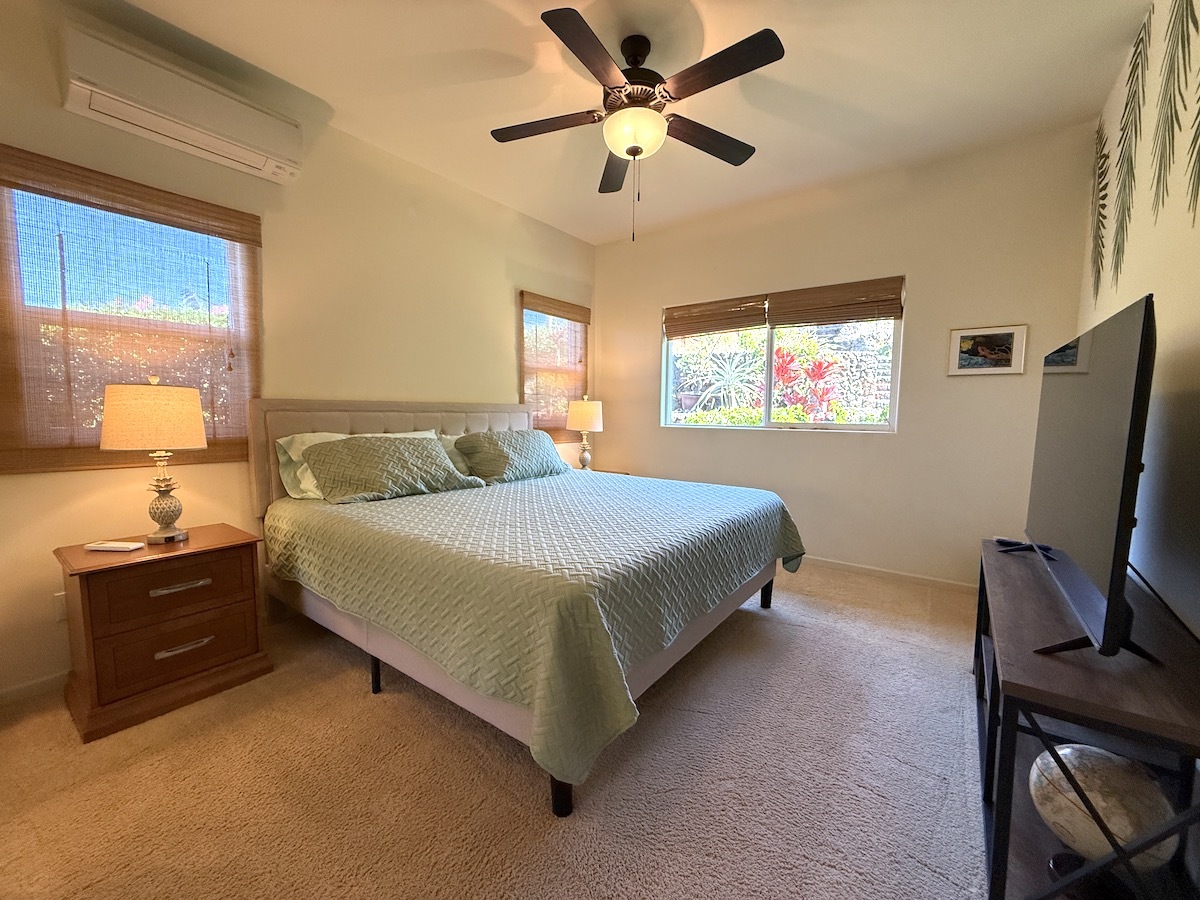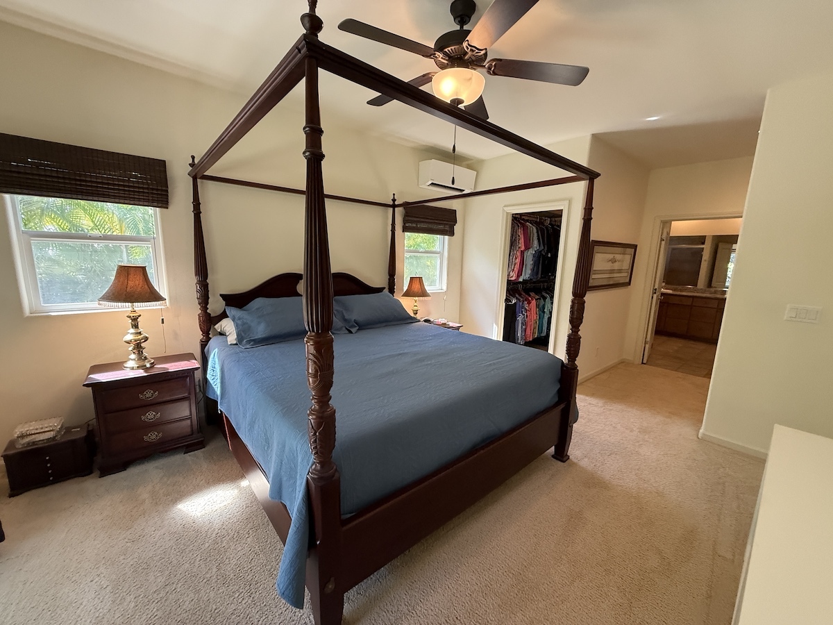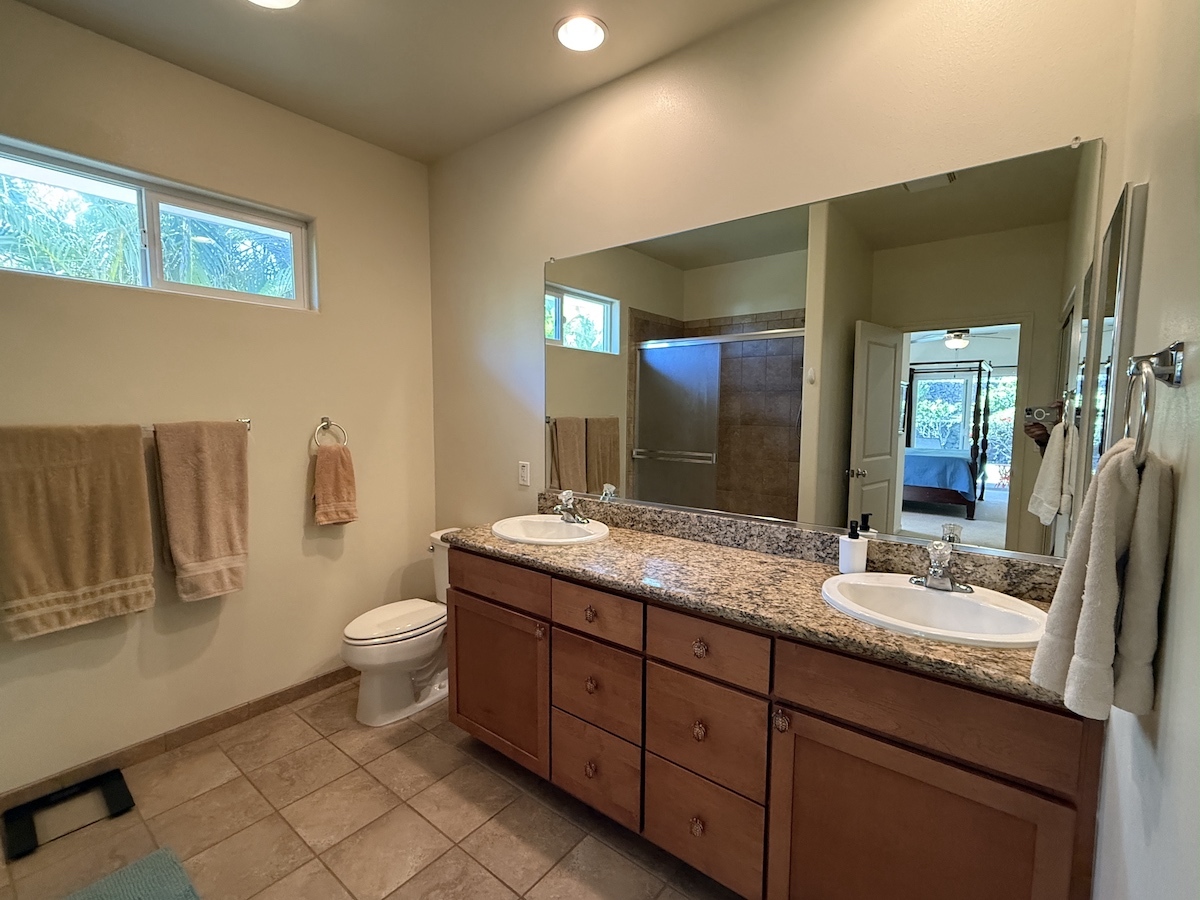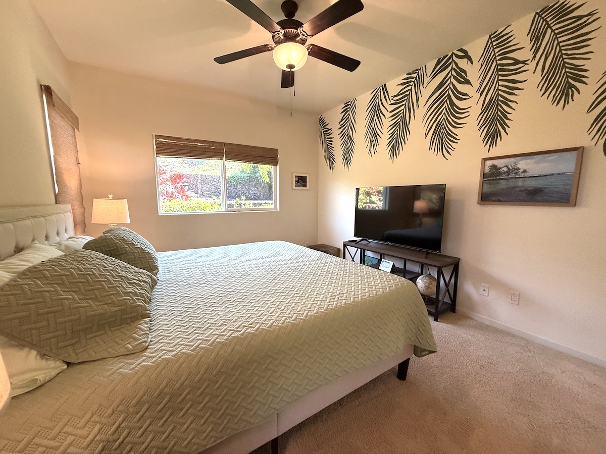 Don't miss this comfortable island-style home with a solar PV system, air conditioning, an oversized garage, and a private, low-maintenance yard. Located on the best street in desirable Sunset Ridge at Waikoloa Village in an area of newer homes, this well-maintained, 3-bedroom, 2-bath, 1,741 sq. ft. home features an open concept living area with 9' ceilings for a spacious feel, direct access from the dining area & primary BR to a large covered lanai, an oversized 3-car garage and more. Additional features include: - Owned PV system w/18 Kw battery and 16 360-watt panels for low electric bills (about $30/month). Installed 2021. - Split-zoned AC installed April 2022 (4 zones). - The Primary suite is located on opposite side of the home from the other bedrooms. - Custom shelving in primary suite - Dedicated laundry room w/sink & built-ins - Wyze wireless security system - Intimate back yard w/an elevated terrace offering amazing ocean & sunset views - Professionally landscaped, low-maintenance grounds planted w/pineapple, mango, papaya, star fruit, lime, orange & lemon trees - Wooden fencing & rock walls for privacy - 6-valve irrigation system for easy watering - Expanded concrete driveway for extra turnaround room - New slim-line refrigerator, newer washer - Solar water heater w/gray box - Custom storage racks in the garage - Solar attic vent installed at garage ceiling - Septic pumped 2022 - Recent interior paint in the living room, kitchen, nook & hallway - Additional dedicated elect. plugs in garage to service an extra freezer & refrigerator. Both appliances included. - Quiet location near the western edge of the subdivision Waikoloa Village Assoc. amenities incl. swimming pool, tennis/pickle ball, discounted golf & more. Offered partly furnished per inventory by the original owner, this 2016 home is priced competitively compared to older homes in the same neighborhood. Come take a look!
