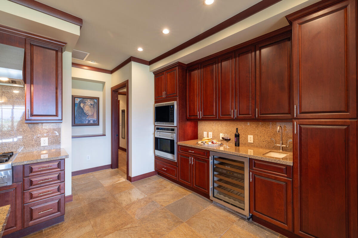 Gourmet Kitchen: Equipped with an island, granite solid countertops, and a suite of high-end appliances, including a gas cooktop, microwave, oven, dishwasher, disposal, and wine cooler.