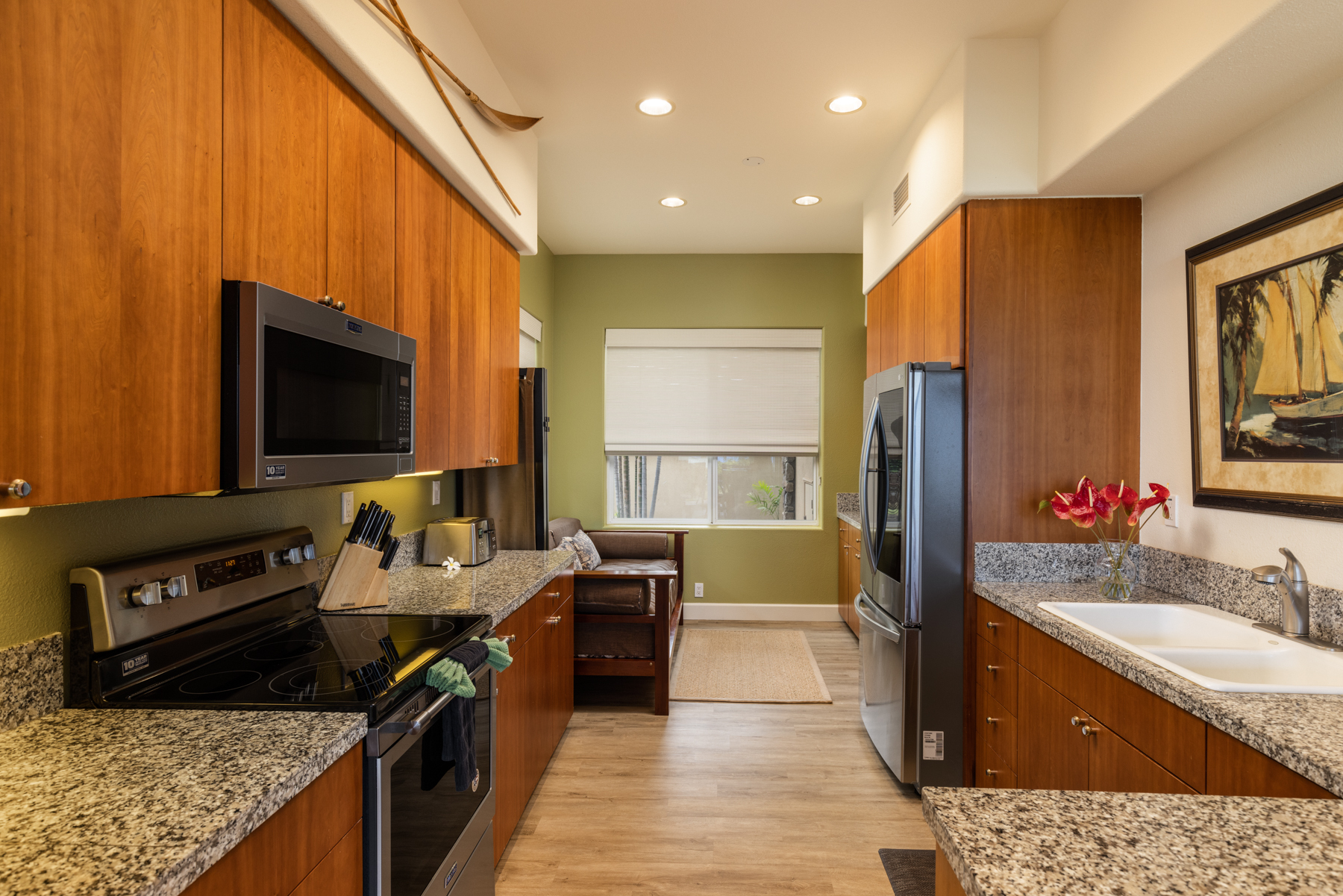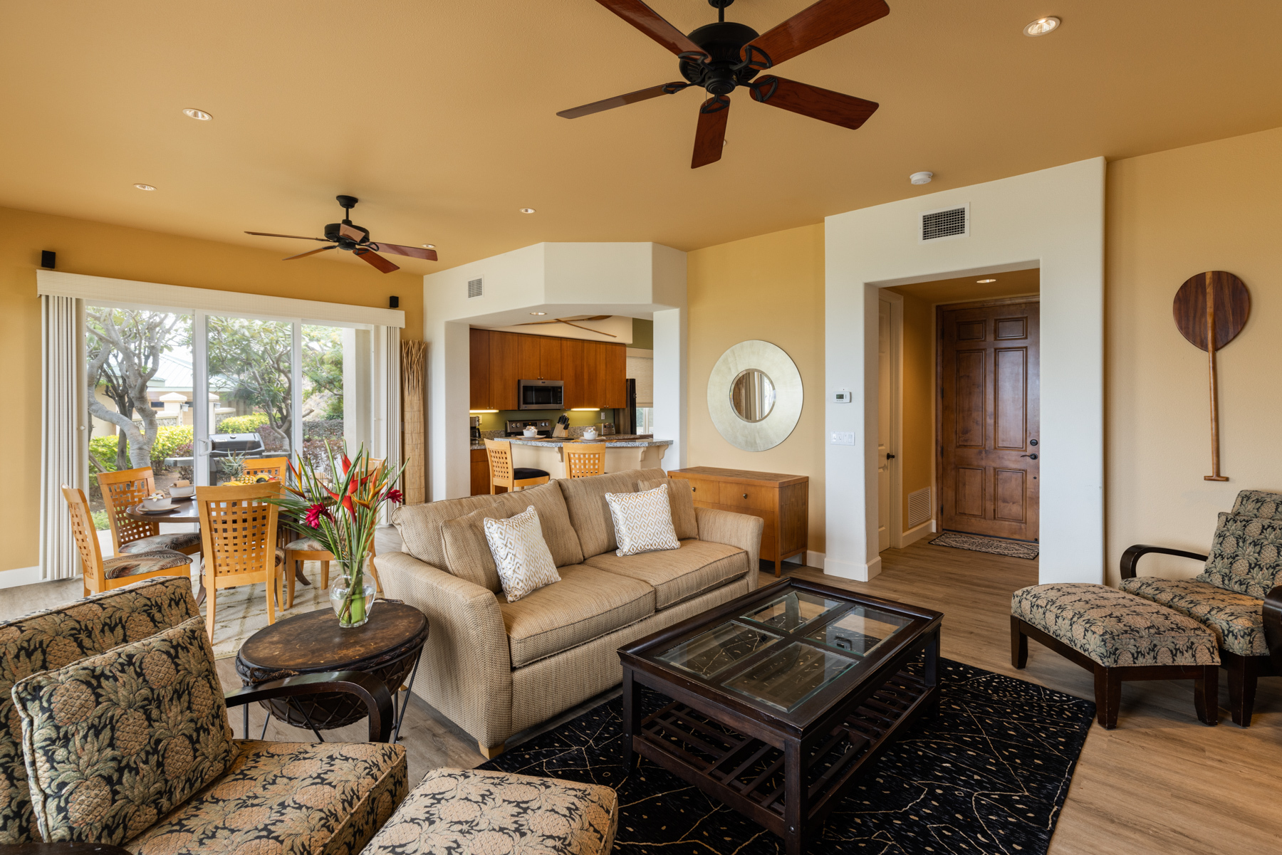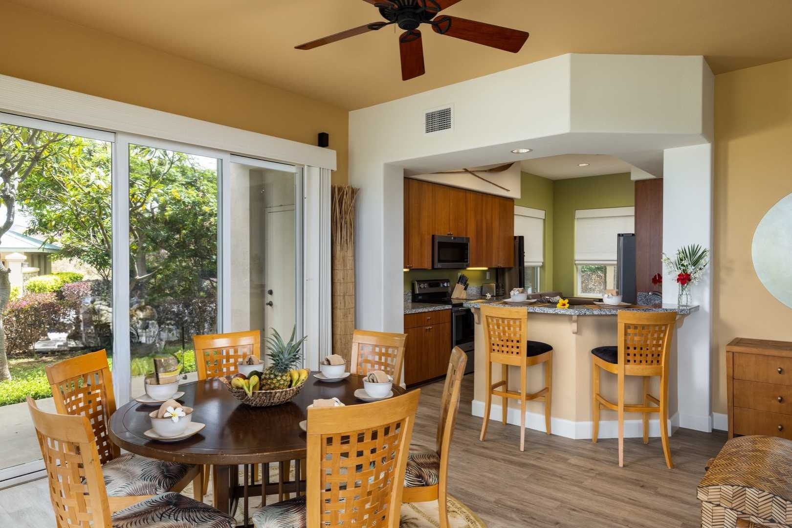Your tropical dream home awaits you at Kumulani I-1. A deluxe, ground-level, two-bedroom, two-bathroom condominium that features ocean, mountain, and lush tropical views. This elegant unit has a tasteful design with a spacious, open-concept floor plan ideal for the Hawaiian lifestyle. The covered wrap-around lanai situated upon a large open area, boasts commanding views toward the ocean, nightly sunsets and star-filled skies. For added comfort, enjoy central air-conditioning and ceiling fans throughout the unit. The convenience of the single-car garage, which includes 2 storage closets plus the additional outdoor parking, is an extra luxury. The Kumulani Pool Pavilion is steps away from your unit and features maintained amenities, including a lap pool, spa, lounges and much more. As an owner at Kumulani, residents and their guests have a rare opportunity to gain access to both the world-class Mauna Kea Beach Hotel and the Westin Hapuna Resort amenities by purchasing the Mauna Kea Club membership. Included with this are 2 premier golf courses, oceanside tennis and pickleball courts, beautiful pristine beaches, exquisite dining, luxurious spa facilities, multiple pools and two fitness centers. As a successful turnkey vacation rental, you have the ability to maximize your investment potential. Immerse yourself in the breathtaking beauty and serene ambiance that ownership of this slice of paradise has to offer at Kumulani I-1.