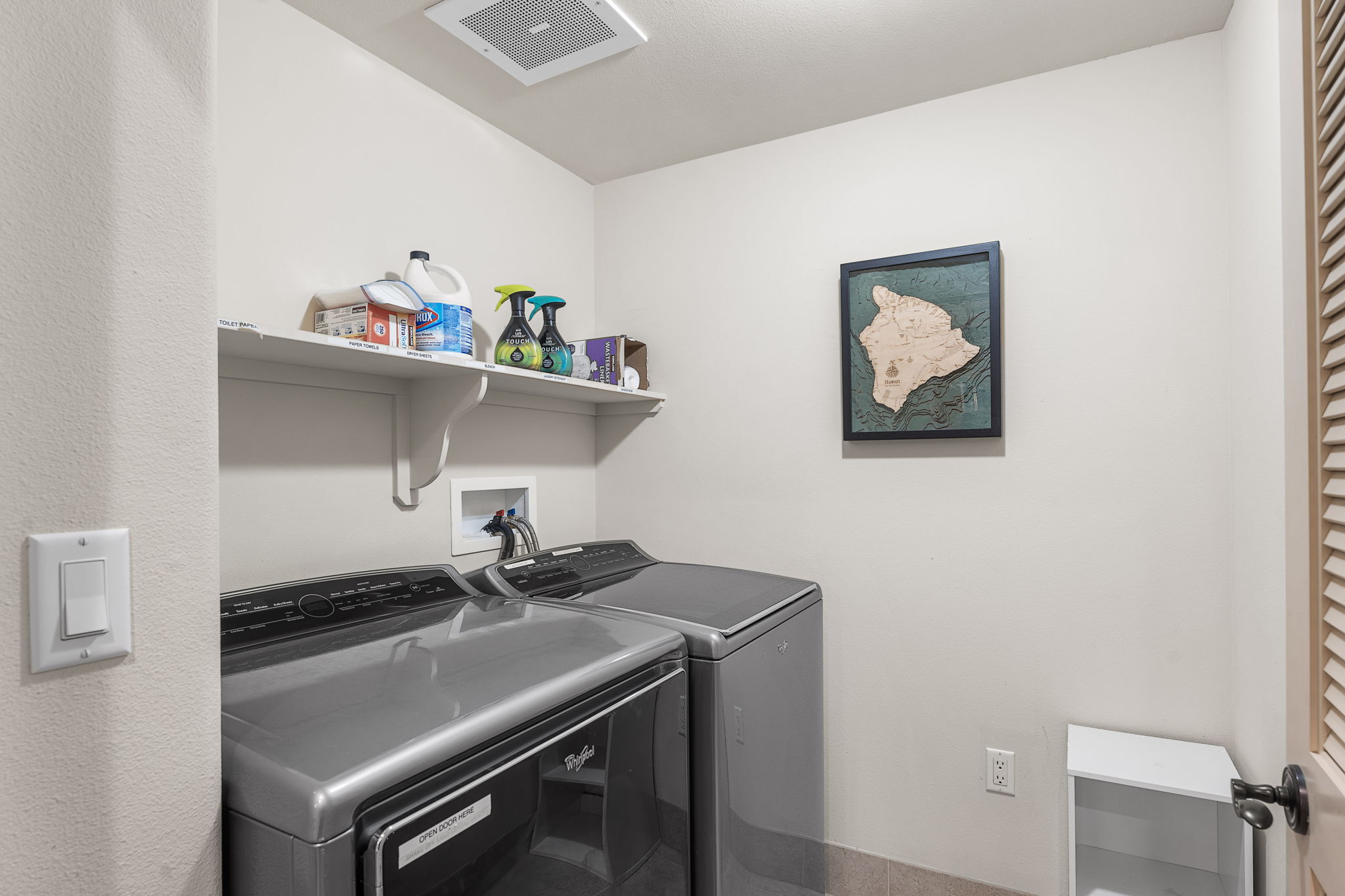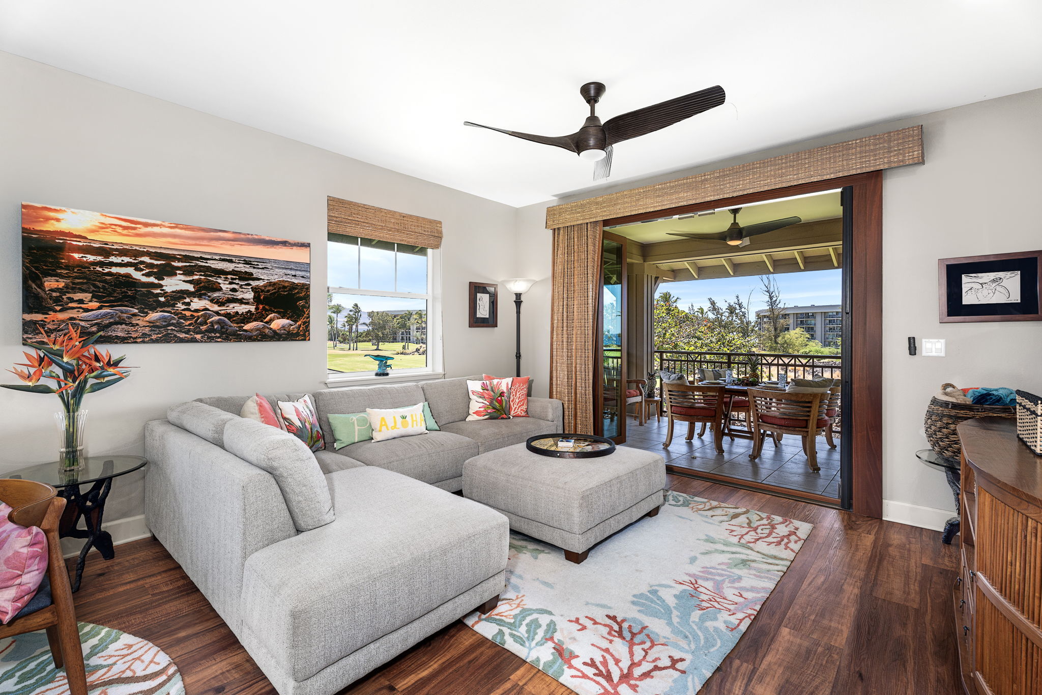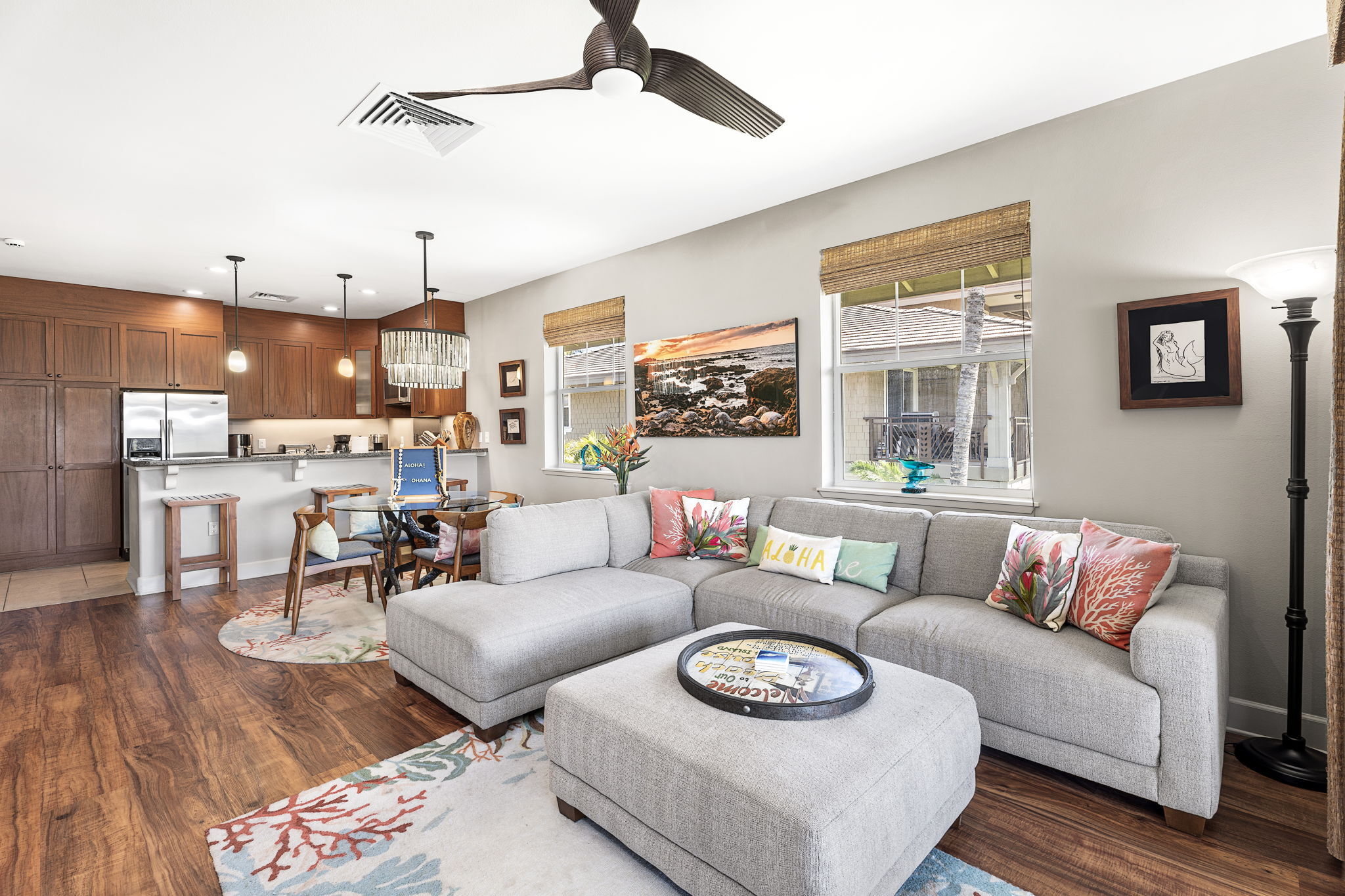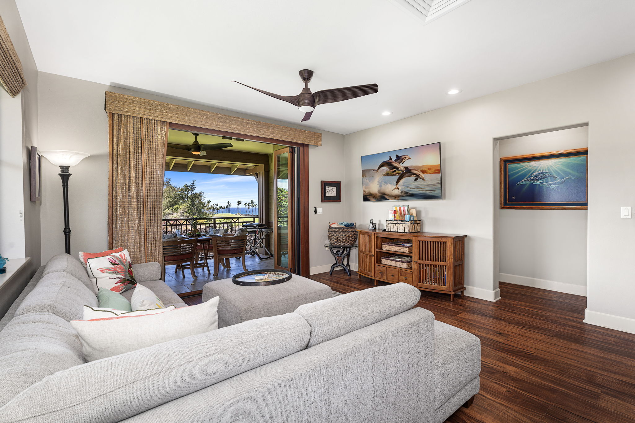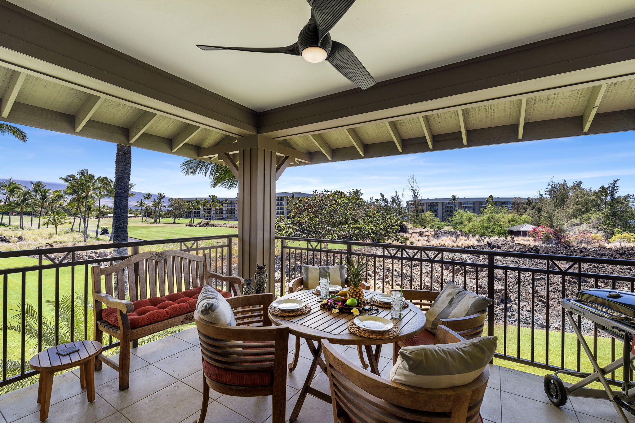 Stunning Ocean and Golf course views from this upscale 2-bedroom, 2-bath end unit at Hali’i Kai, an exclusive gated oceanfront community in Waikoloa Beach Resort. Centrally located within the complex, this spacious condo boasts the most desirable floor plan, offering unobstructed ocean and golf course views from the living room, lanai, and master bedroom, where you can enjoy breathtaking sunsets and seasonal whale activity. Large custom mahogany folding doors with full screens open to a covered lanai, seamlessly blending indoor comfort with outdoor tropical breezes, while African mahogany cabinets, granite countertops, stainless steel appliances, and extra end-unit windows provide elegance and abundant natural light. With no neighbors above, this tranquil retreat is just a short walk to the exclusive Oceanfront Beach Club, featuring a private restaurant, pool, spa, and fitness center, as well as nearby tennis and basketball courts. Conveniently located to Anaeho’omalu Bay for ocean sports, beachfront dining, shopping, and entertainment, this beautifully appointed condo is sold fully furnished, stocked with beach equipment/activity gear and an active Short Term Vacation Rental license, making it ideal for immediate occupancy, second home or rental income. A garage and separate deeded parking space add further convenience to this slice of paradise, perfect for a luxurious vacation home or investment property.