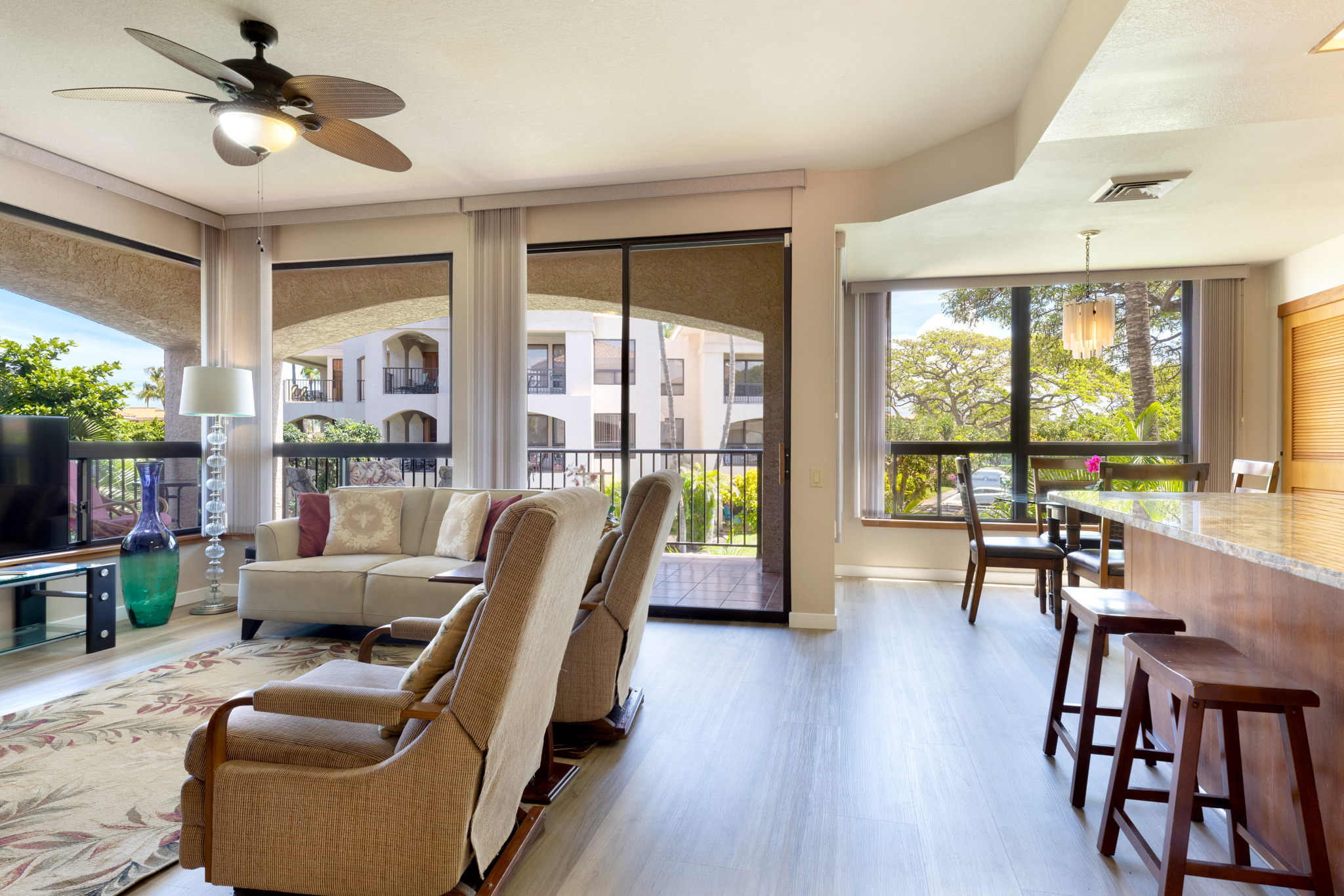 This spacious second-floor condo at The Shores at Waikoloa is a true island retreat. Large windows in the dining and living areas flood the home with natural light, gentle breezes, and stunning views. Enjoy privacy and security while sleeping with your windows and sliding glass doors open–an everyday luxury in this peaceful gated community.