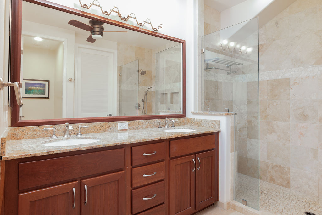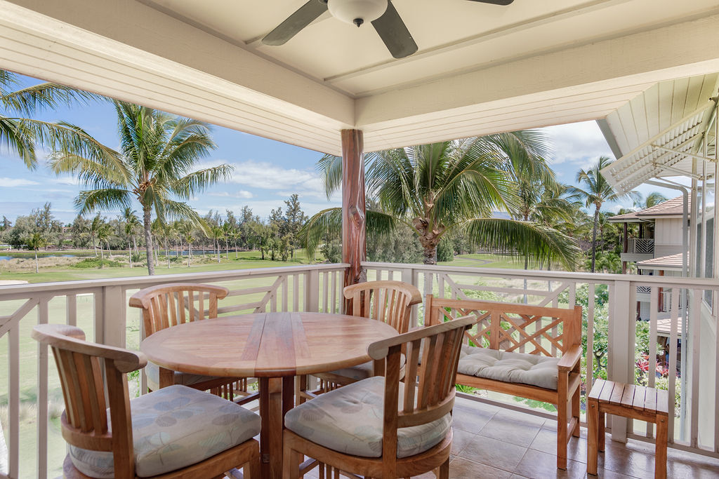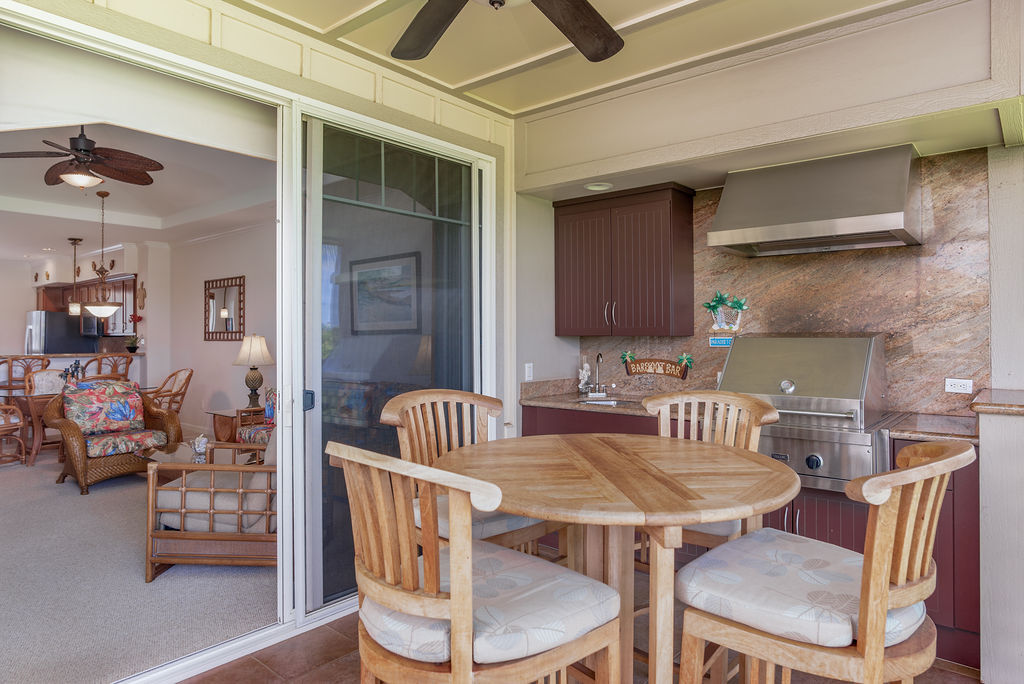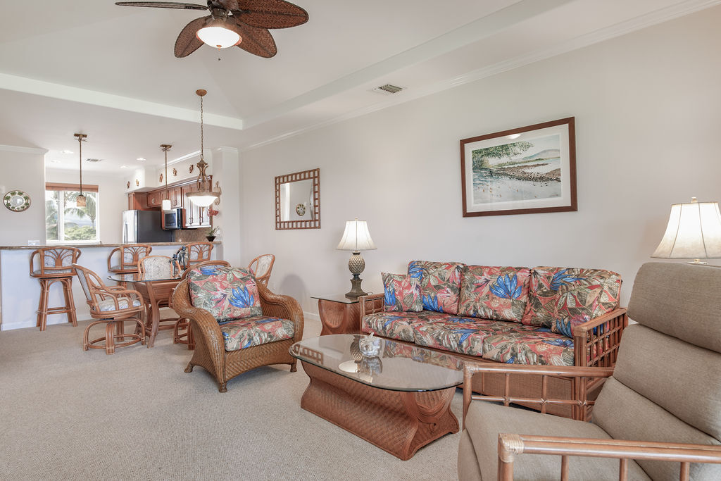 Penthouse Villa, L-33 is a spacious, 1209 SQFT, Turn-key townhome, with 2 bedrooms, 2 bathrooms, overlooking the 3rd hole on the Waikoloa Beach Golf Course. This penthouse Villa includes a private garage, and an additional parking spot. Keep your vehicle and toys locked in the garage and have your guests park in front of the garage. The kitchen has an open floor plan, lots of natural lighting, granite countertops, cherry finished cabinets, and stainless steel appliances. The Primary suite offers vaulted ceilings, remodeled master bathroom with an extra large walk in shower, dual vanities and a walk in closet. On the lanai, enjoy your built in Viking Grill/kitchen with prestigious golf course views with tropical landscape.