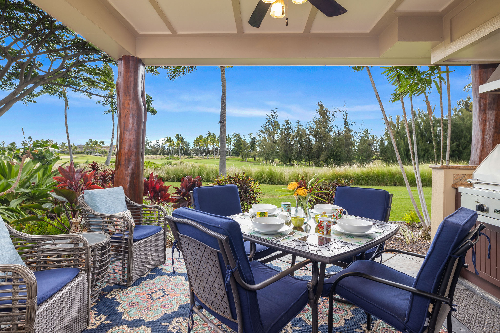 Lanai with built-in Viking BBQ and wet bar — perfect for sunset dinners overlooking the golf course.
