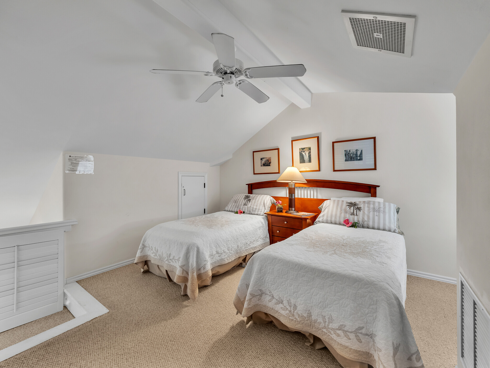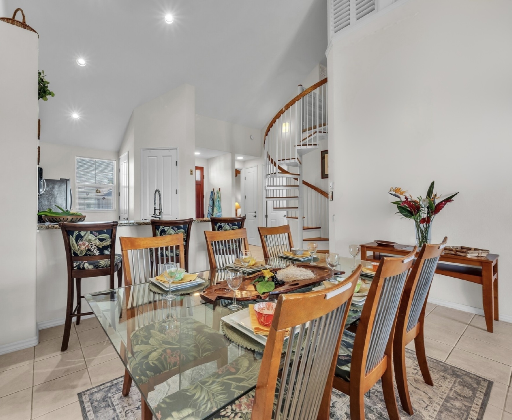 Located within Waikoloa Beach Resort in South Kohala–home to sandy beaches and world-class resorts–Fairway Villas N-32 is a top-floor (elevator served) 2-bed/2-bath + loft that lives calm and easy. Overlooking The Lakes Nine ~ 4th fairway ~ Evenings bring a show: the pond shimmers with the Kings’ Shops lights, and the western exposure catches the sunset colors. The popular 1,237 sf plan flows from an open great room to a covered lanai. The kitchen includes granite counters, bar seating and a roomy pantry. Enjoy a main level primary suite and guest bedroom / bathroom, as well as a spiral stair to a flexible loft for guests, office, or media. The primary suite, beautifully updated, has a spa like walk-in tile shower and a separate owner closet for easy personal storage. Includes a one car garage!