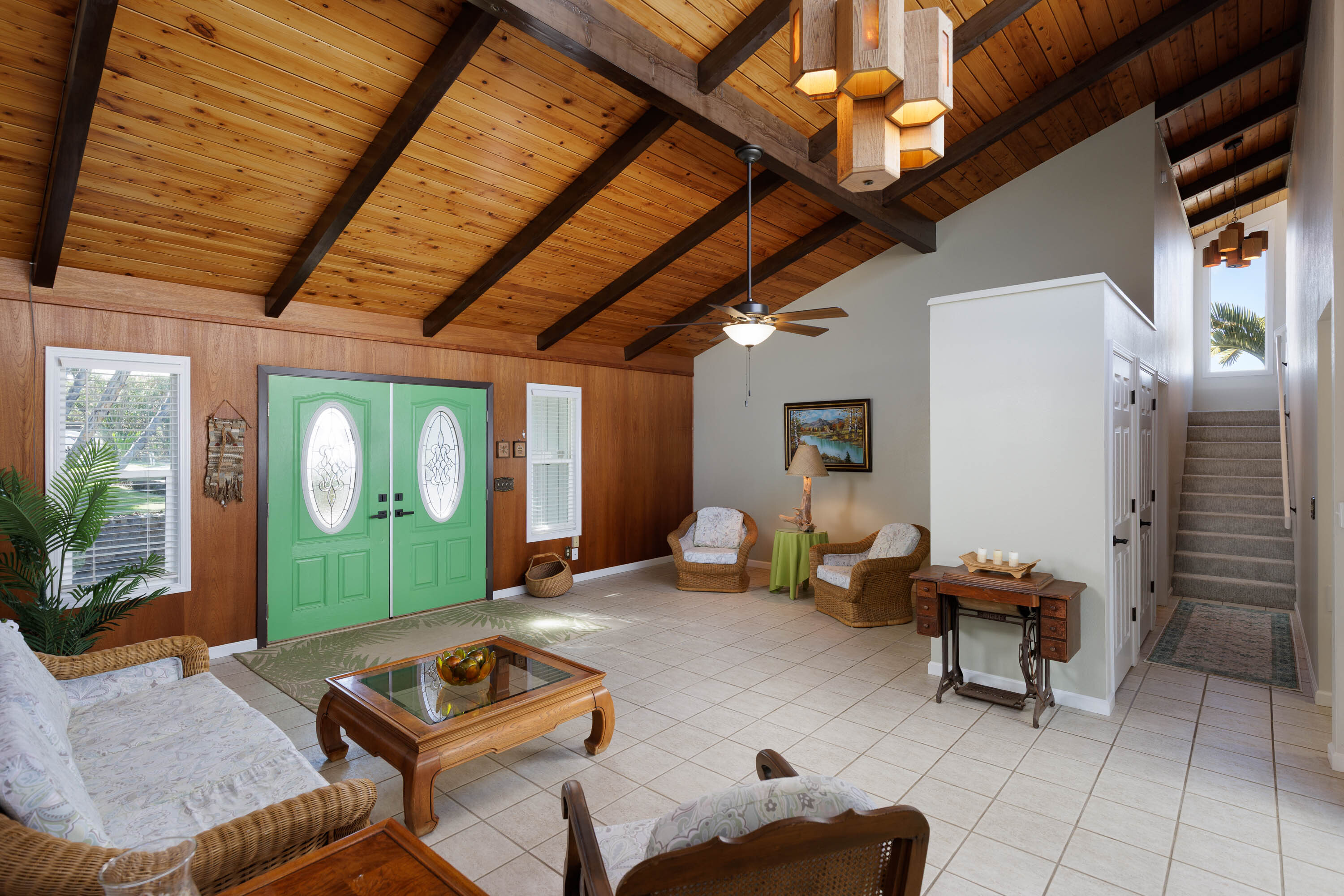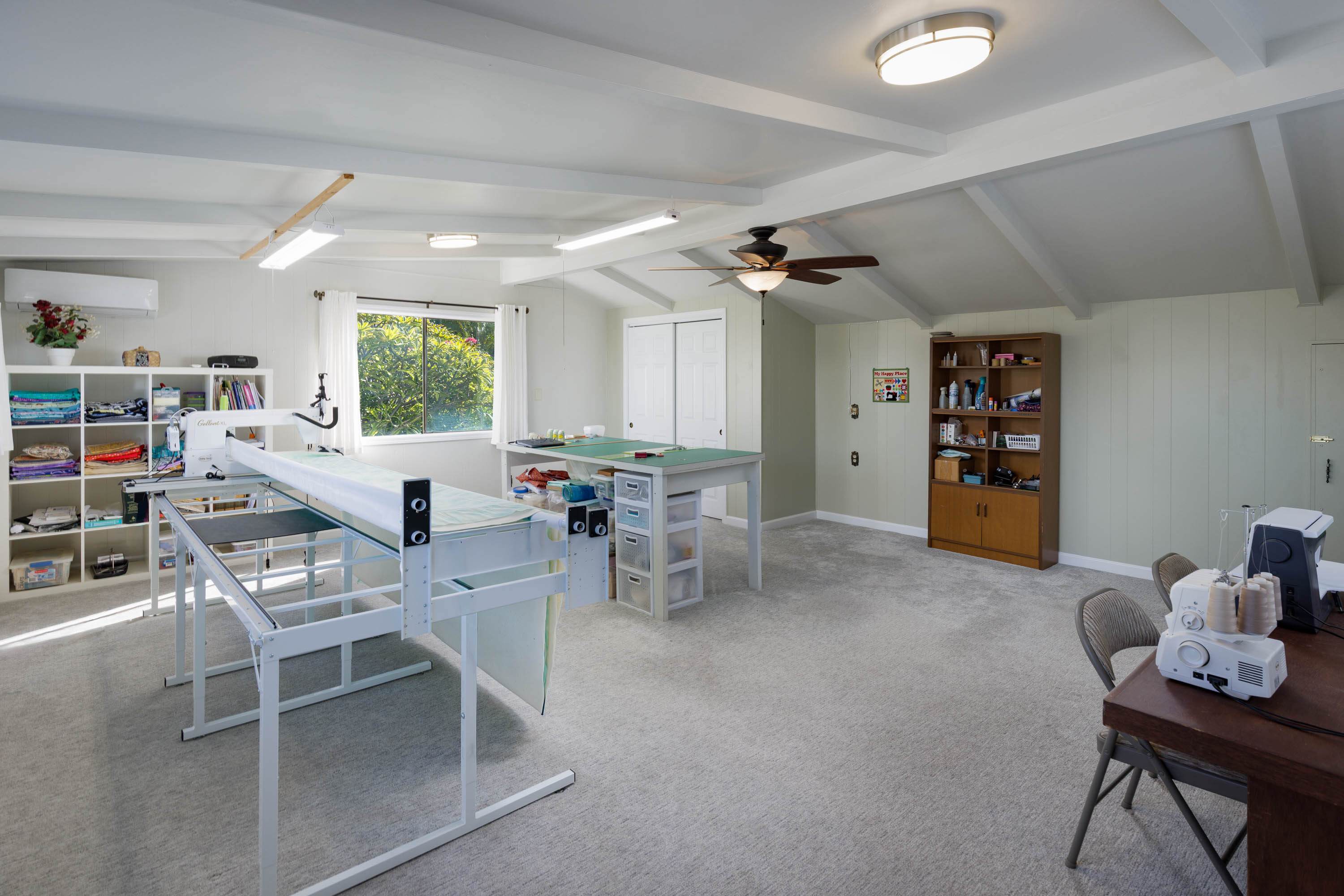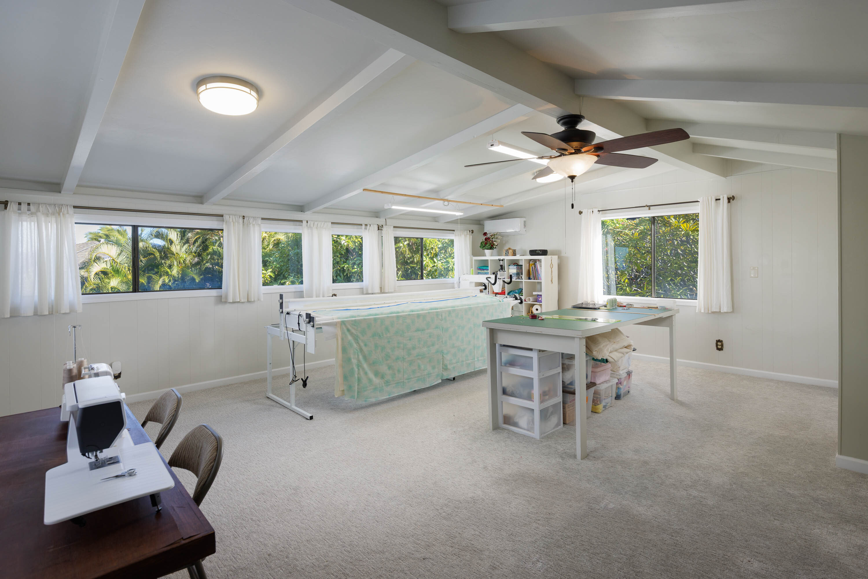 Upstairs, an extra room, currently a craft room, offers flexible use as a home office, studio, classroom, or guest space. An additional upstairs suite with its own small lanai creates a private retreat.