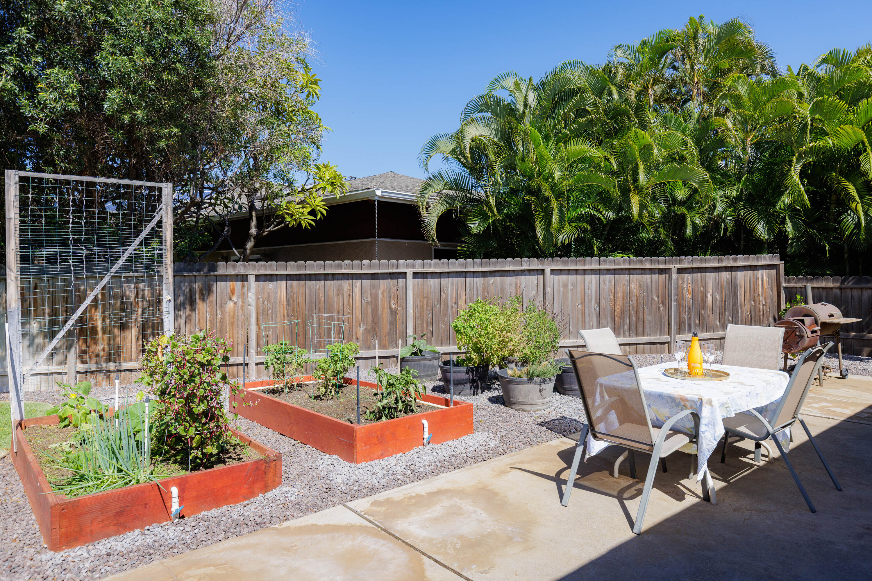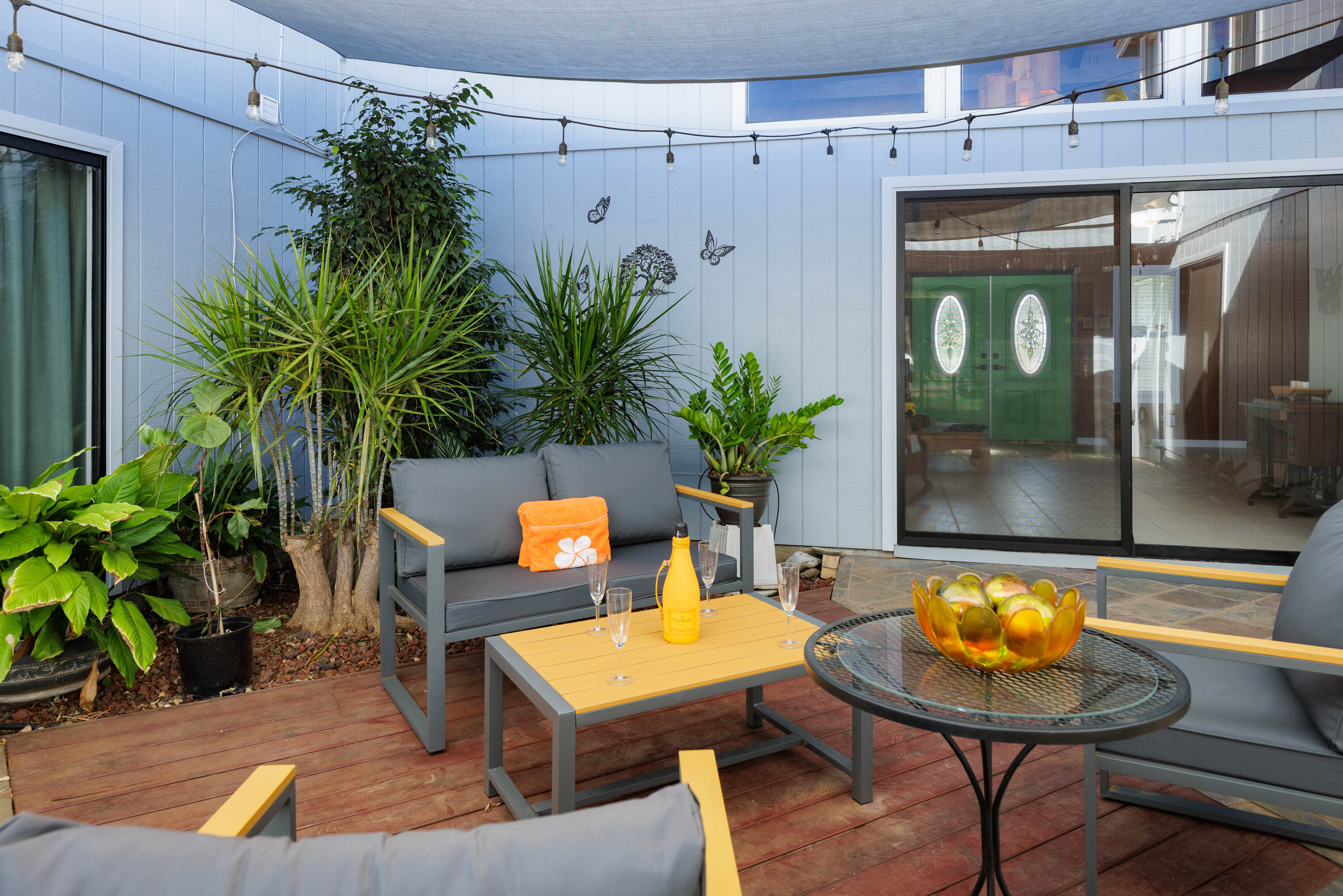 The atrium-style lanai provides a relaxing outdoor living area with a shade sail that softens the sunlight and string lights that add evening ambiance, an ideal spot for morning coffee or unwinding at the end of the day. The backyard is perfect for BBQs and outdoor dining, while the front yard welcomes you with a stunning Royal Poinciana and manicured landscaping.