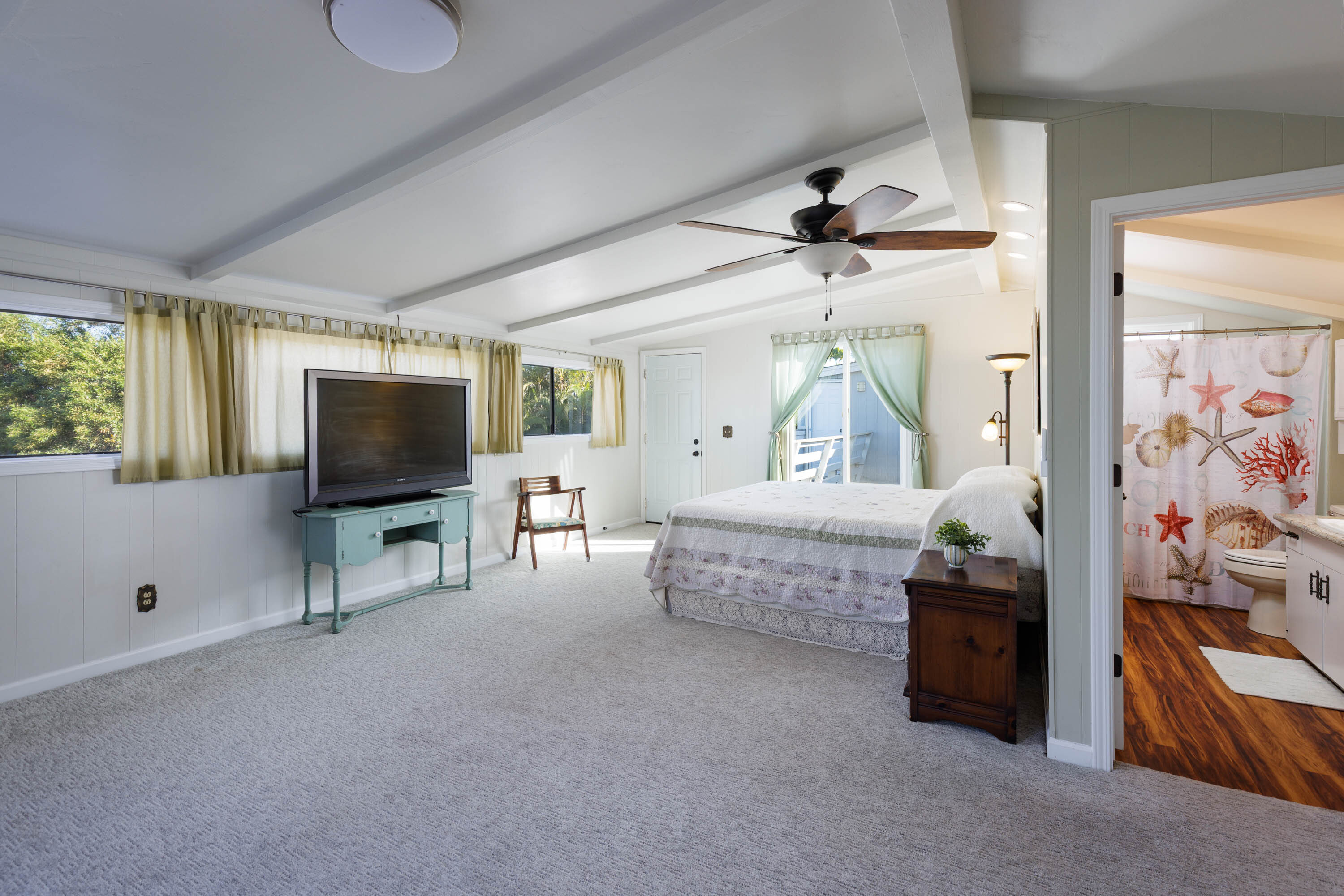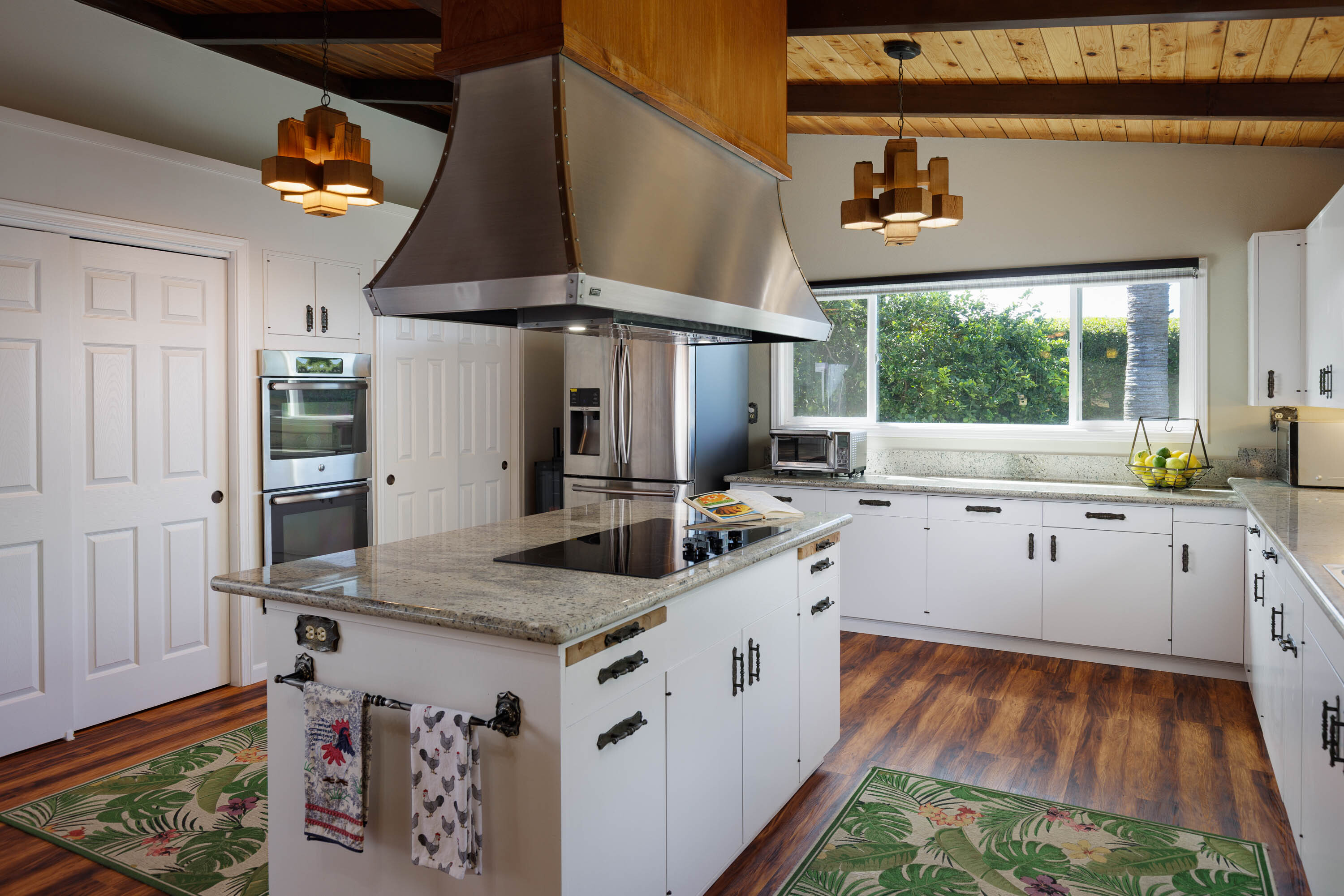 The renovated kitchen is a standout, featuring granite counters, a large white island, stainless steel appliances, a built-in cooktop, and charming exposed wood beams. It’s a fun, functional space perfect for cooking for a crowd or hosting lively get-togethers. The dining and living areas are warm and open, highlighted by a striking wooden ceiling, Curly Koa Pergo floors, and a long row of windows framing lush greenery outside.