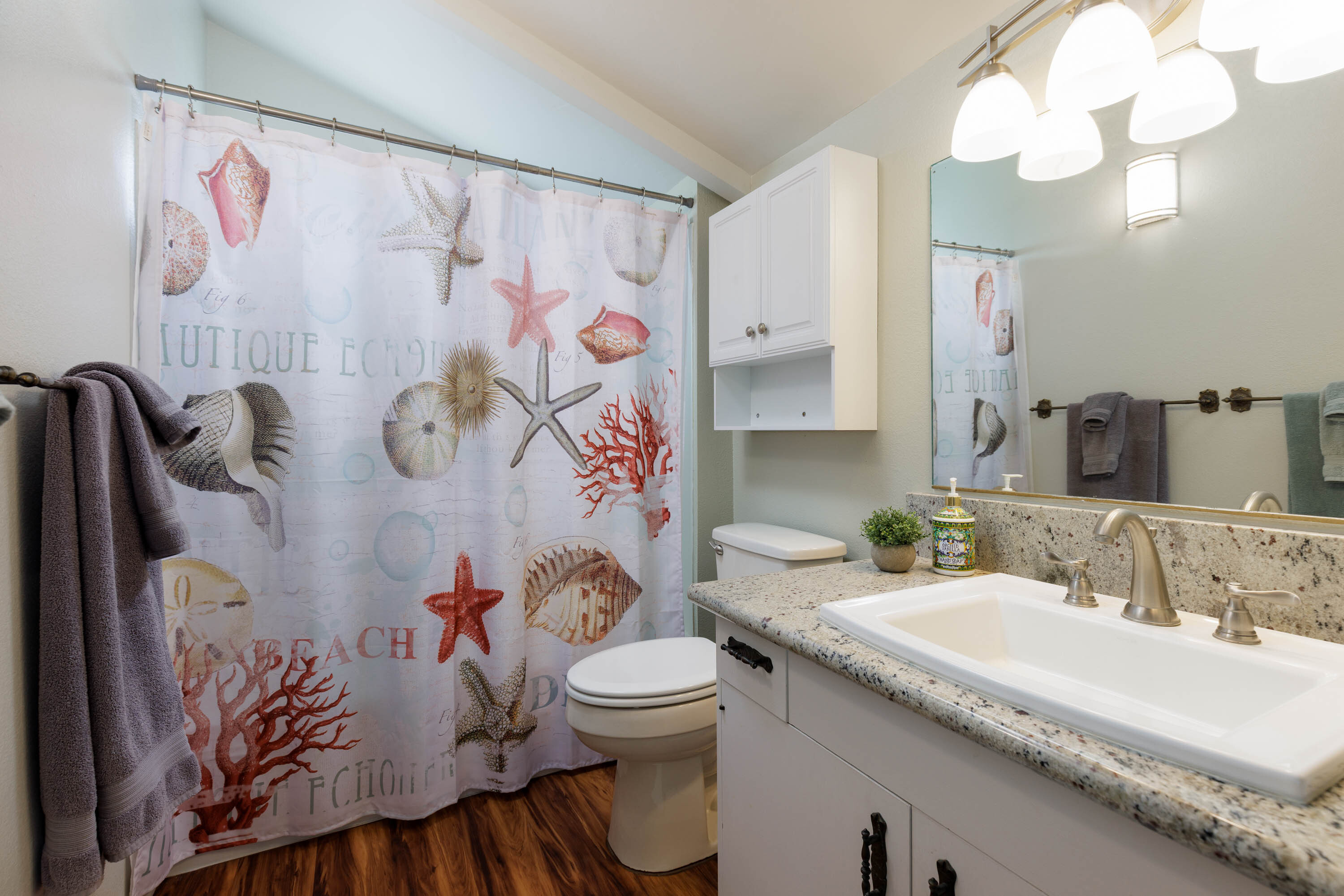 The main level hosts the primary bedroom and bath, plus two additional guest bedrooms and 2 full baths. The primary suite feels serene and spa-like with a freestanding soaking tub, dual-sink vanity, and tiled walk-in shower.