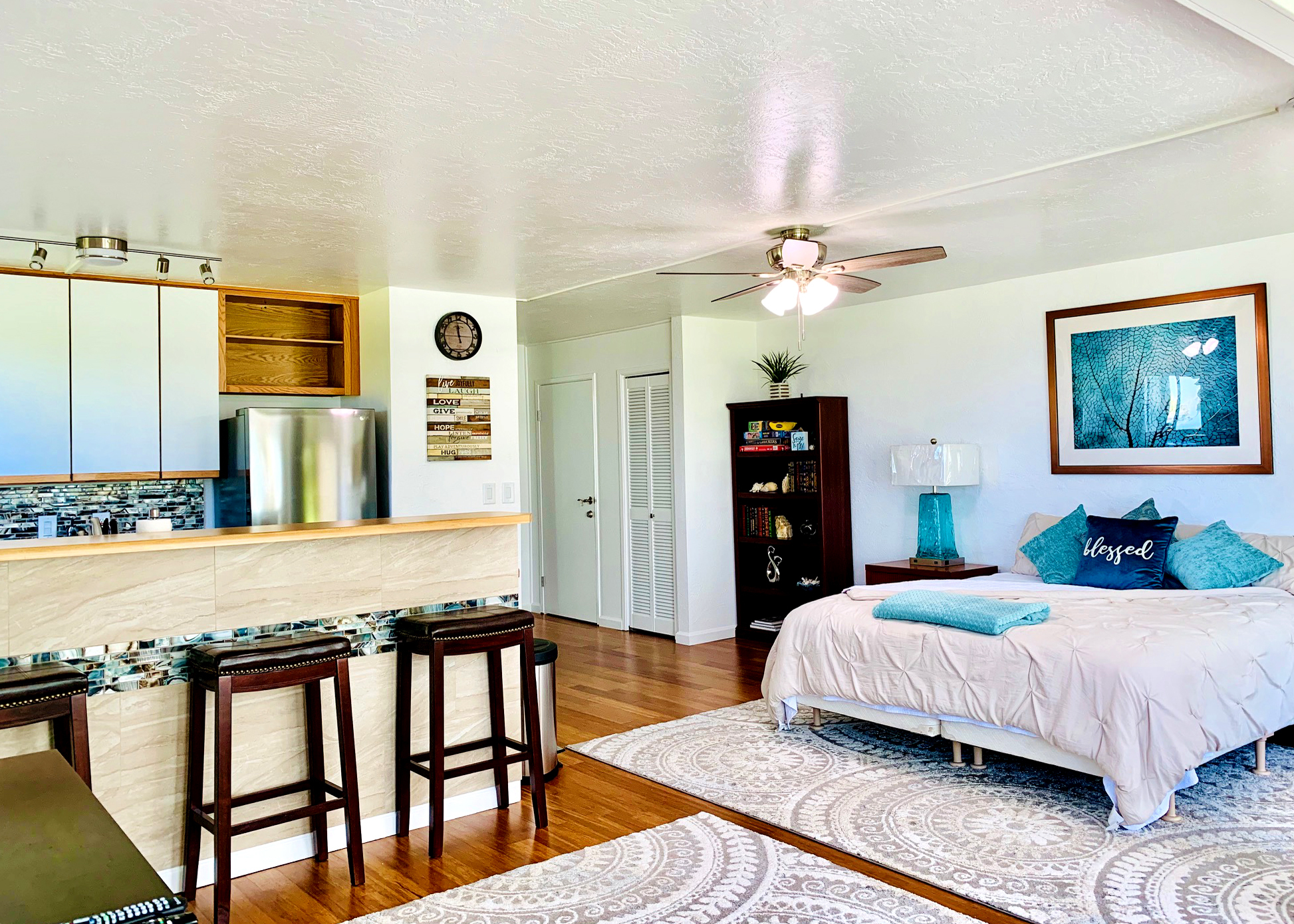 Discover a rare opportunity to own a stunning studio with unrivaled golf course frontage in Waikoloa Village. This private corner unit offers spectacular, unobstructed panoramic views sweeping across the emerald fairways, the blue Pacific Ocean, and the majestic island mountains. Wake up to Hawaiian beauty and enjoy serene sunsets. Experience the best of Waikoloa Village living! Ideal for a personal retreat or a high-value rental property.