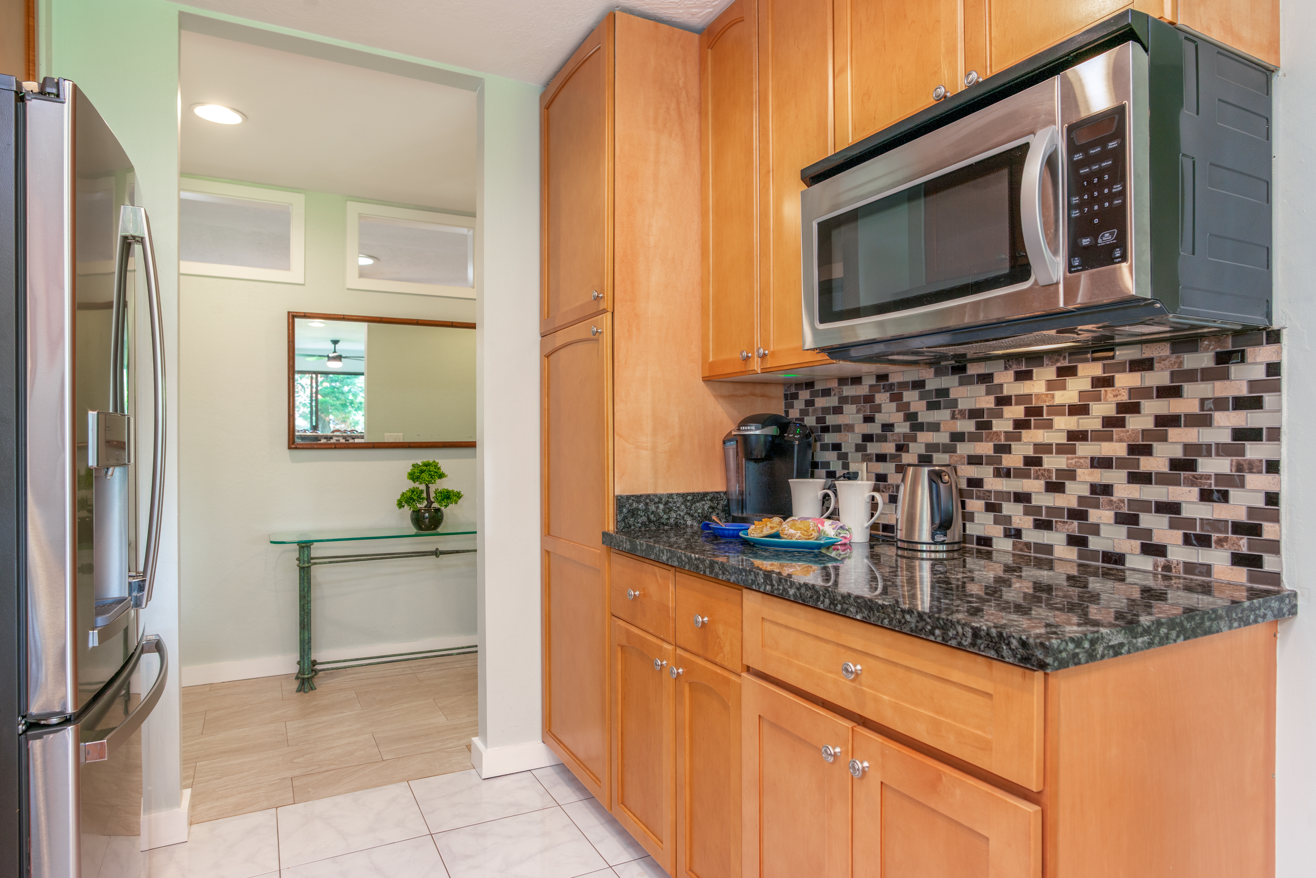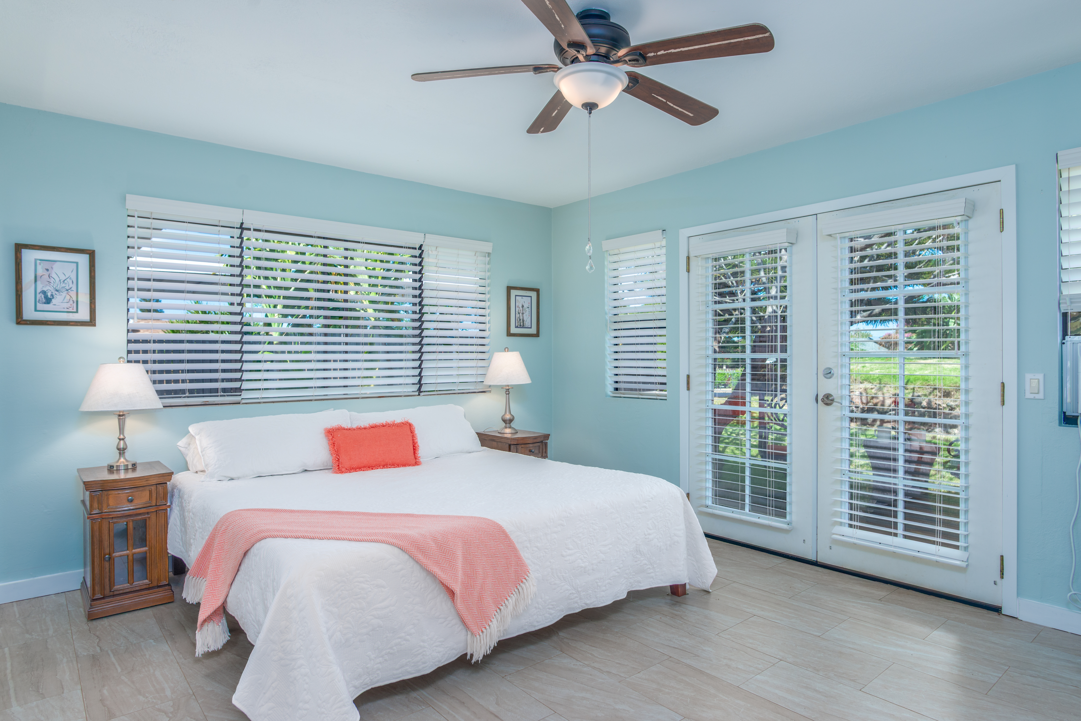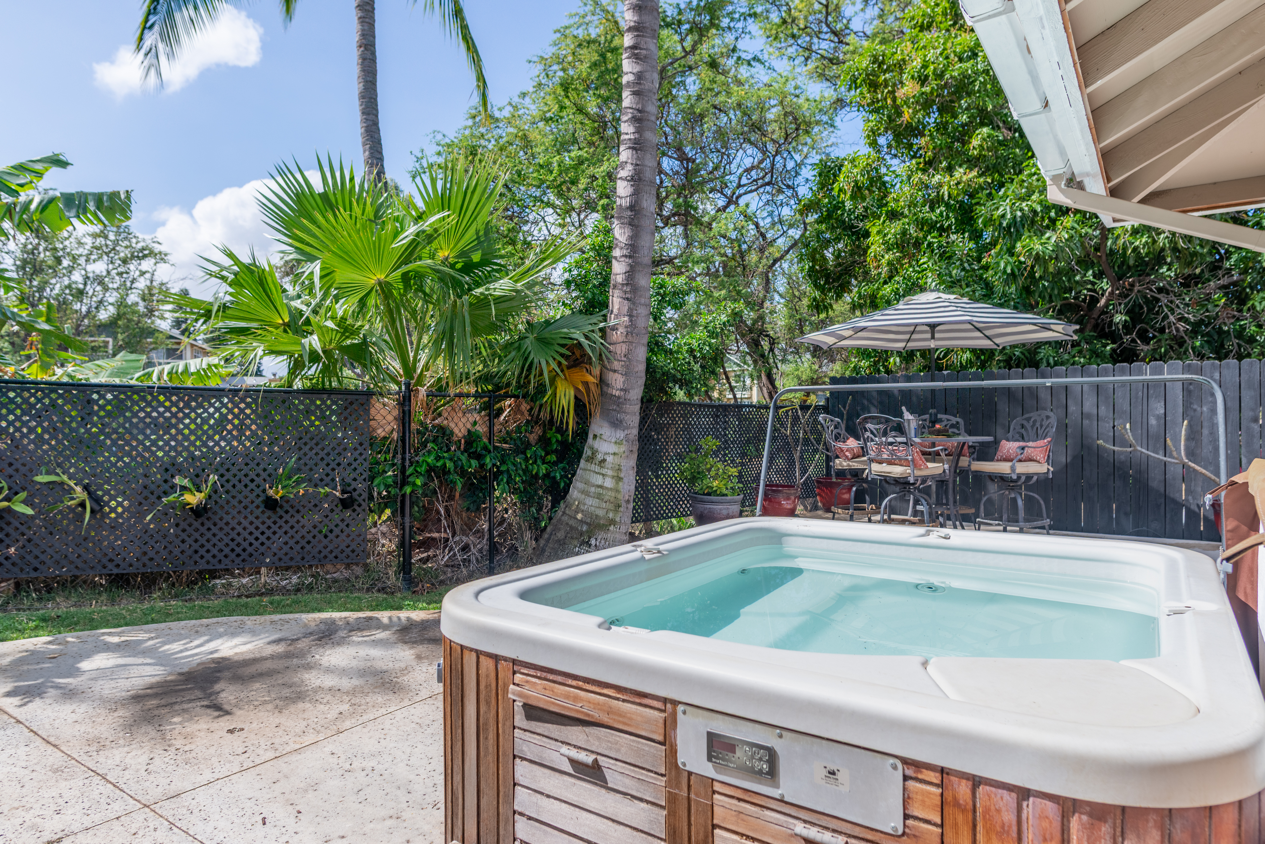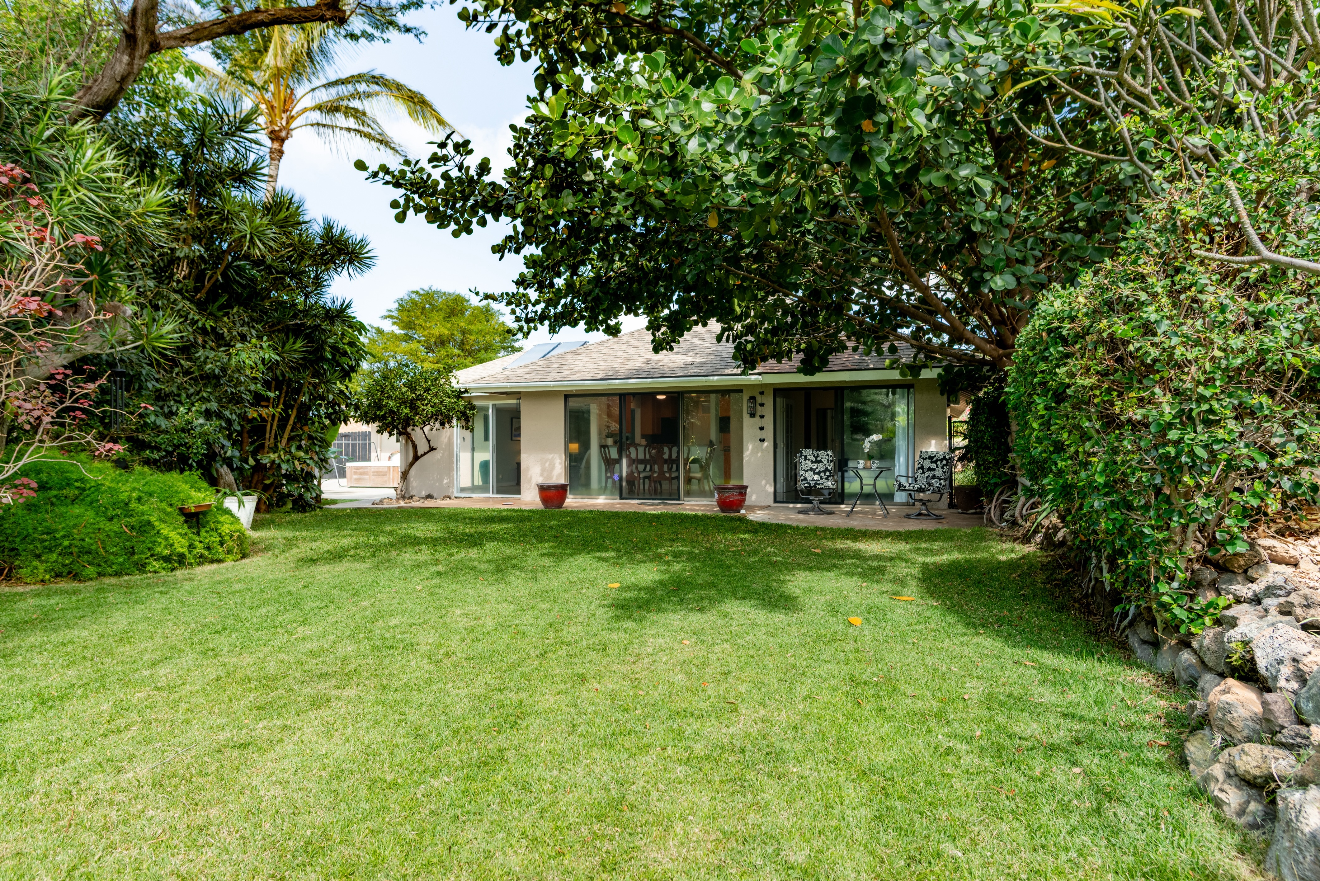 Designed for ultimate flexibility and comfort, the home features a highly sought-after layout with 2 Primary Bedrooms and 3 Full Baths. It is uniquely outfitted for accessibility and multi-generational living, offering mostly 36” wide doorways, a minimal 2” step-up, and a rear primary suite equipped with a large walk-in shower and a wheelchair-accessible closet. The heart of the home features pristine tile floors throughout, interior doors and baseboards freshly painted, and a wonderfully equipped kitchen. You'll love the recent stainless steel appliances and lower cabinets thoughtfully upgraded with pull-out shelves for easily accessible storage. Outdoor Living & Major Upgrades: Private Backyard Oasis: Fully fenced yard which is great for your furry companions and there are expansive concrete patios and a relaxing hot tub (featuring brand-new electronics and a new pump). Homegrown Tropical Fruit: The mature landscaping doesn't just offer privacy–it provides your own personal island harvest with dragonfruit, papaya, bananas, and lemons growing right on the property. Energy Efficiency: Leased solar system with highly affordable $150/mo payments (payoff option available to buyers at closing!). Every bedroom also features its own dedicated wall mounted AC unit. Peace of Mind Updates: 2015 solar installation 2025 new water heater 2025 updated sprinkler system valves Are you looking for serene outdoor living, accessible design, or the perfect multi-generational layout? This home delivers on every front.