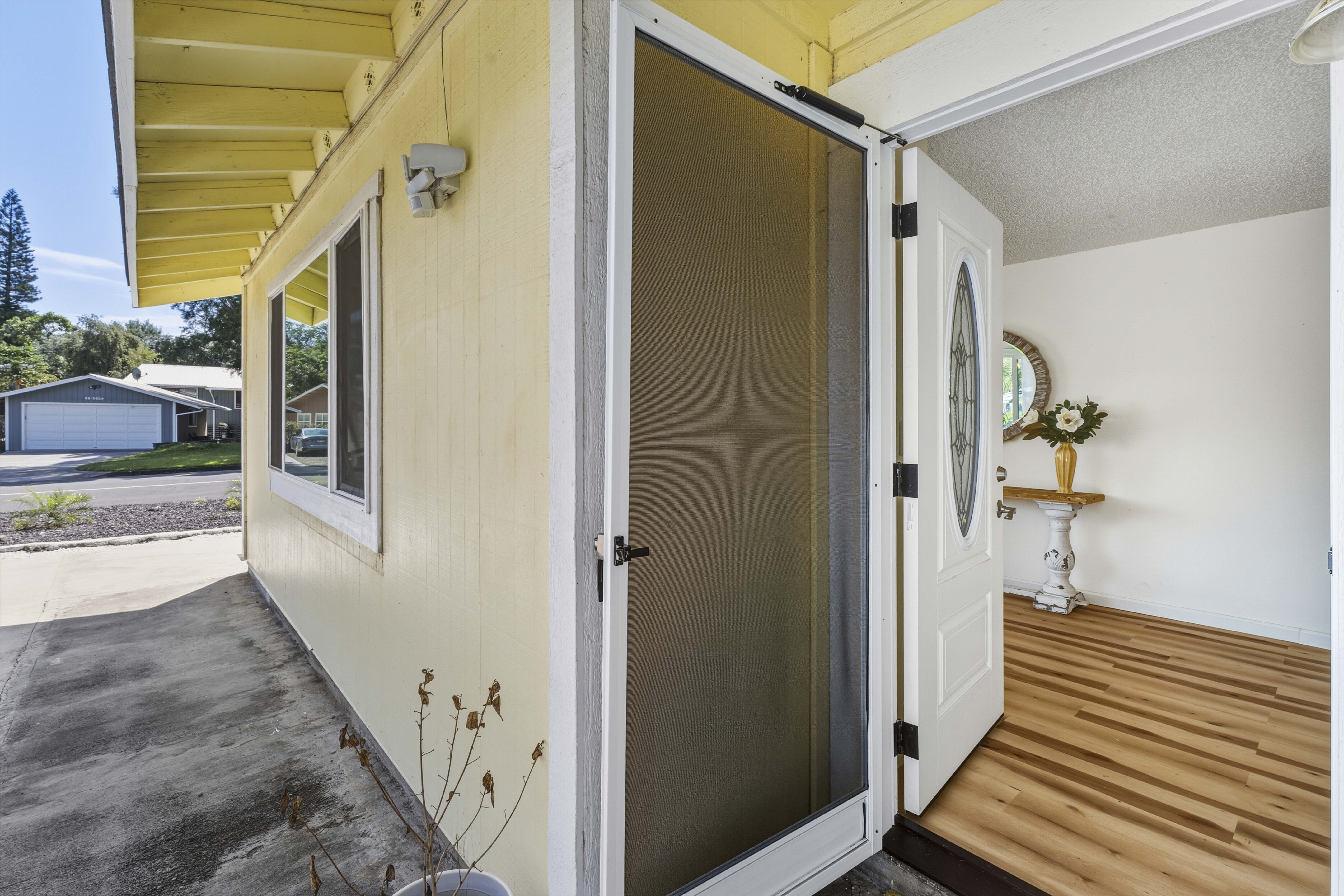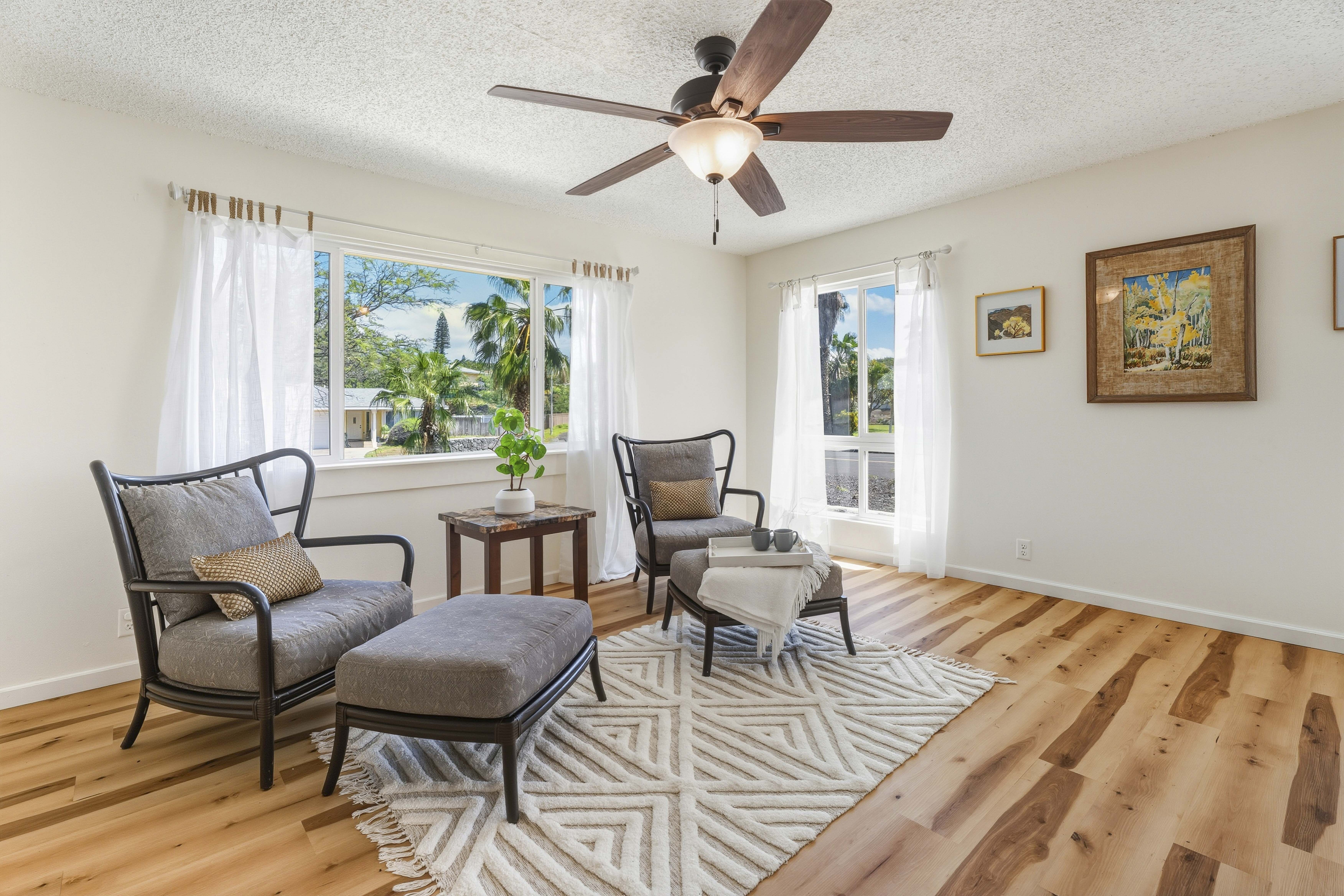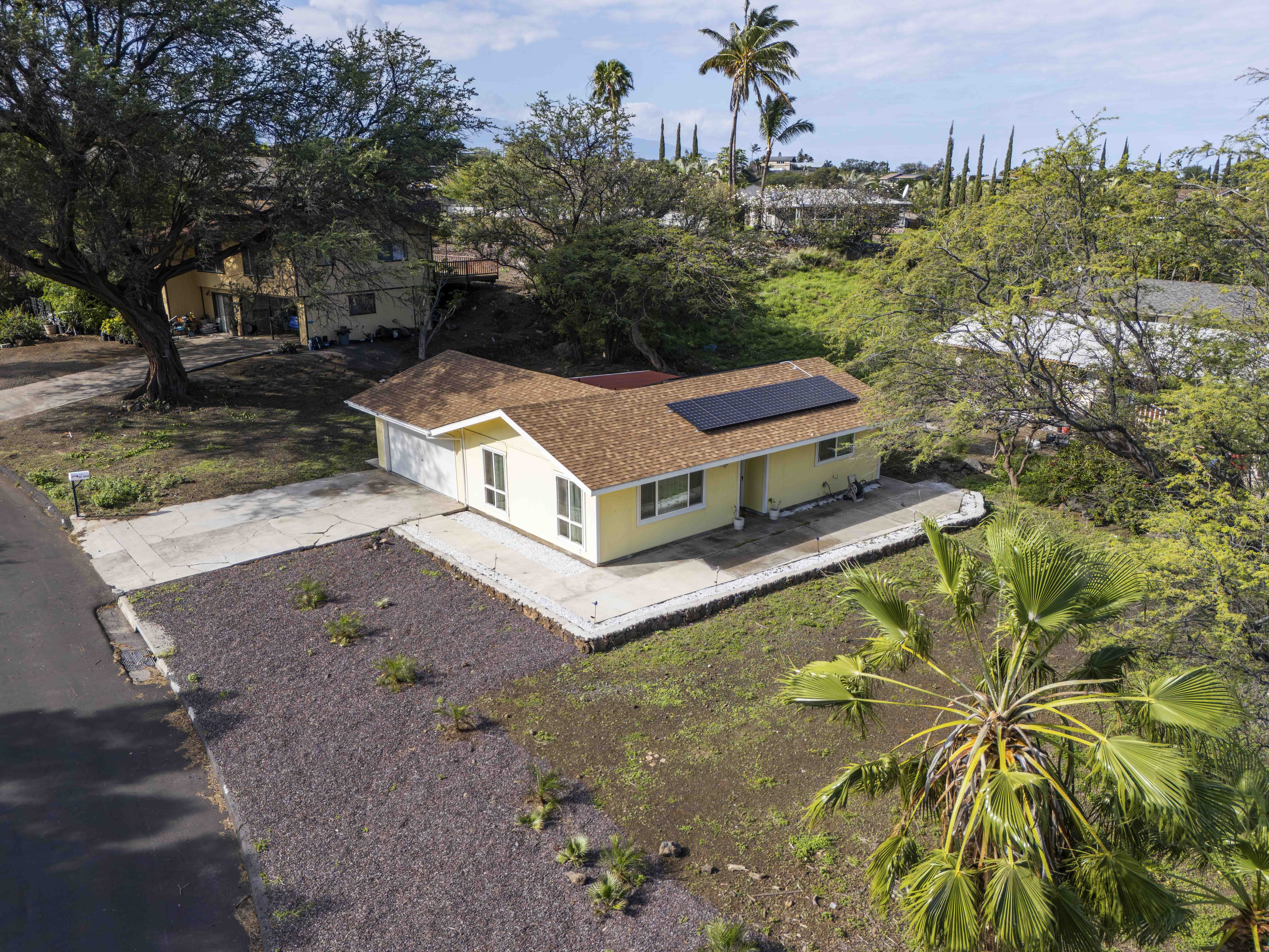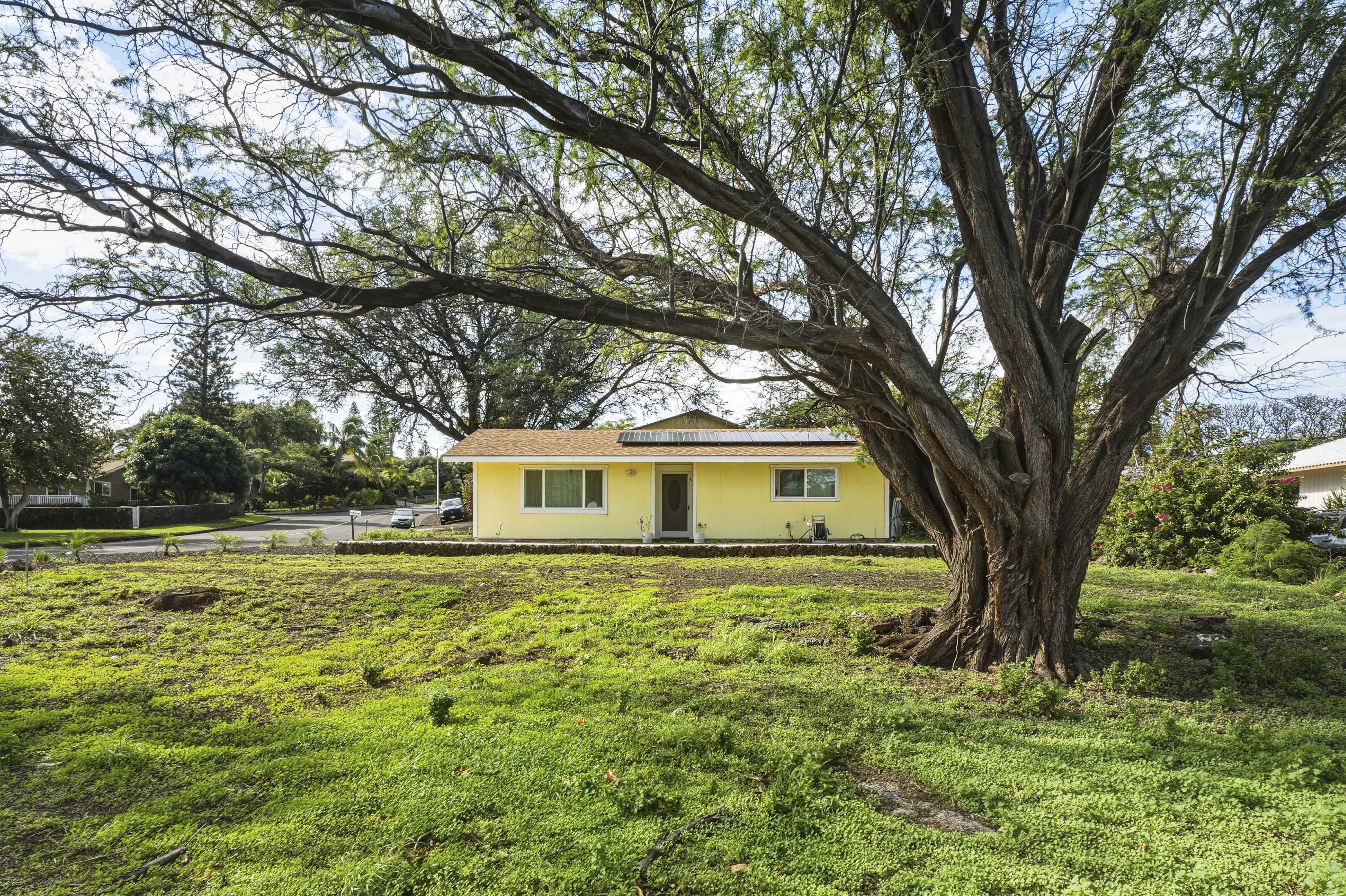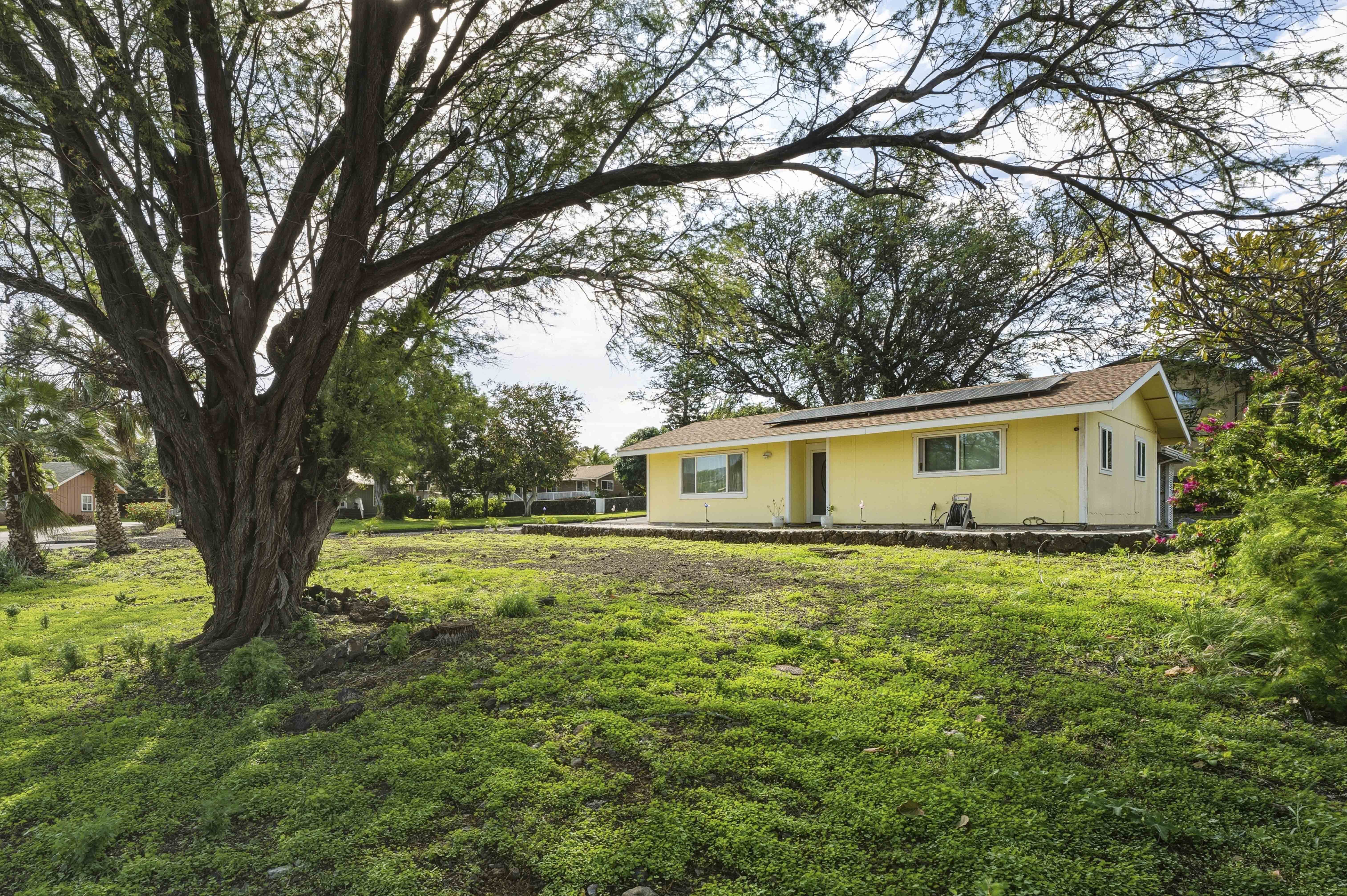 Welcome to your private island retreat in Waikoloa Village–a beautifully upgraded home that blends modern comfort with relaxed Big Island living. Perfectly positioned on a spacious corner lot, this charming and whimsical 2-bedroom, 1-bath residence offers both seclusion and exceptional potential for expansion. Step inside to discover a thoughtfully renovated interior featuring new flooring throughout the home, fresh paint, and updated finishes that create a bright, cohesive, and inviting space. The cozy galley kitchen shines with new lower cabinetry, stylish laminate countertops, and updated ceramic tile accents, while the refreshed bathroom complements the home’s modern upgrades. The living area is enhanced by double-pane windows, filling the space with natural light while improving energy efficiency. Outside, enjoy the best of indoor-outdoor island living. A covered back lanai provides the perfect setting for entertaining or unwinding, while concrete walkways wrap the home for added convenience. The oversized lot offers endless possibilities–whether you envision lush landscaping, an extension, or additional outdoor living spaces. A large garage with ample storage completes the package. This home also includes 14 leased PV solar panels with a backup battery system (installed in 2019 through Sunrun), helping you enjoy sustainable living and energy savings. As part of the Waikoloa Village Association, residents benefit from access to a community pool, tennis courts, and discounted golf at the renowned Waikoloa Village Golf Course. With close proximity to the Kohala Coast’s world-class beaches, resorts, and dining, you’ll experience the very best of island life–all from the sunny side of the Big Island. Ideal as a starter home, vacation getaway, or investment opportunity.