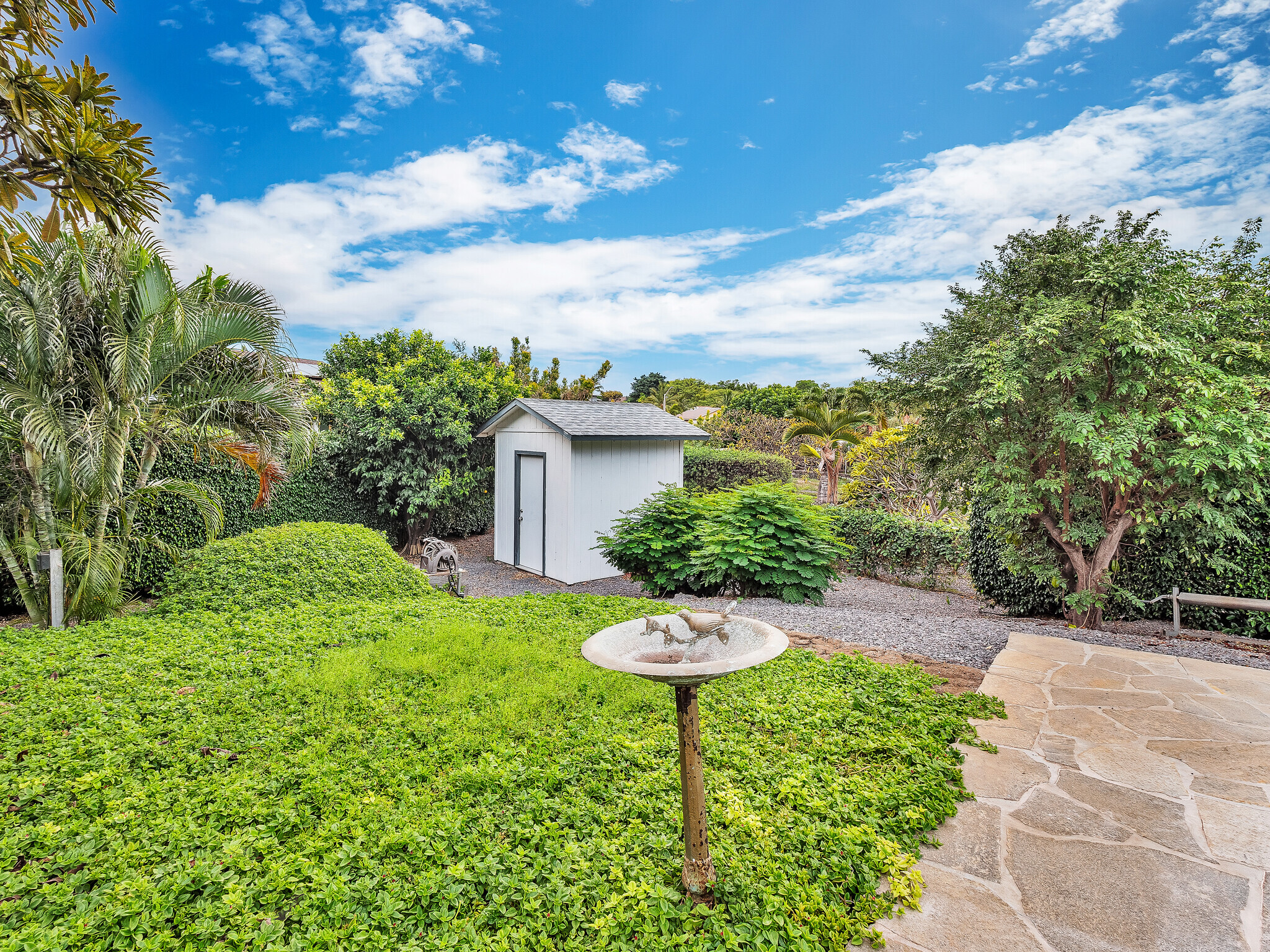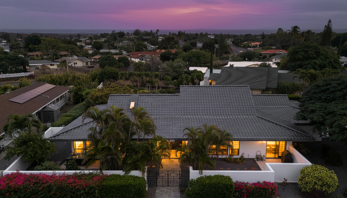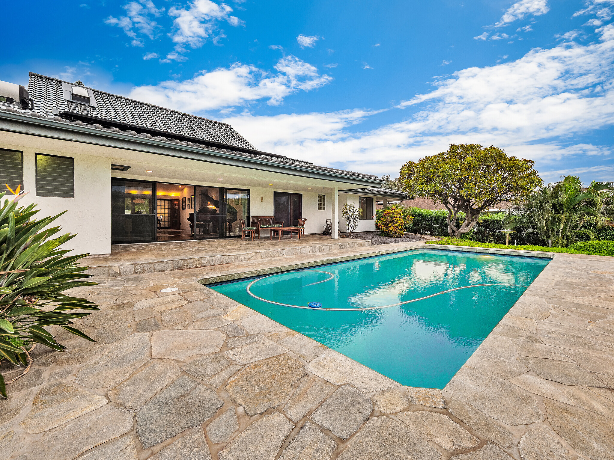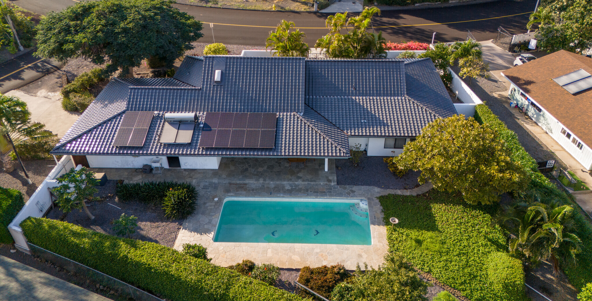 The gorgeous Shinto tile roof imported from Japan, the surrounding masonry wall, and the outstanding landscaping all make this large, impressive residence stand out immediately upon arrival. Enter the sunlit quartzite paved walkway by way of a wrought iron gate flanked by massive Areca palm trees, through the lovely double front doors into the foyer. The elegant great room to the right has teak floors, a built-in glass hutch, a built-in bar, and boasts a high ceiling and a wall of windows that open to the in-ground swimming pool. The gardens are surrounded by fencing hidden by high manicured hedges for complete privacy and security. The quartzite lanai is covered and there are 16 owned solar/photovoltaic panels on the roof as well. As I mentiond, the landscaping is truly outstanding. There is a huge Poinsettia tree and papaya, lemon, starfruit, tangerine, and orange trees to enjoy. An attractive pool shack sits off to the left. The tastefully upgraded gourmet kitchen has high-grade appliances, Italian tile laminate flooring, and counter seating to keep the cook entertained. There is a comfortable built-in kitchen desk with its own cabinets, and a gas stove with stylish finishes. There is also a half bath off the kitchen area. A few oriental touches throughout the home seem to contribute to a feeling of zen and relaxation. The three bedrooms and the remaining two baths are all extremely upgraded and comfortable. Let us not forget an important feature; The master bedroom doors open up to a private patio with a bubbling hot tub. The oversized garage has an abundance of storage on both sides and a private office off to the left. There is a central vacuum and a ventilated fan in the hallway ceiling that can draw any hot air from the home in minutes. This home is truly impeccable, and you will fall in love with its serenity as soon as you enter.