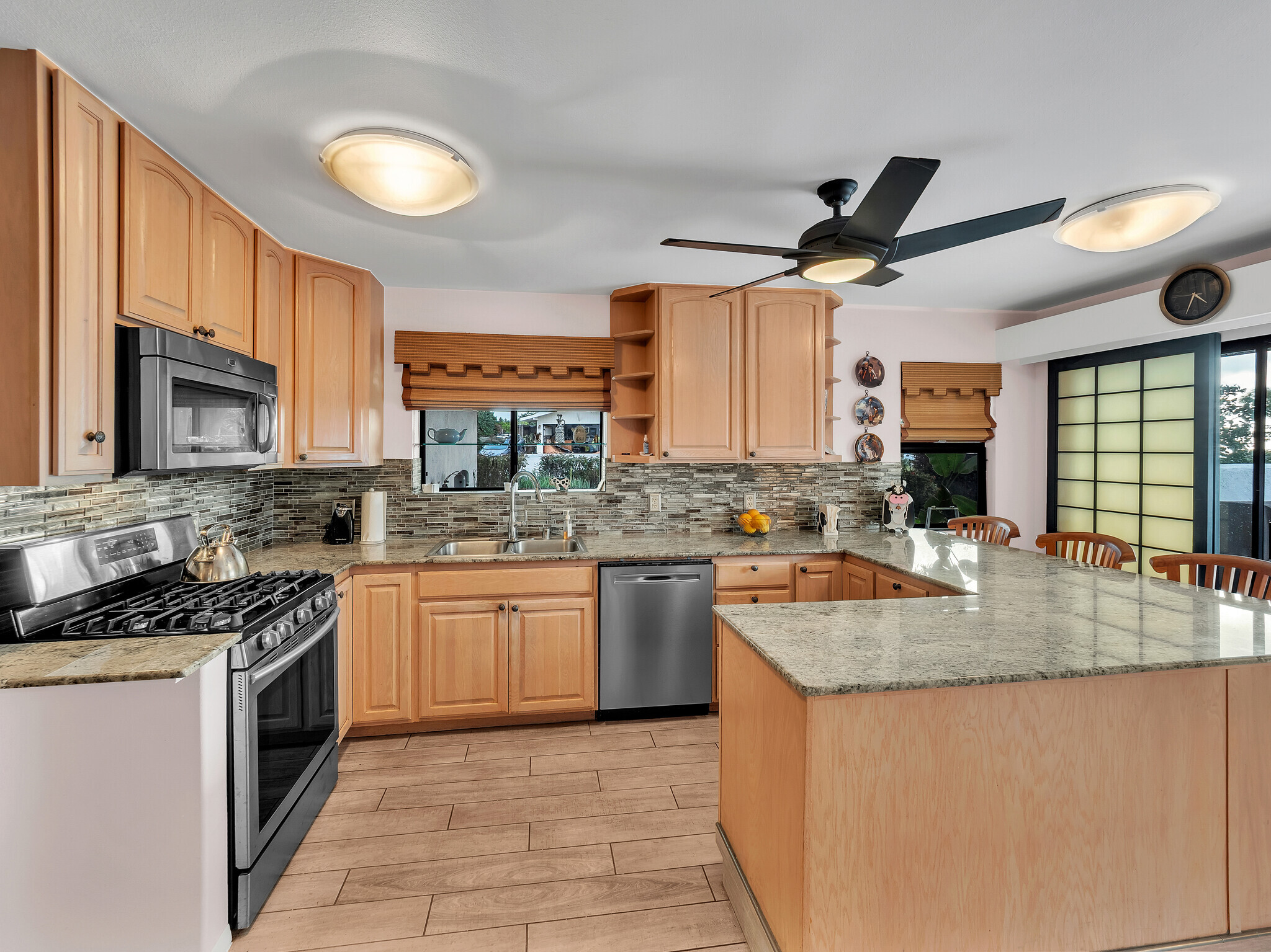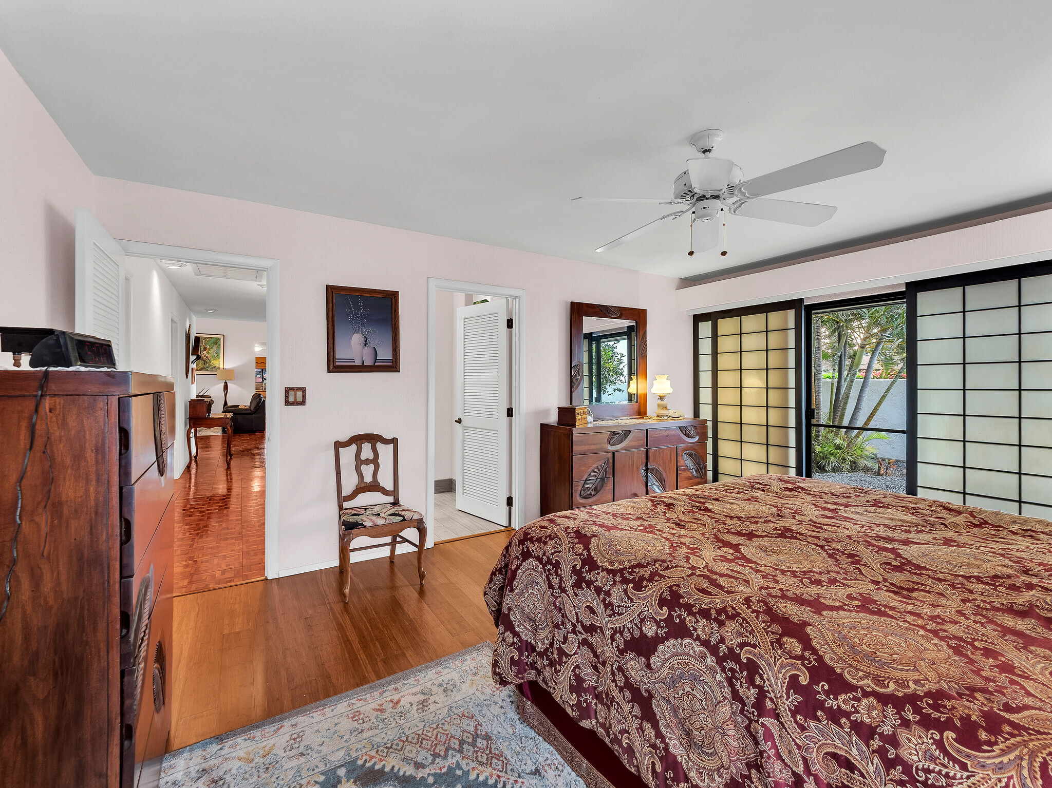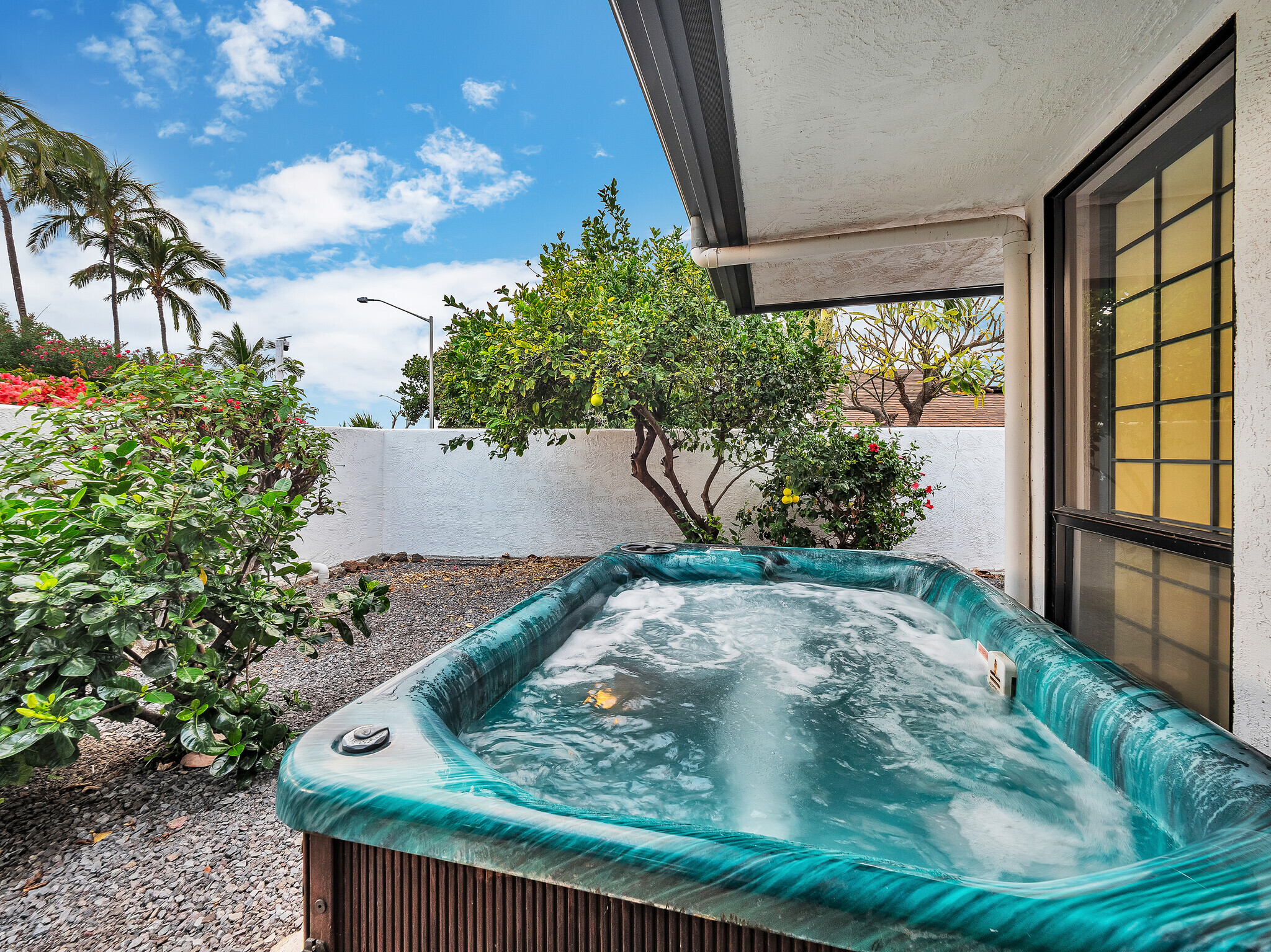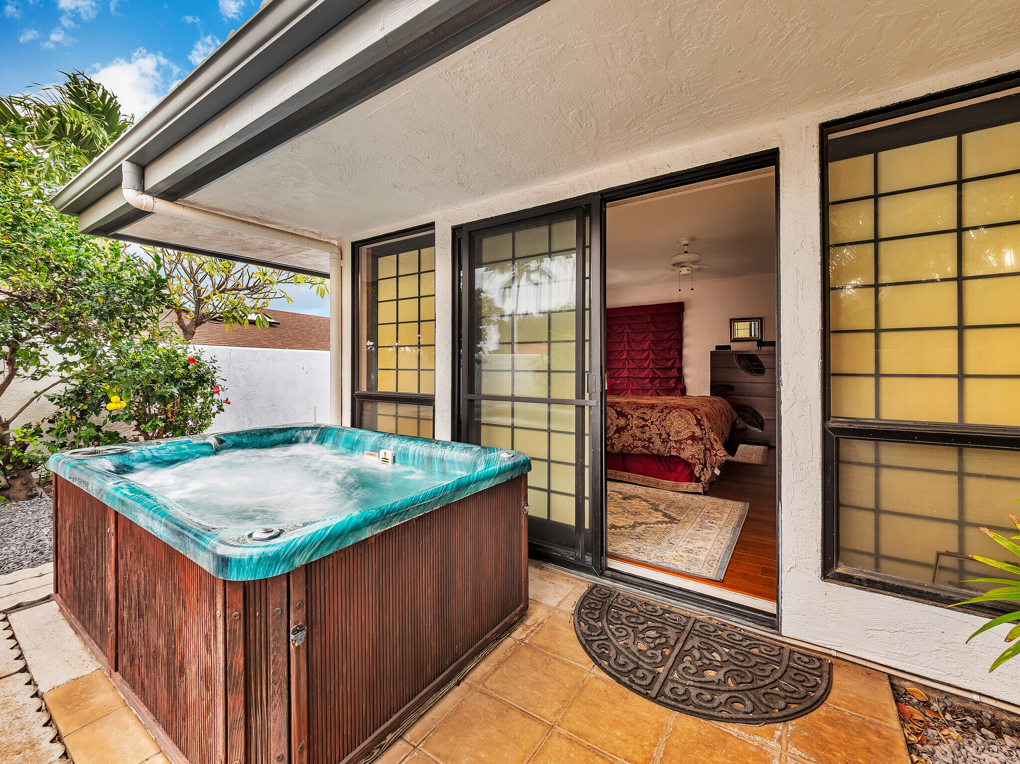 The gorgeous Shinto tile roof imported from Japan, the surrounding masonry wall, and the outstanding landscaping all make this large, impressive residence stand out immediately upon arrival. Enter the sunlit quartzite paved walkway by way of a wrought iron gate flanked by massive Areca palm trees, through the lovely double front doors into the foyer. The elegant great room to the right has teak floors, a built-in glass hutch, a built-in bar, and boasts a high ceiling and a wall of windows that open to the in-ground swimming pool. The gardens are surrounded by fencing hidden by high manicured hedges for complete privacy and security. The quartzite lanai is covered and there are 16 owned solar/photovoltaic panels on the roof as well. As I mentiond, the landscaping is truly outstanding. There is a huge Poinsettia tree and papaya, lemon, starfruit, tangerine, and orange trees to enjoy. An attractive pool shack sits off to the left. The tastefully upgraded gourmet kitchen has high-grade appliances, Italian tile laminate flooring, and counter seating to keep the cook entertained. There is a comfortable built-in kitchen desk with its own cabinets, and a gas stove with stylish finishes. There is also a half bath off the kitchen area. A few oriental touches throughout the home seem to contribute to a feeling of zen and relaxation. The three bedrooms and the remaining two baths are all extremely upgraded and comfortable. Let us not forget an important feature; The master bedroom doors open up to a private patio with a bubbling hot tub. The oversized garage has an abundance of storage on both sides and a private office off to the left. There is a central vacuum and a ventilated fan in the hallway ceiling that can draw any hot air from the home in minutes. This home is truly impeccable, and you will fall in love with its serenity as soon as you enter.