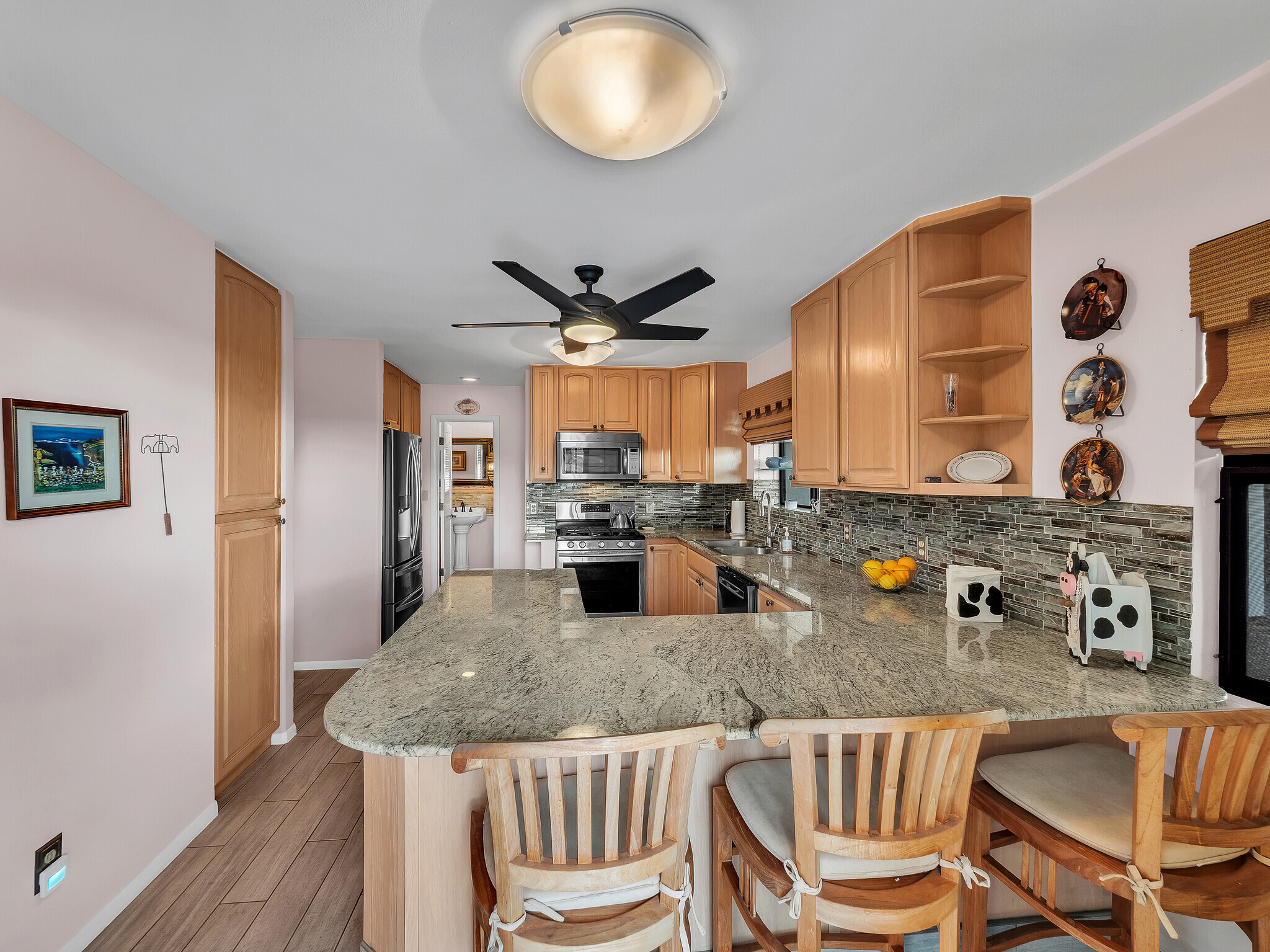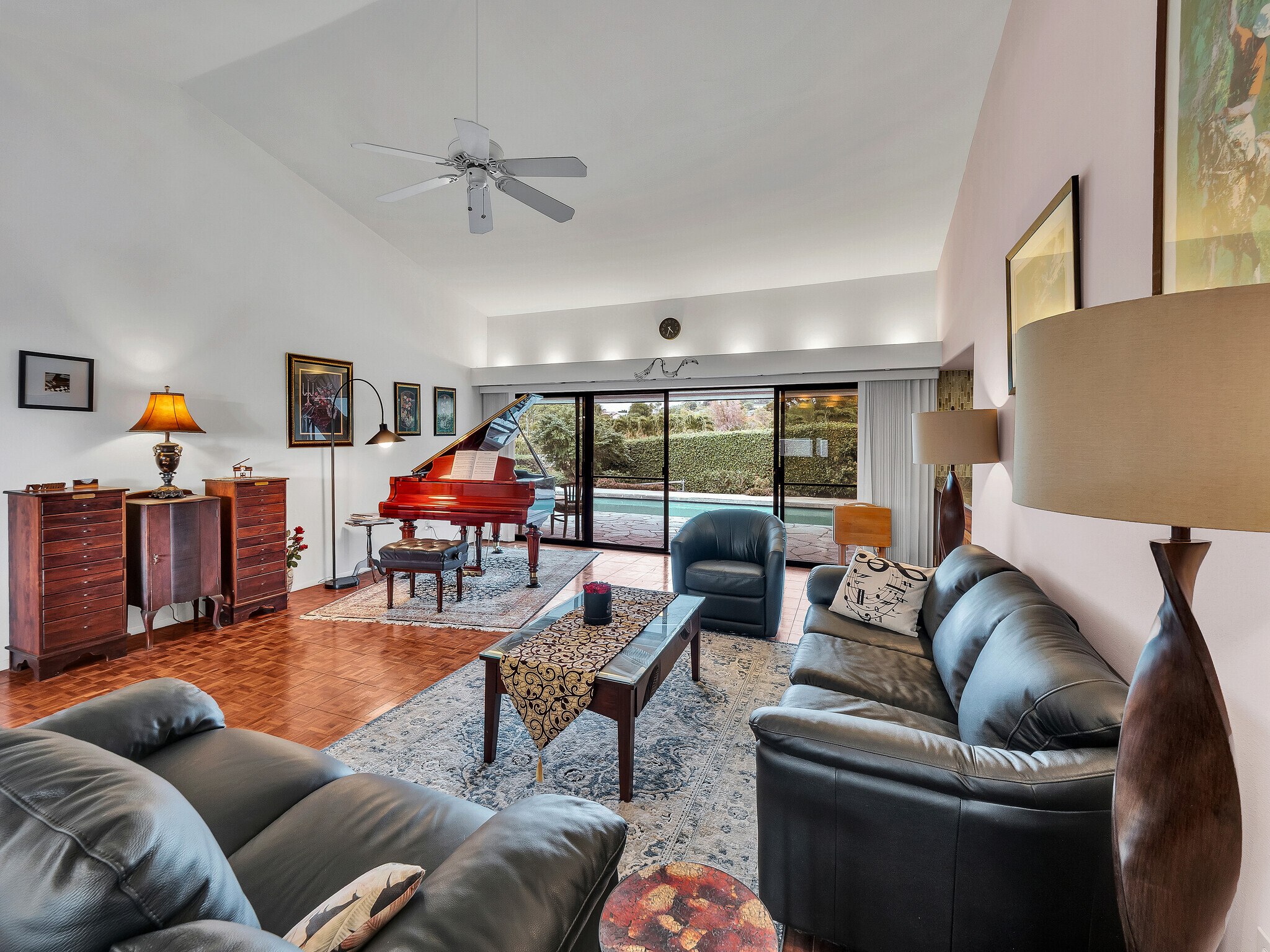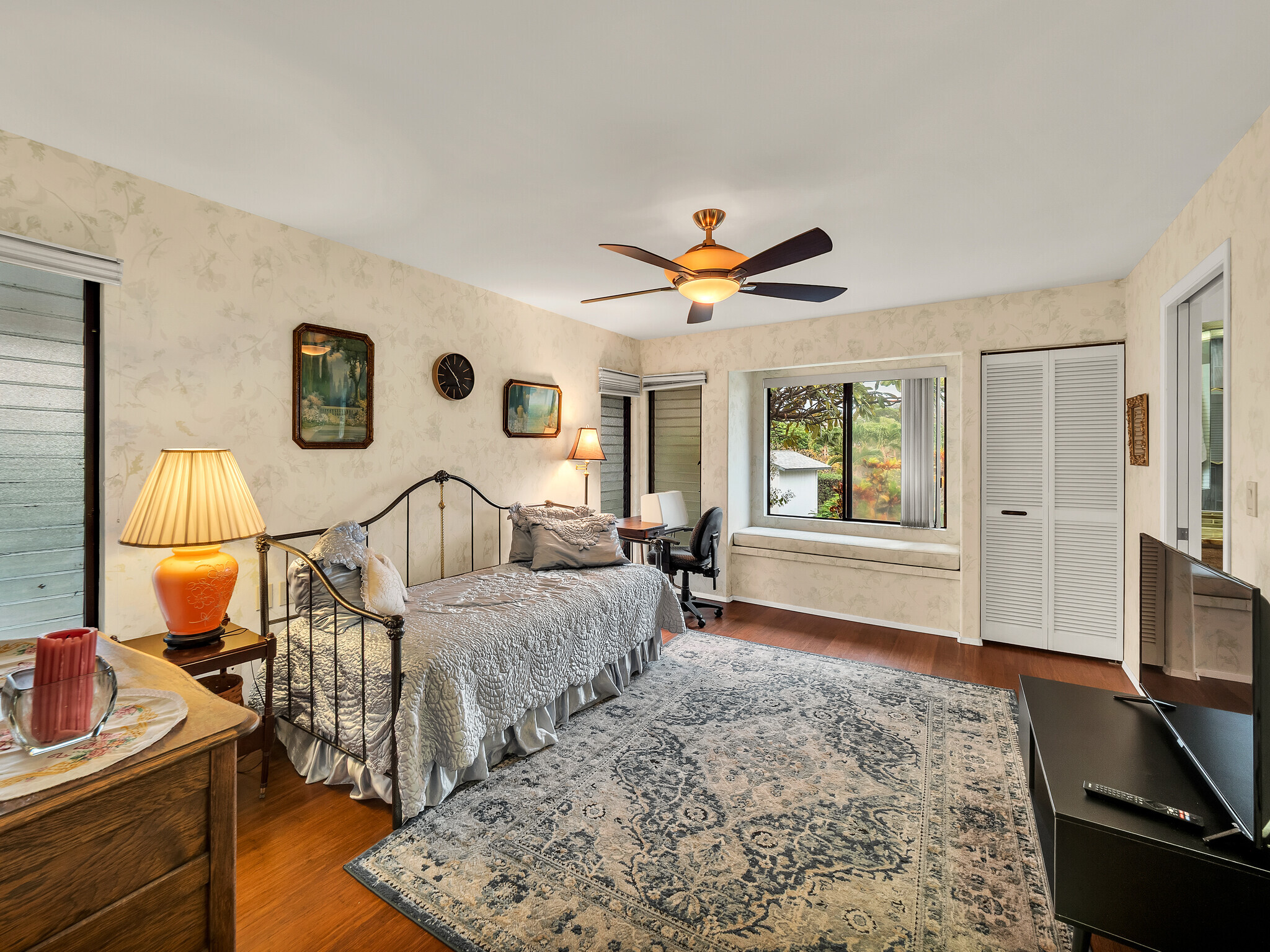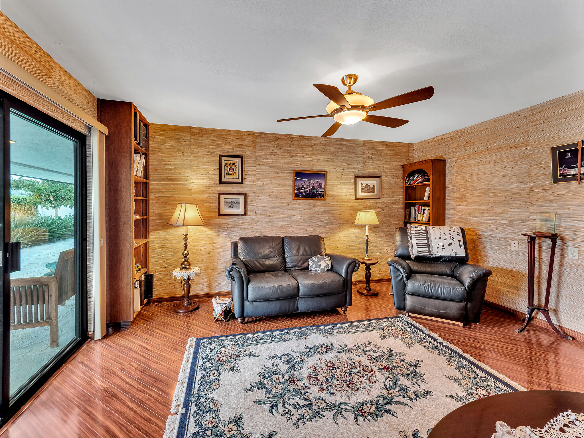 The gorgeous Shinto tile roof imported from Japan, the surrounding masonry wall, and the outstanding landscaping all make this large, impressive residence stand out immediately upon arrival. Enter the sunlit quartzite paved walkway by way of a wrought iron gate flanked by massive Areca palm trees, through the lovely double front doors into the foyer. The elegant great room to the right has teak floors, a built-in glass hutch, a built-in bar, and boasts a high ceiling and a wall of windows that open to the in-ground swimming pool. The gardens are surrounded by fencing hidden by high manicured hedges for complete privacy and security. The quartzite lanai is covered and there are 16 owned solar/photovoltaic panels on the roof as well. As I mentiond, the landscaping is truly outstanding. There is a huge Poinsettia tree and papaya, lemon, starfruit, tangerine, and orange trees to enjoy. An attractive pool shack sits off to the left. The tastefully upgraded gourmet kitchen has high-grade appliances, Italian tile laminate flooring, and counter seating to keep the cook entertained. There is a comfortable built-in kitchen desk with its own cabinets, and a gas stove with stylish finishes. There is also a half bath off the kitchen area. A few oriental touches throughout the home seem to contribute to a feeling of zen and relaxation. The three bedrooms and the remaining two baths are all extremely upgraded and comfortable. Let us not forget an important feature; The master bedroom doors open up to a private patio with a bubbling hot tub. The oversized garage has an abundance of storage on both sides and a private office off to the left. There is a central vacuum and a ventilated fan in the hallway ceiling that can draw any hot air from the home in minutes. This home is truly impeccable, and you will fall in love with its serenity as soon as you enter.