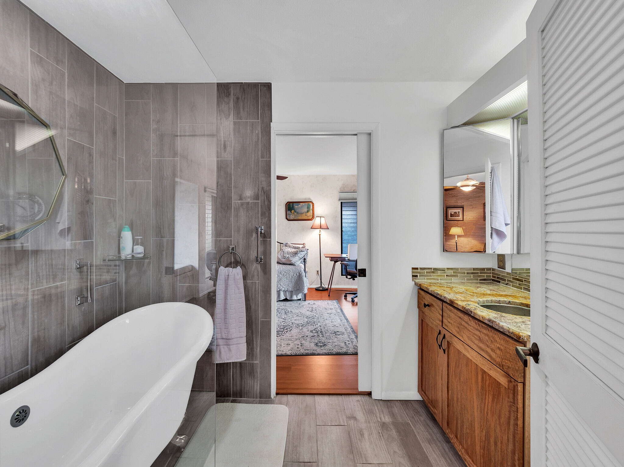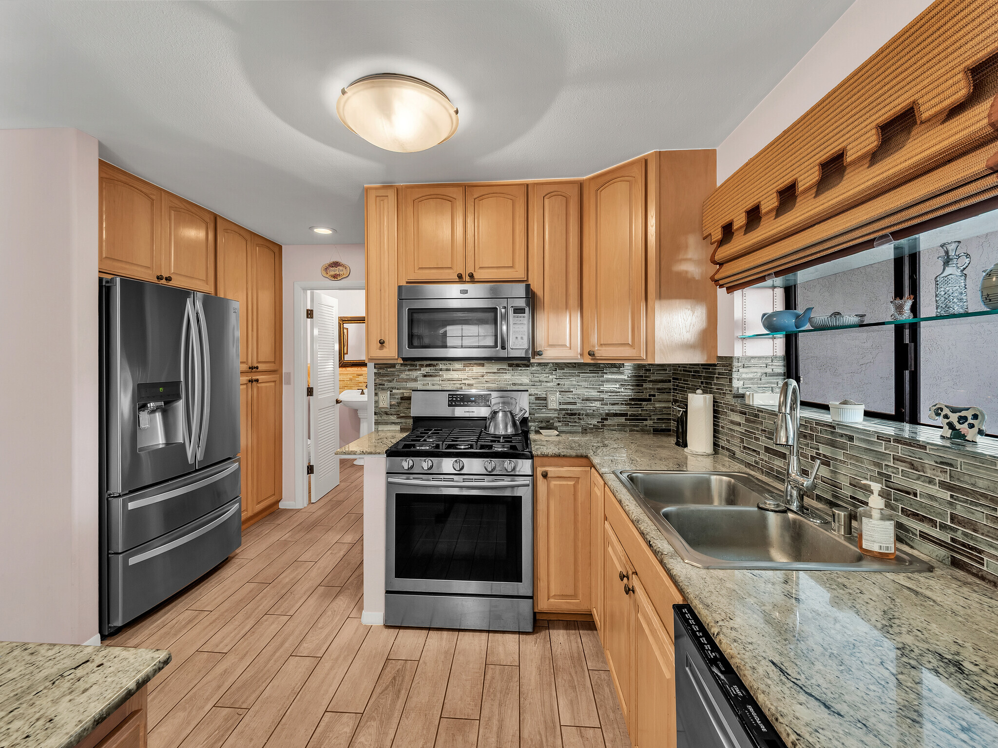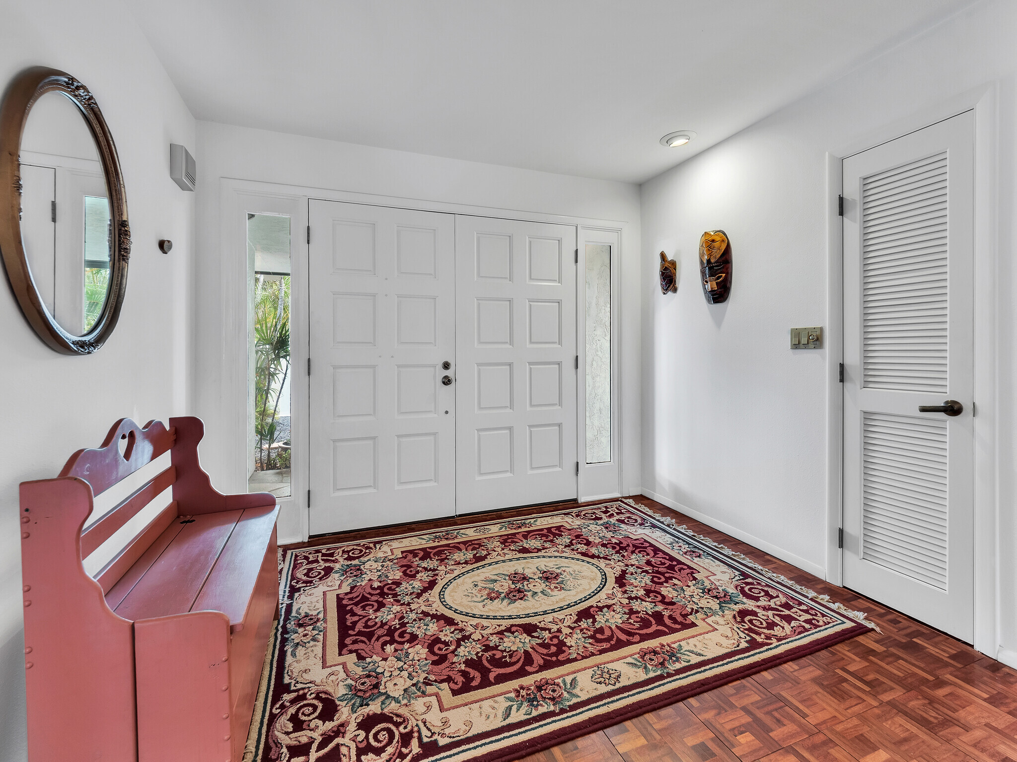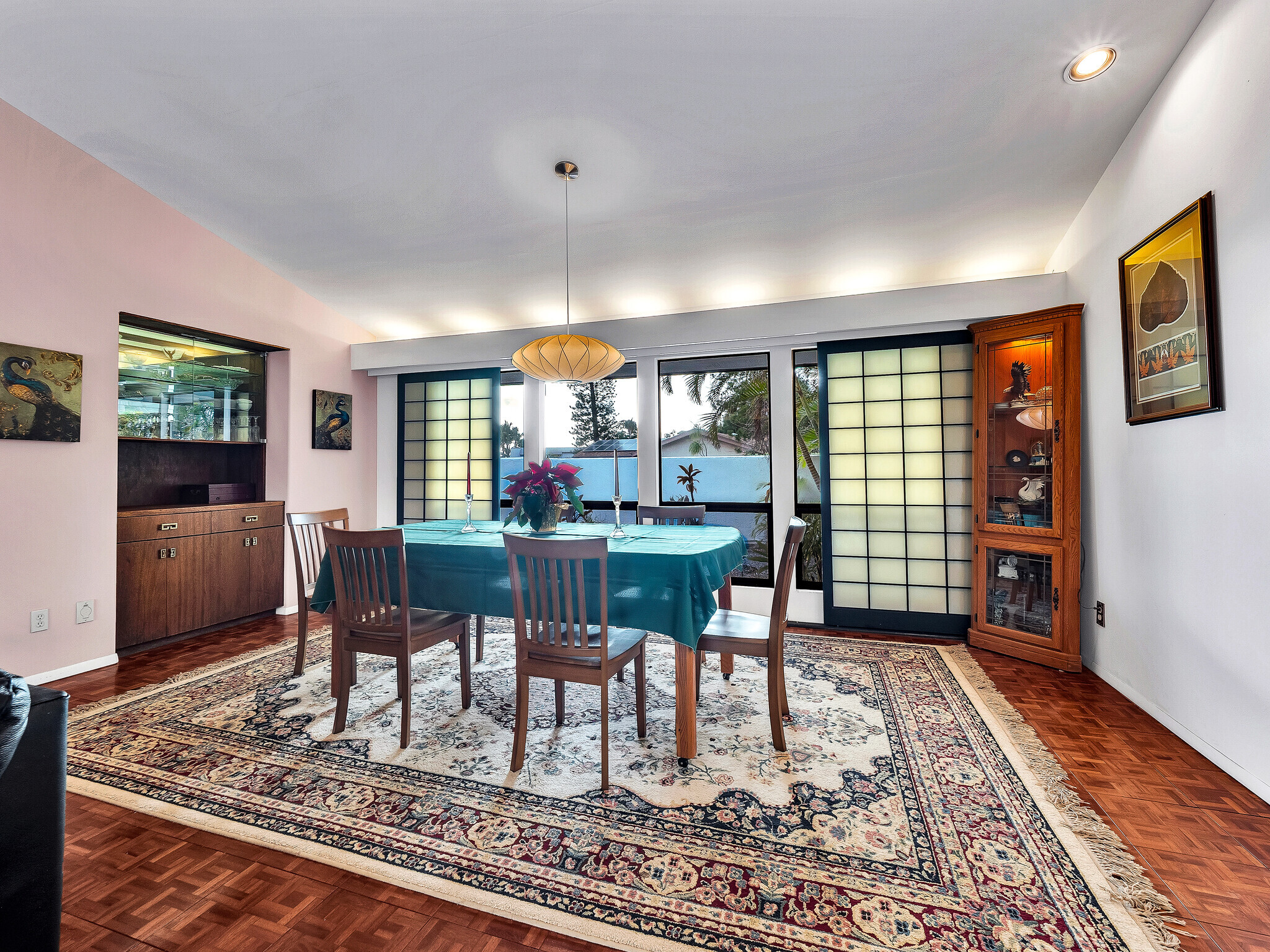 The gorgeous Shinto tile roof imported from Japan, the surrounding masonry wall, and the outstanding landscaping all make this large, impressive residence stand out immediately upon arrival. Enter the sunlit quartzite paved walkway by way of a wrought iron gate flanked by massive Areca palm trees, through the lovely double front doors into the foyer. The elegant great room to the right has teak floors, a built-in glass hutch, a built-in bar, and boasts a high ceiling and a wall of windows that open to the in-ground swimming pool. The gardens are surrounded by fencing hidden by high manicured hedges for complete privacy and security. The quartzite lanai is covered and there are 16 owned solar/photovoltaic panels on the roof as well. As I mentiond, the landscaping is truly outstanding. There is a huge Poinsettia tree and papaya, lemon, starfruit, tangerine, and orange trees to enjoy. An attractive pool shack sits off to the left. The tastefully upgraded gourmet kitchen has high-grade appliances, Italian tile laminate flooring, and counter seating to keep the cook entertained. There is a comfortable built-in kitchen desk with its own cabinets, and a gas stove with stylish finishes. There is also a half bath off the kitchen area. A few oriental touches throughout the home seem to contribute to a feeling of zen and relaxation. The three bedrooms and the remaining two baths are all extremely upgraded and comfortable. Let us not forget an important feature; The master bedroom doors open up to a private patio with a bubbling hot tub. The oversized garage has an abundance of storage on both sides and a private office off to the left. There is a central vacuum and a ventilated fan in the hallway ceiling that can draw any hot air from the home in minutes. This home is truly impeccable, and you will fall in love with its serenity as soon as you enter.