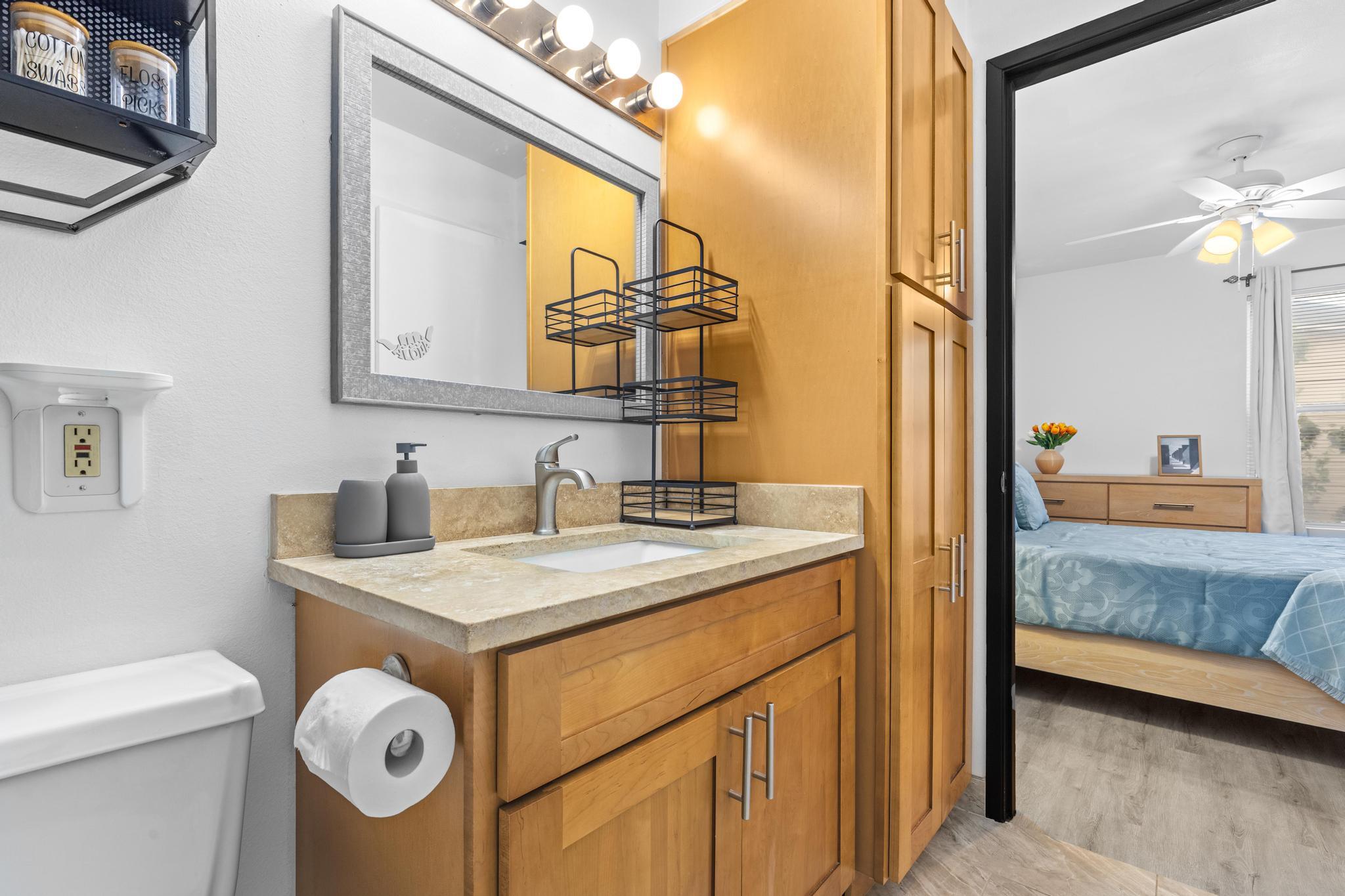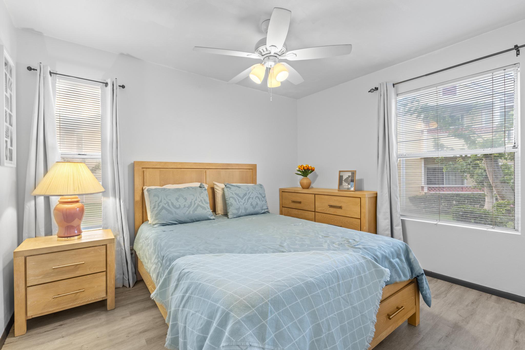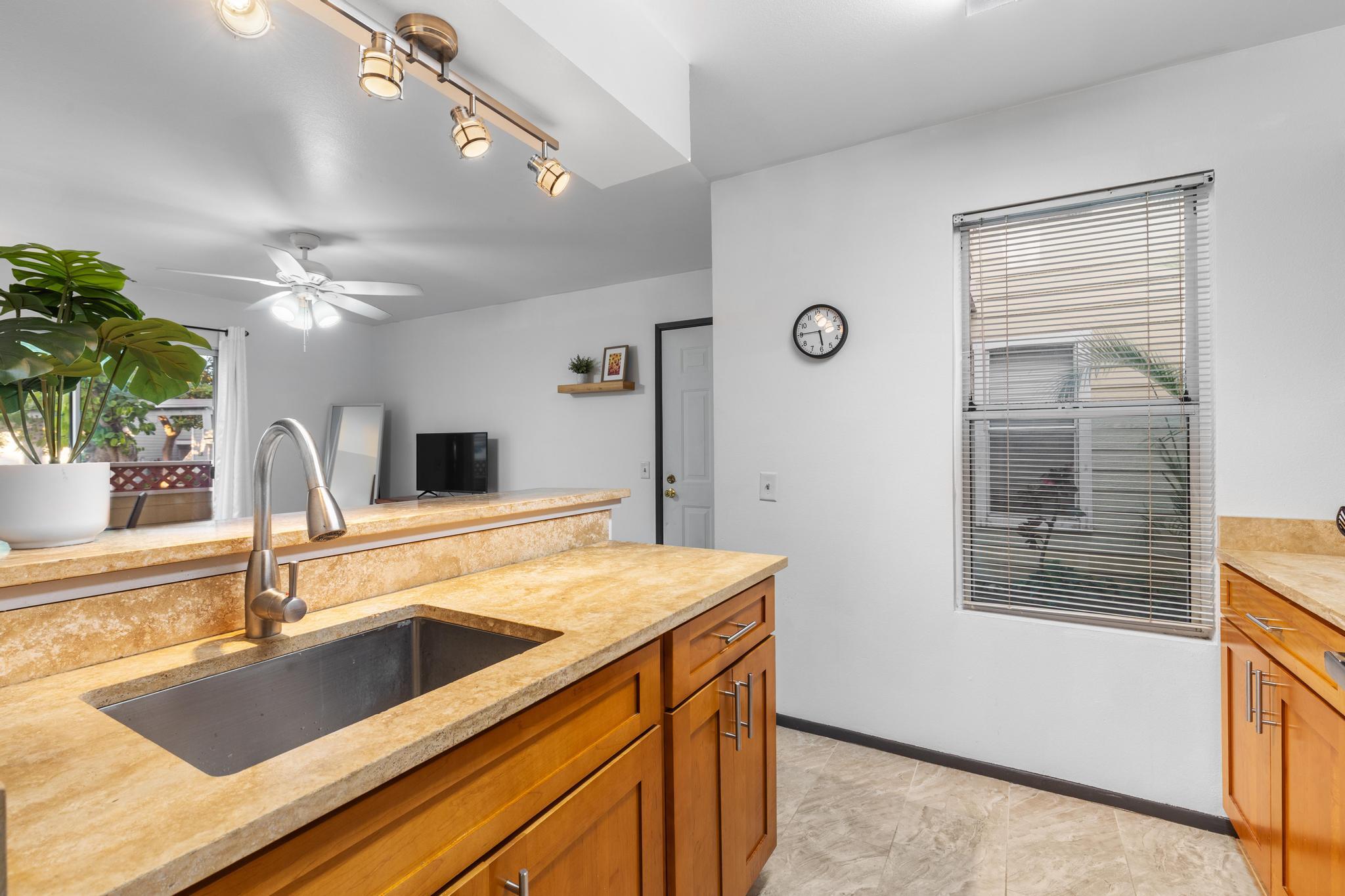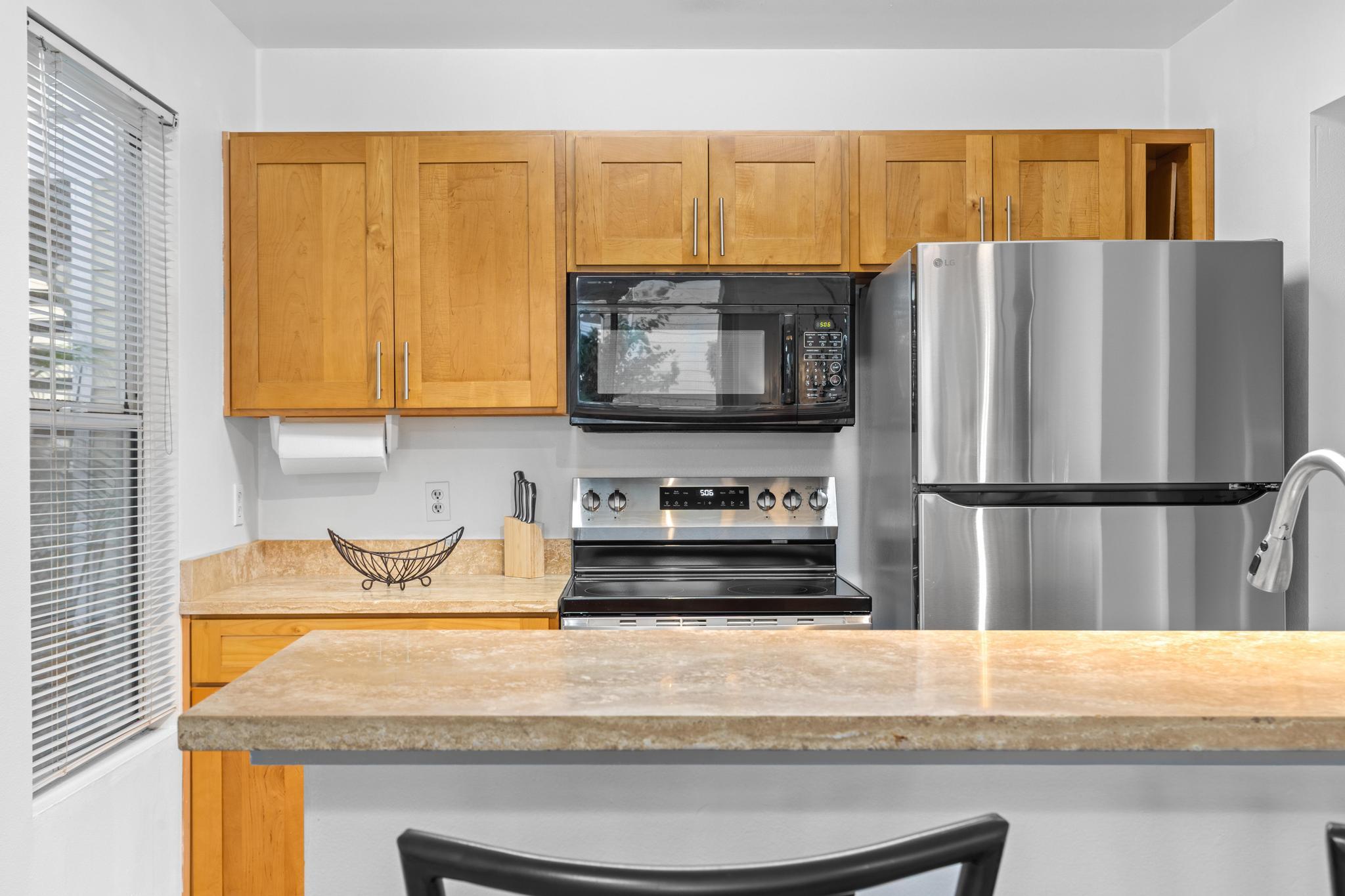 Welcome home to Fairway Terrace, a relaxed island retreat designed for everyday comfort. This ground level one bedroom, one bath condo features a bright, open living space with fresh interior paint, luxury vinyl plank flooring paired with ceramic tile, and lighted ceiling fans throughout. The kitchen has been tastefully updated with travertine countertops and a brand new stainless steel refrigerator and range. Sliding glass doors open to a private lanai, creating a quiet outdoor space to unwind, with a lockable storage closet for added convenience. Fairway Terrace is a gated community offering assigned covered parking, a pool and spa, BBQ area, exercise room, and recreation center. Photovoltaic panels help offset daytime electricity use, adding efficiency to island living. Waikoloa Village Association membership is included with the HOA, providing access to the golf course, driving range, lap pool, and tennis facilities. Additional community information is available at www.waikoloa.org. Water service is provided by Hawaii Water Company, a private utility regulated by the PUC. Conveniently located near grocery stores, dining, fuel, hardware, and other village services. Kohala Coast beaches, golf, shopping, and resort amenities are a short drive away.