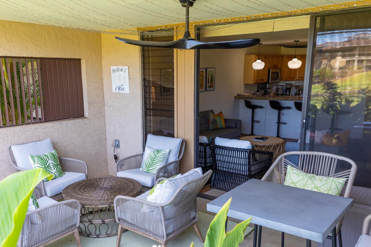 Situated on the ninth hole of a stunning golf course, Unit H101 boasts breathtaking sunset views, lush greenery, and the serene sounds of tropical birds. The Waikoloa Village Association provides access to the renowned Robert Trent Jones Jr. golf course, tennis and pickleball courts, a driving range, and a clubhouse, ensuring endless recreation.
