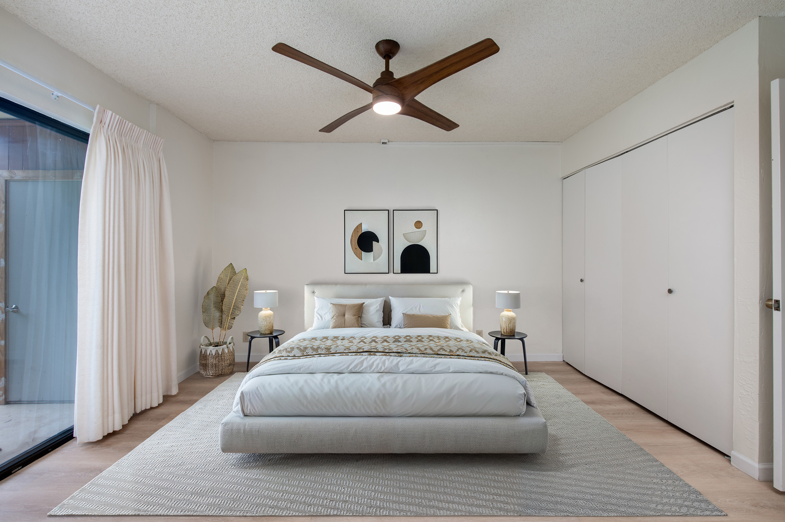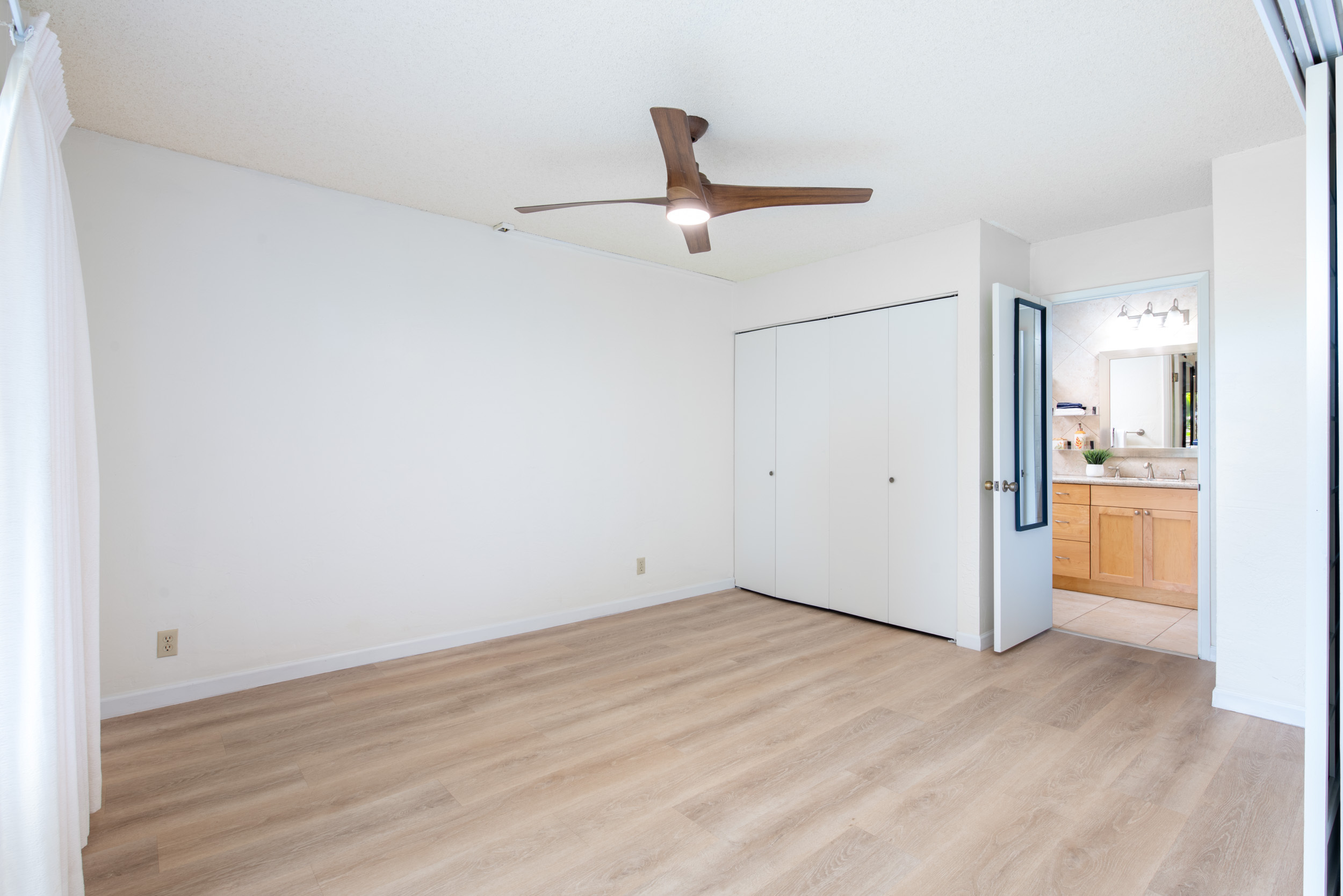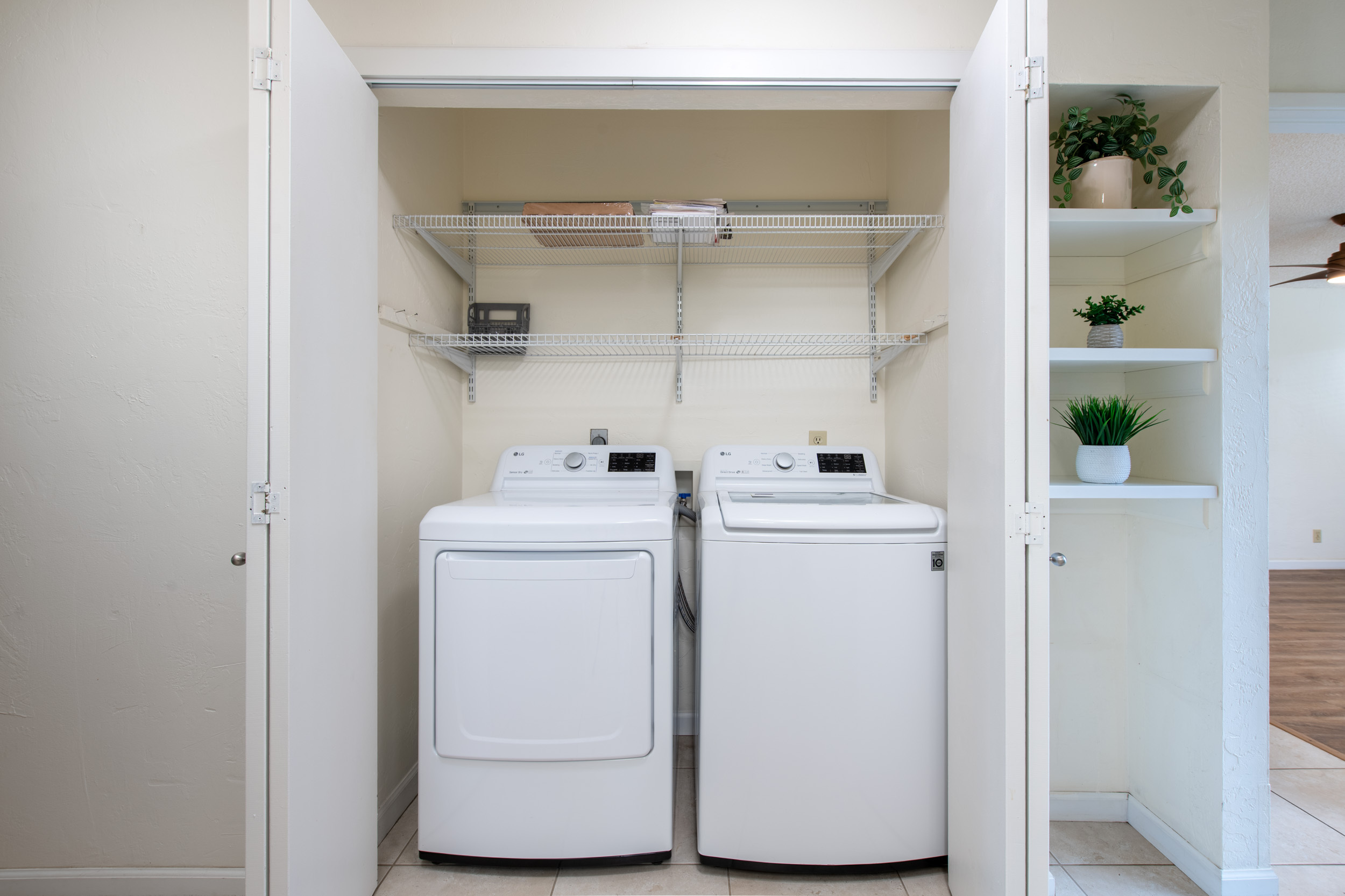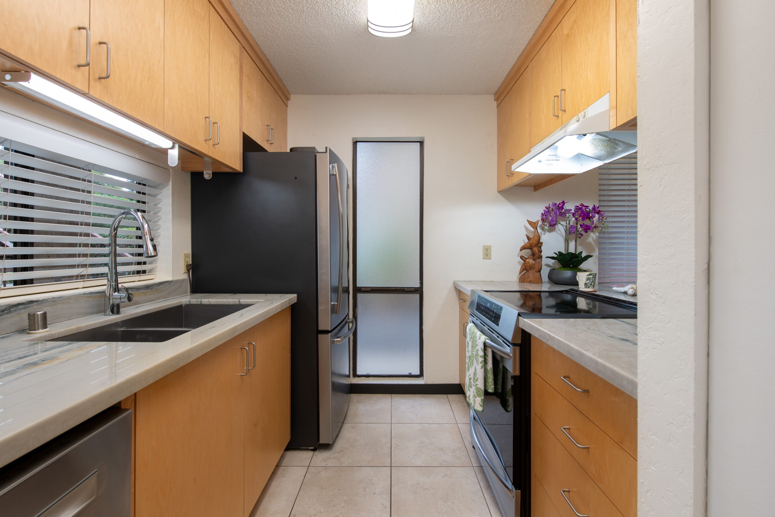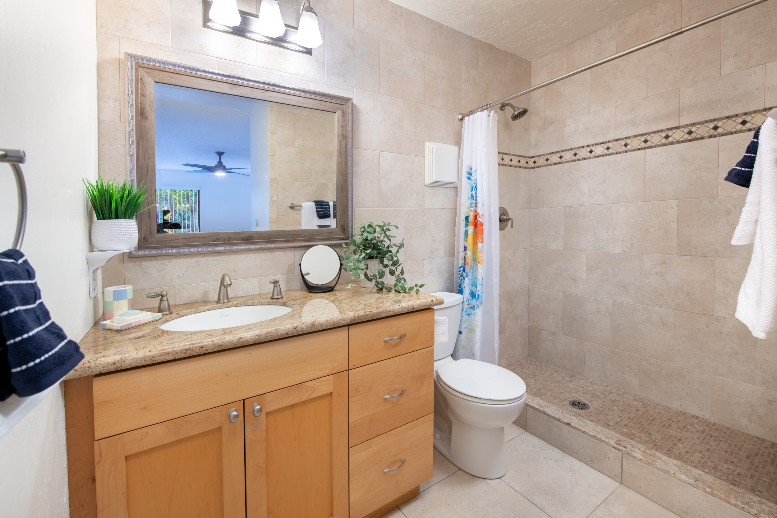 Inside, you’ll find tasteful updates throughout: luxury vinyl and tile flooring, a beautifully remodeled custom kitchen with soft-close cabinetry, and elegant stone countertops. Both bathrooms reflect quality craftsmanship and care, with both featuring spacious walk-in showers wrapped in sleek tile. Custom MinkaAire ceiling fans and thoughtful design details throughout the home add a polished, elevated touch.