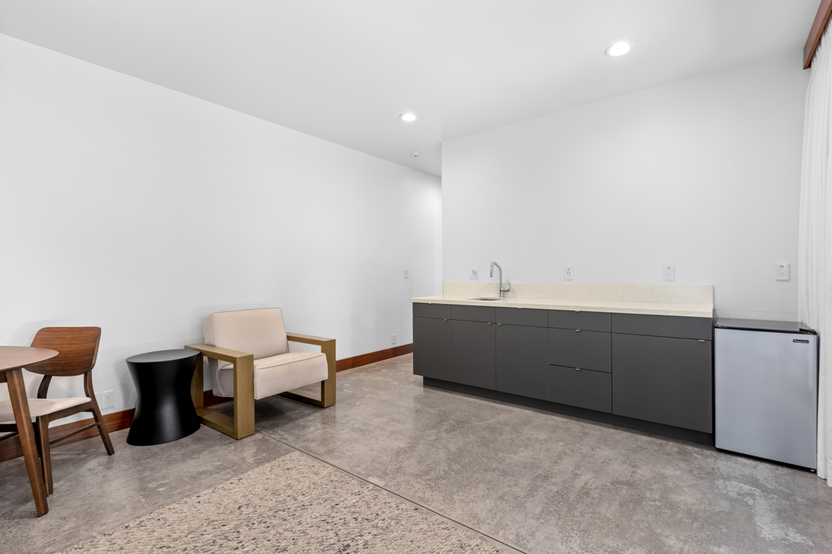 The lower level has a living room, bedroom and bathroom, or can be used alternatively for offices, etc.; it also has access to a large covered lanai, accessed by sliding doors and screens.