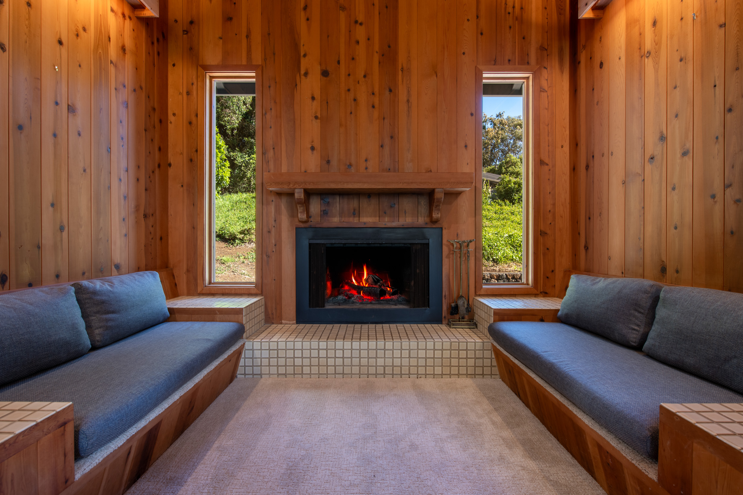 The bright living room welcomes abundant natural light, creating an ideal setting for gatherings and entertaining. A cozy nook with a charming fireplace offers a warm retreat for quiet moments or family time. The well-designed kitchen features generous counter space, ample cabinetry, and a built-in two-sided dining bench that adds both character and functionality.