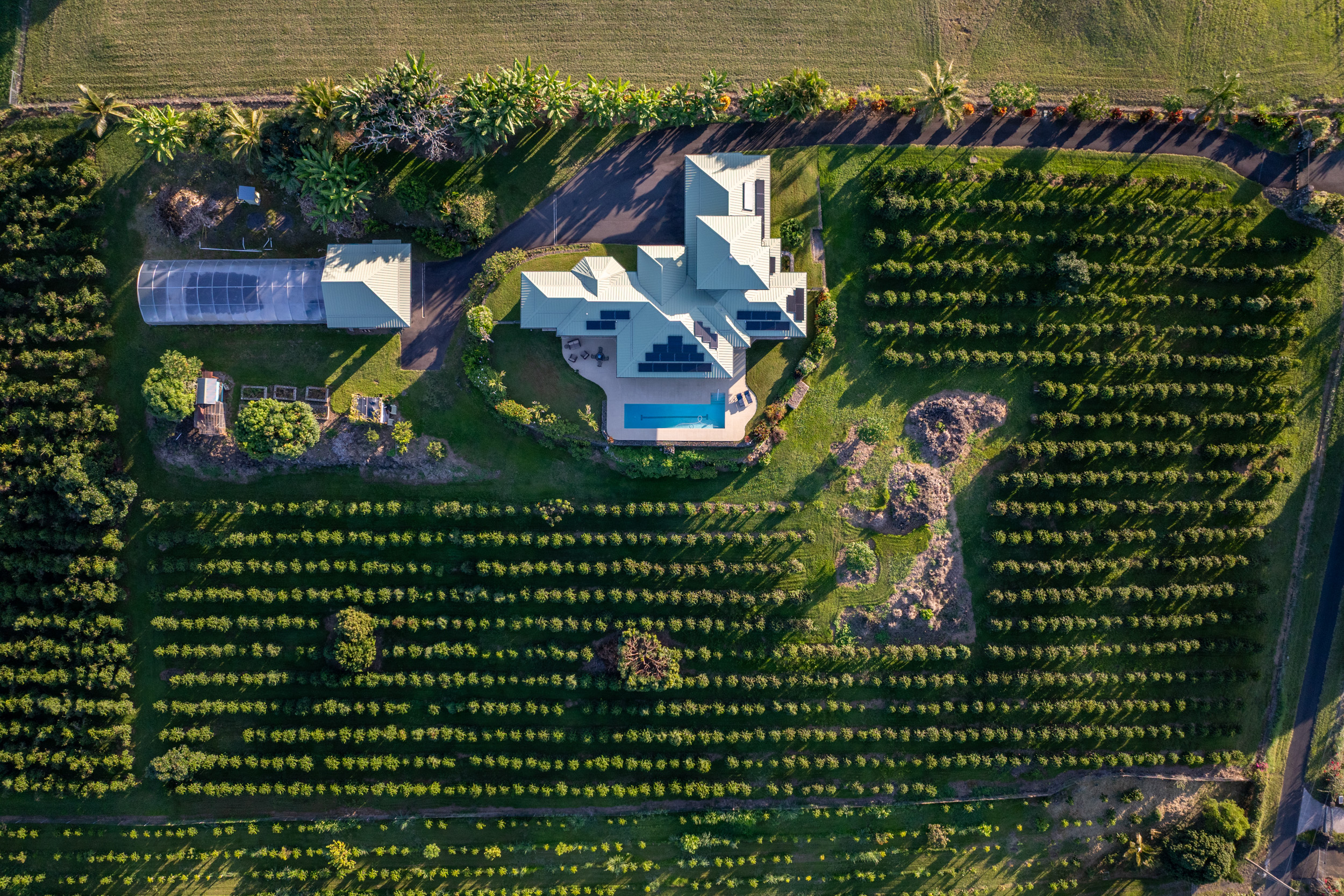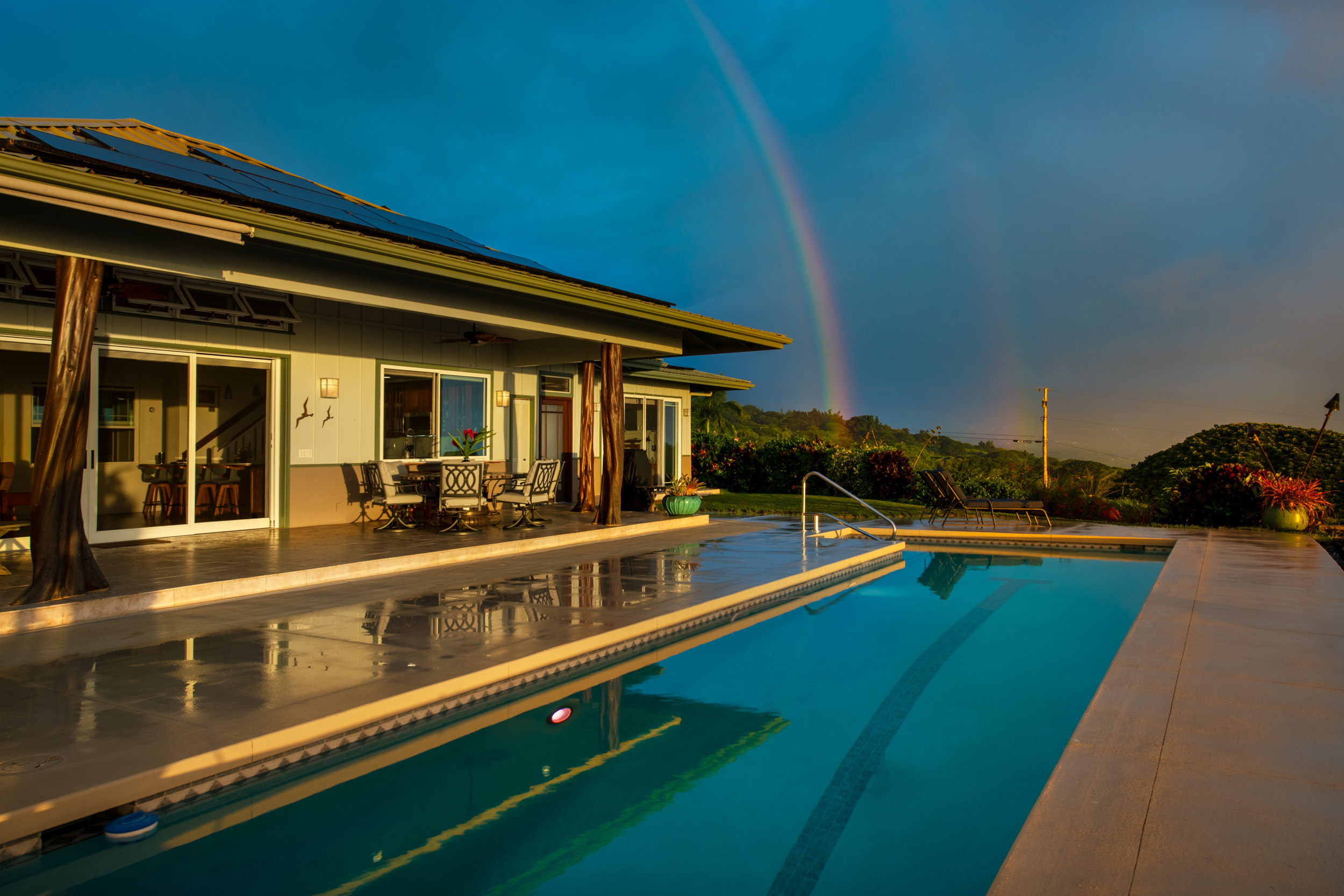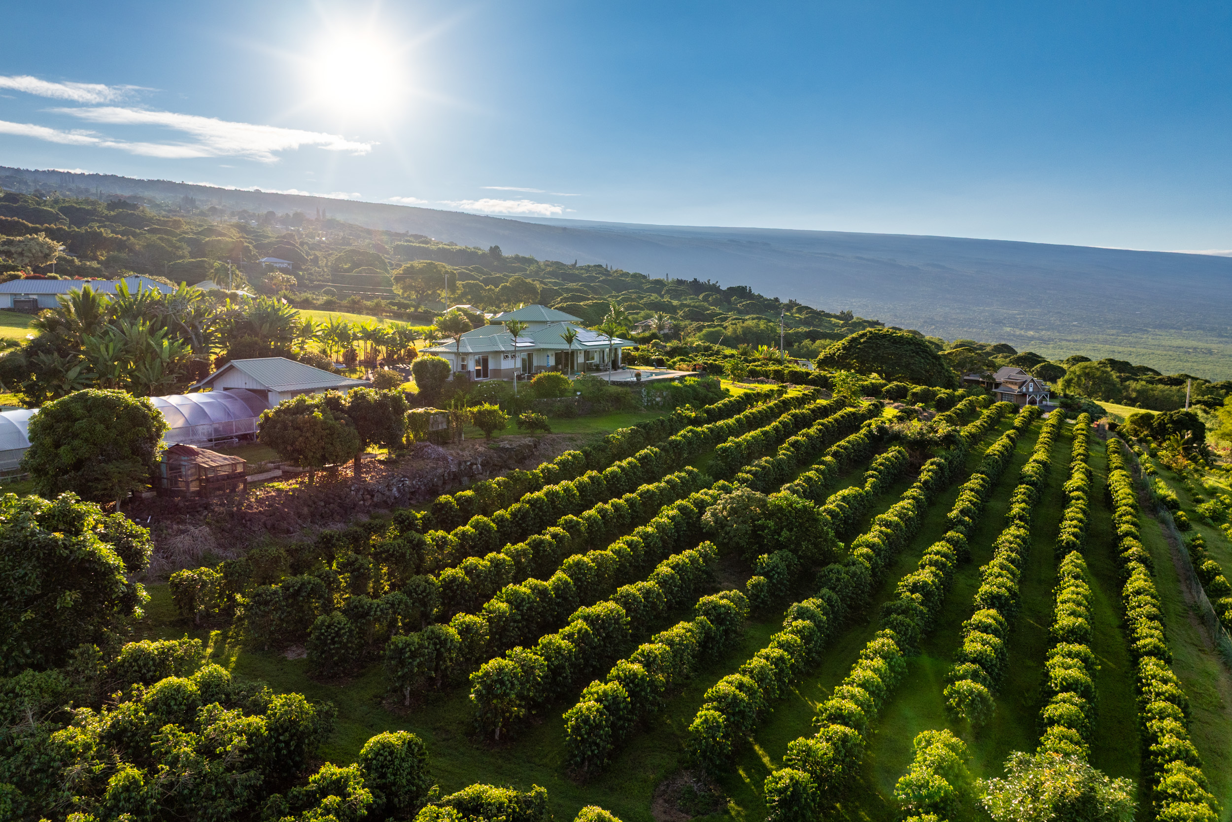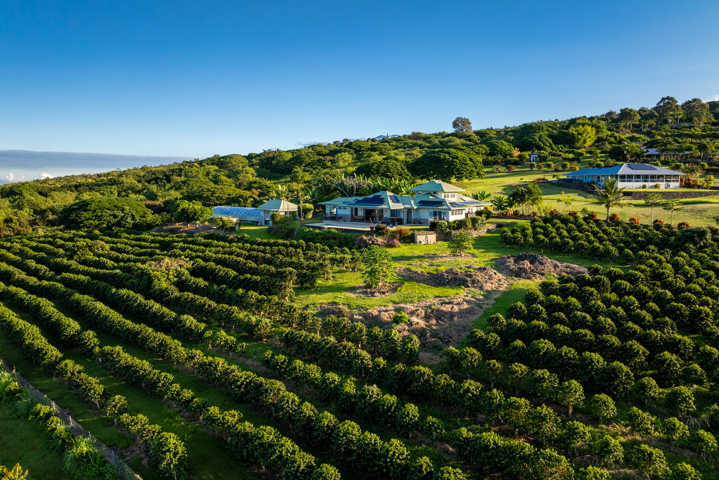 Outdoors, a covered lanai and ocean-facing pool invite year-round enjoyment of Kona’s vivid sunsets. The landscape thrives with mature, irrigated coffee and an exceptional variety of fruit trees – mango, avocado, lemon, lime, tangerine, banana, grapefruit, lychee, lilikoi, coconut, and more – creating an atmosphere of abundance and privacy.