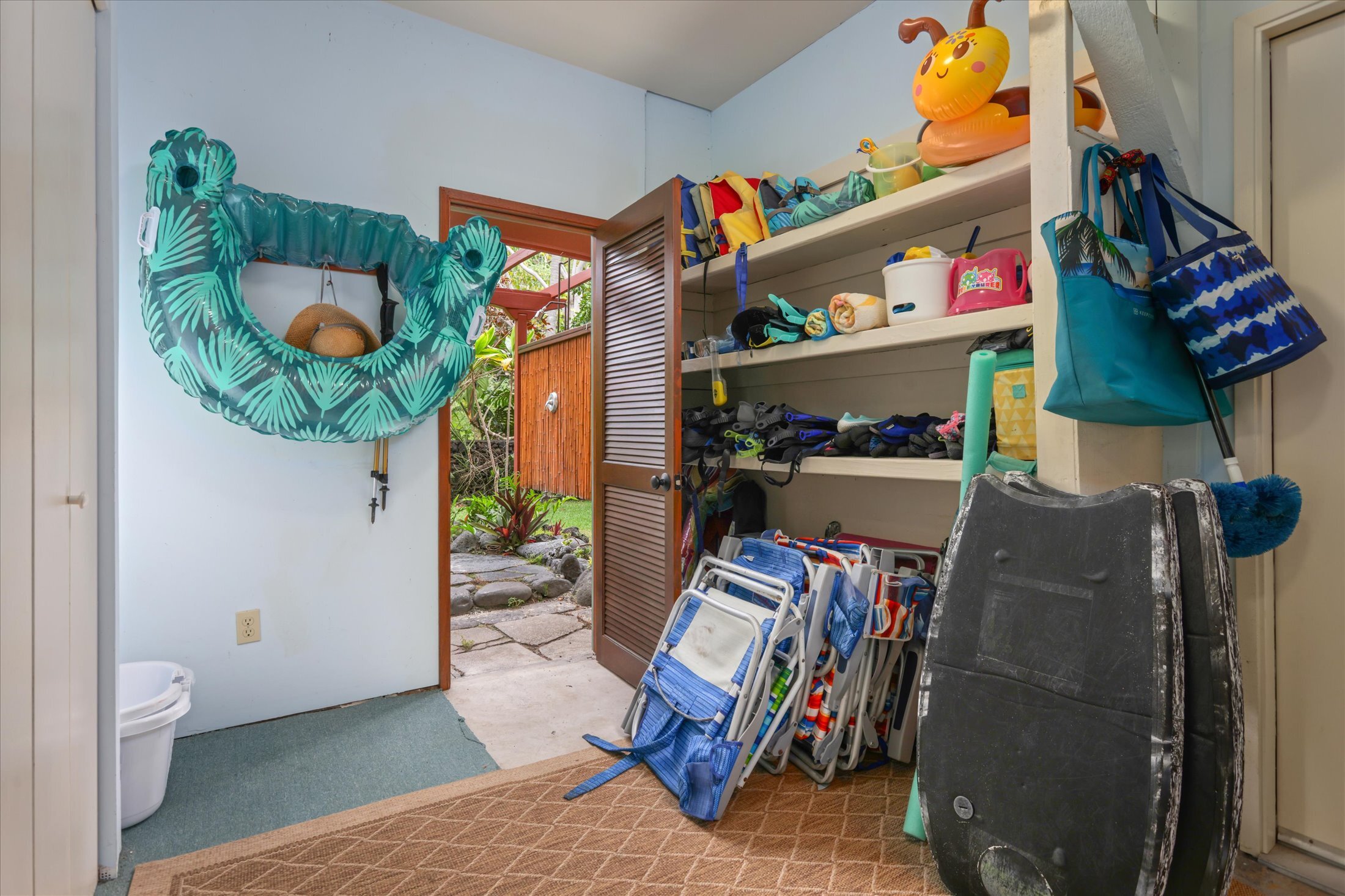 The main residence features two bedrooms and two bathrooms upstairs, as well as a ground-floor one-bedroom suite with a separate entrance. The main house features its own washer and dryer, an outdoor shower, and ample beach gear for relaxing days by the water.