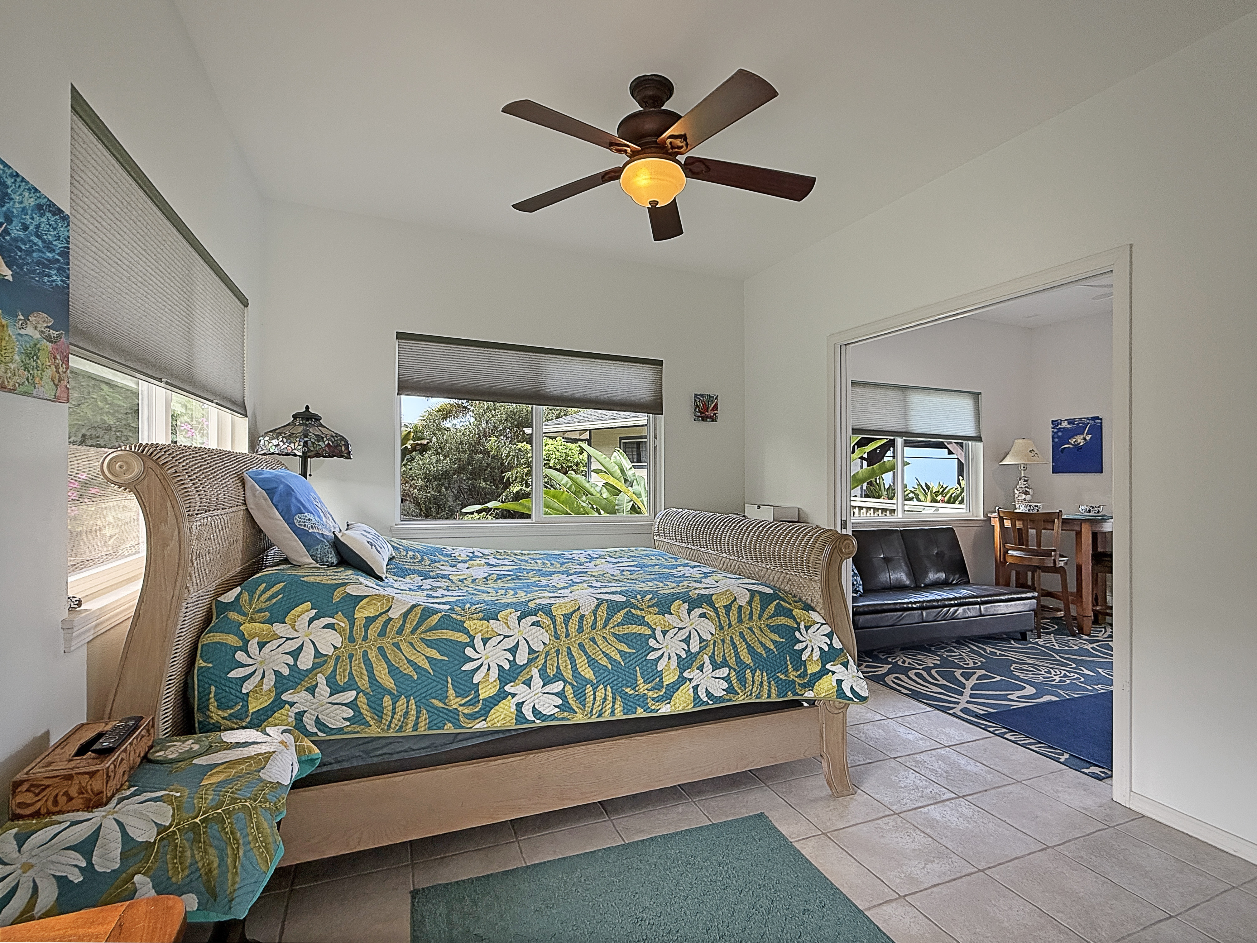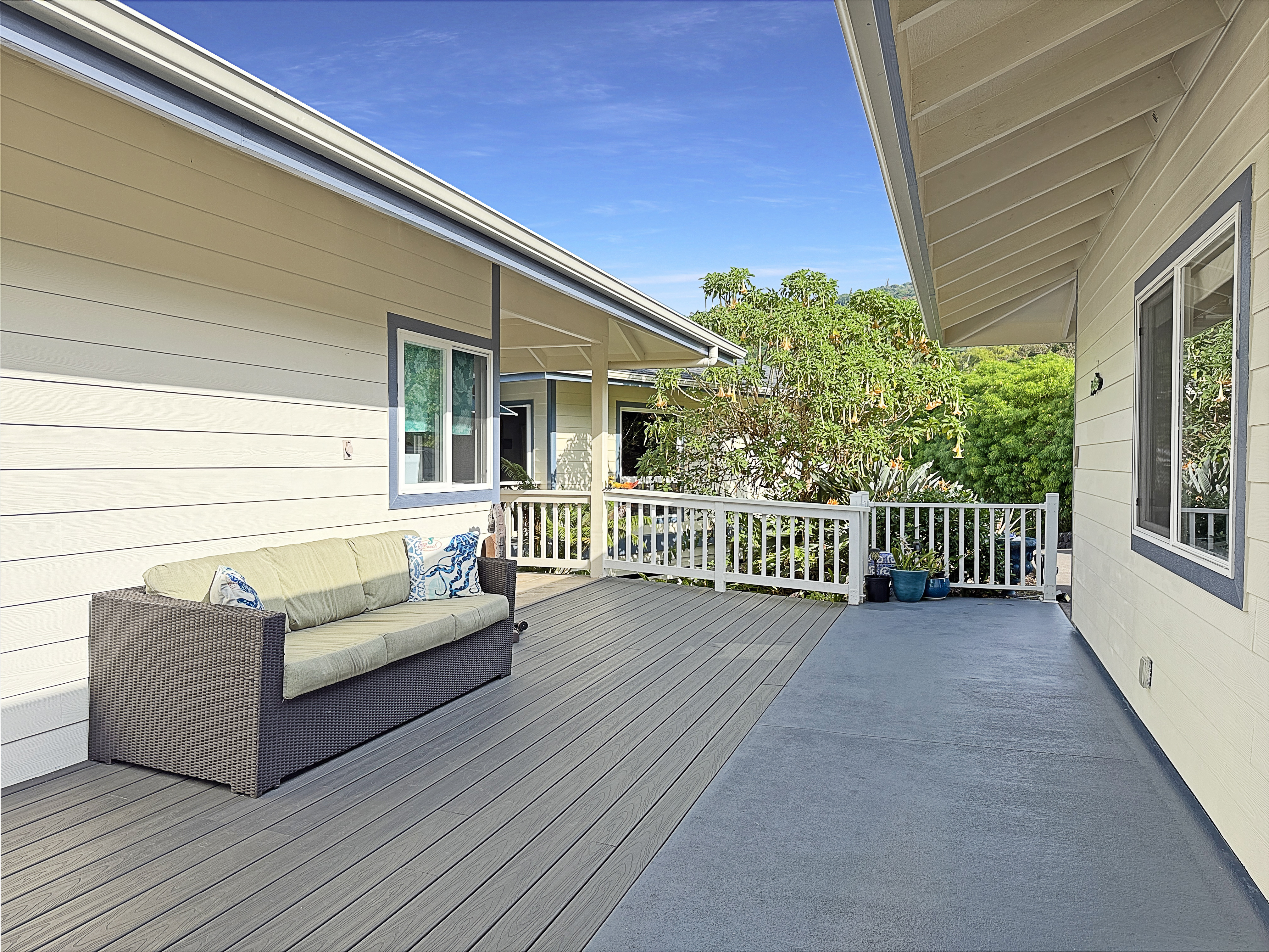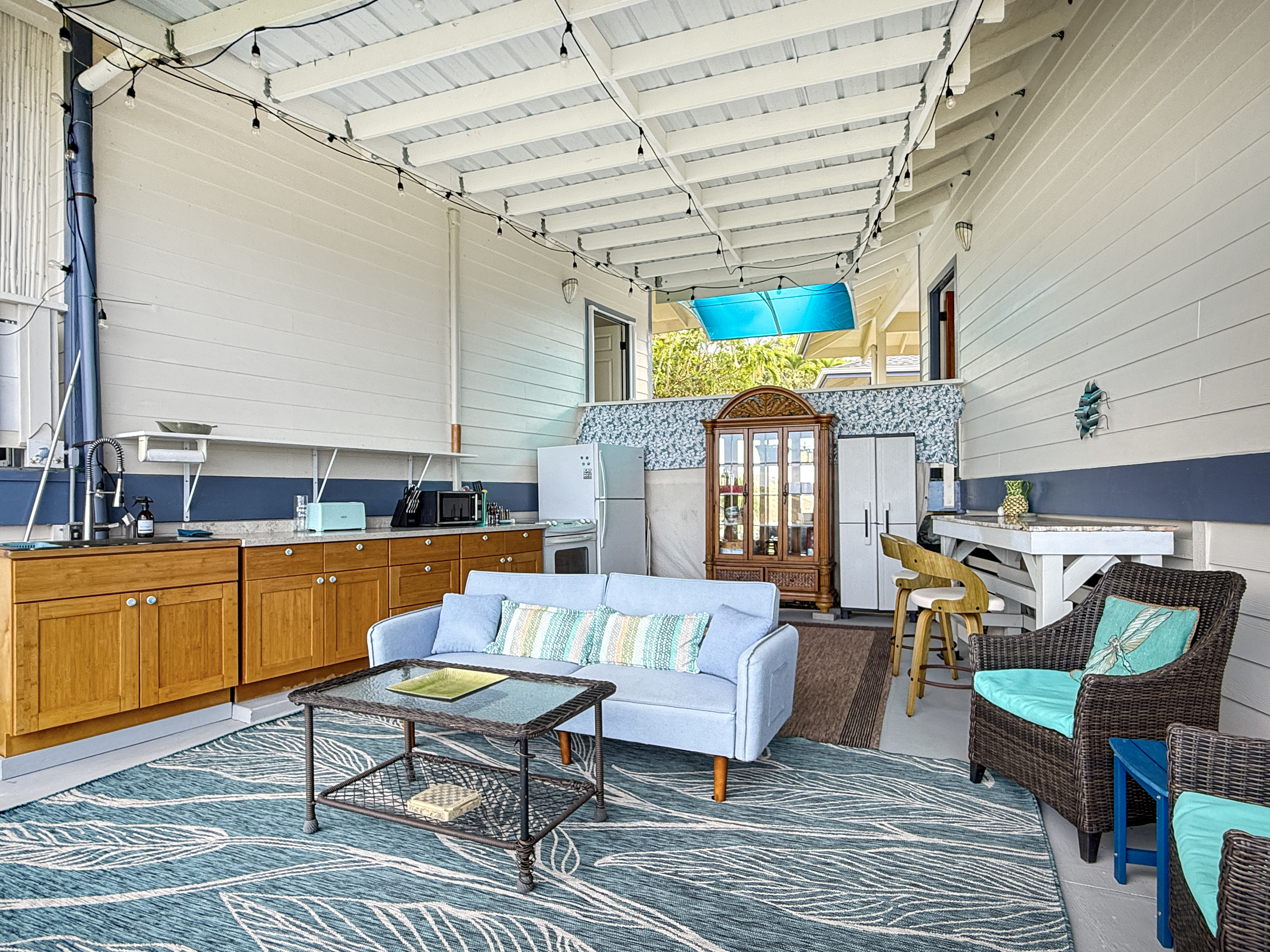 Designed for flexibility, the property features 3 separate living areas with private entrances, ideal for multigenerational living or hosting guests. The main home offers a bright open living area, teal corian kitchen countertops, new appliances, a bedroom, bath, and wet bar. Each living space is oriented toward sweeping ocean views. On either end of the main living area you'll find two en-suite bedrooms attached to the main living area via breezeways. The spacious north unit comes complete with a king bed, walk-in closet, updated bath, lanai, and new outdoor covered wet-bar area. The south unit enjoys its own private lanai, bathroom, wet-bar and some of the best views on the property. A detached 3-car garage with separate laundry room adds practical ease.