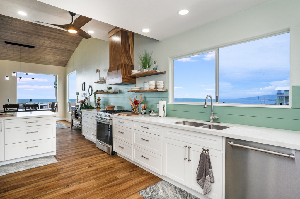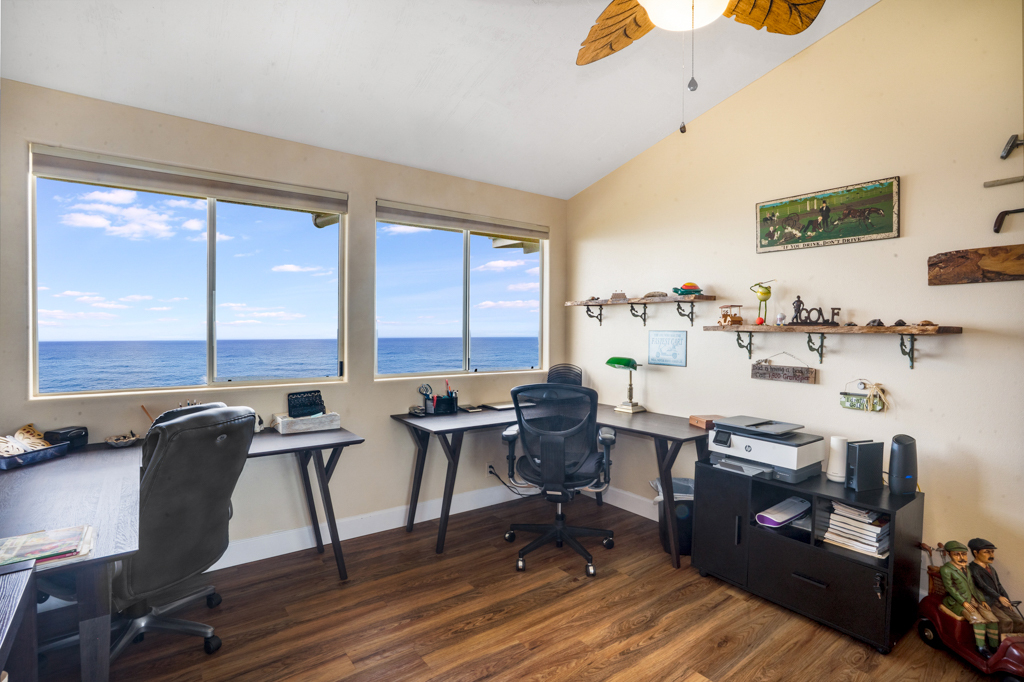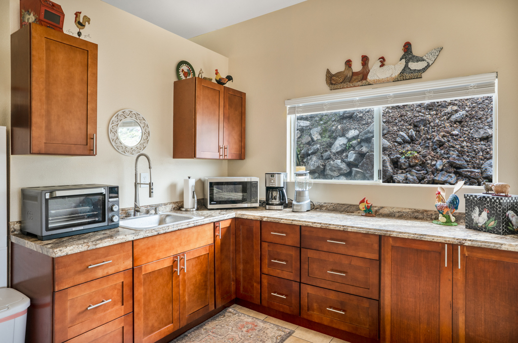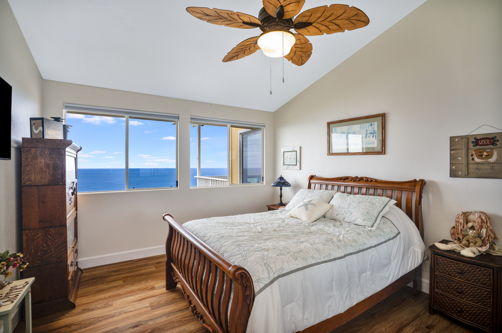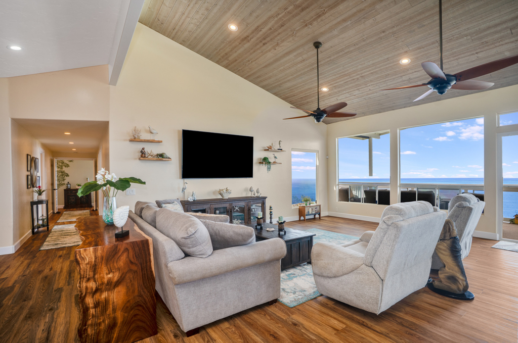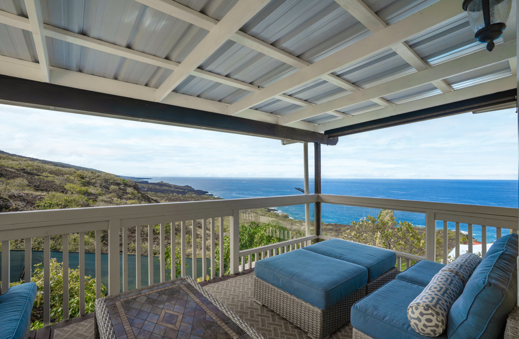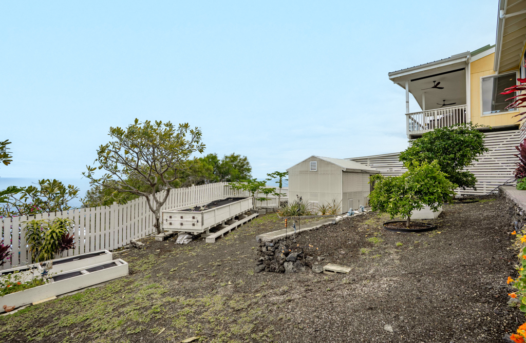 Sweeping, unobstructed ocean, sunset, and coastline views define this exceptional end-lot residence in highly desirable Kona Paradise. This private 4-bedroom, 3-bathroom home has been extensively upgraded with newly remodeled kitchen and bathrooms, complemented by striking custom woodworking throughout. A handcrafted vent hood serves as a true showpiece in the kitchen, reflecting the quality and attention to detail carried throughout the home. Vaulted ceilings, skylights, and expansive windows flood the interior with natural light while framing the Pacific from multiple living areas. Luxury vinyl flooring adds warmth, and the open-concept design flows seamlessly to a spacious lanai–ideal for entertaining, dining, or simply enjoying the sound of the waves below. The flexible layout offers privacy and versatility, including separate guest spaces with their own lanais and a primary suite positioned to capture horizon views. The fully fenced property is thoughtfully terraced with mature tropical landscaping, a gazebo, and an impressive array of fruit trees, raised garden beds, herbs, and a hydroponic greenhouse–creating a self-sustaining island retreat. Additional highlights include a 23-panel owned photovoltaic solar system, UV-filtered windows for enhanced comfort, a water filtration system, and recent exterior improvements. Located just minutes from Pebble Beach and Ho'okena Beach Park this is a rare opportunity to own a meticulously upgraded home on one of Kona Paradise’s most sought-after lots.