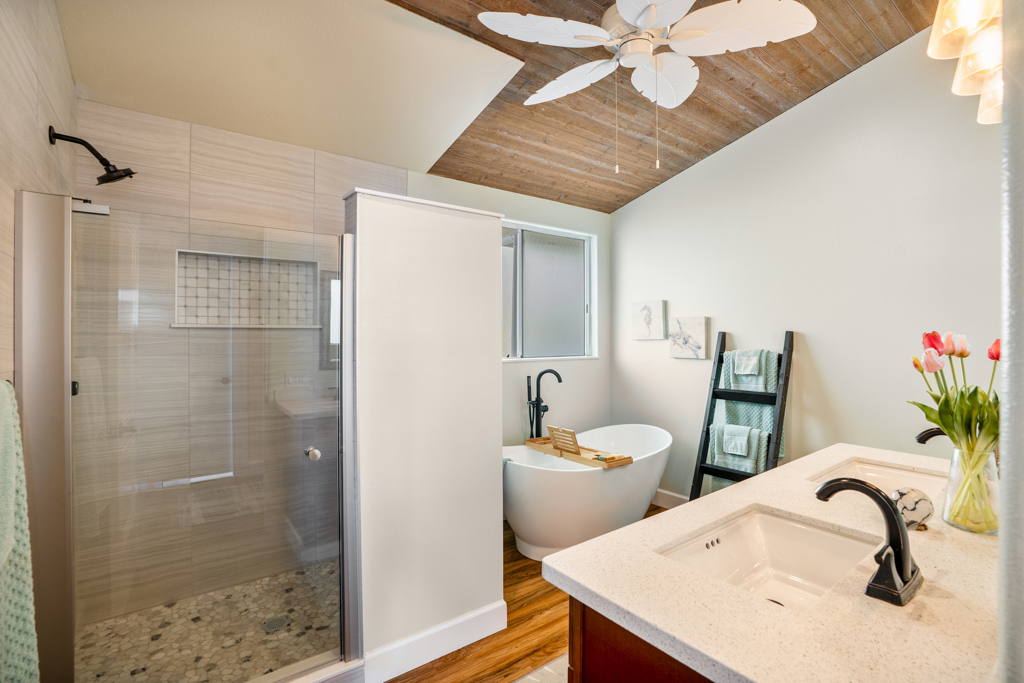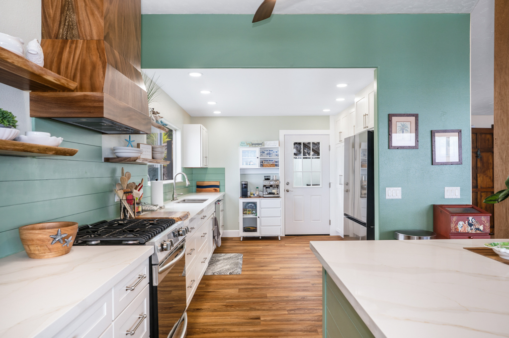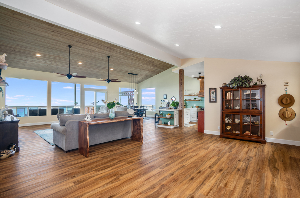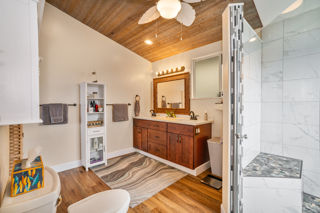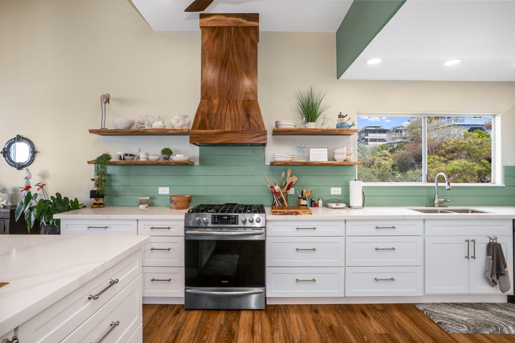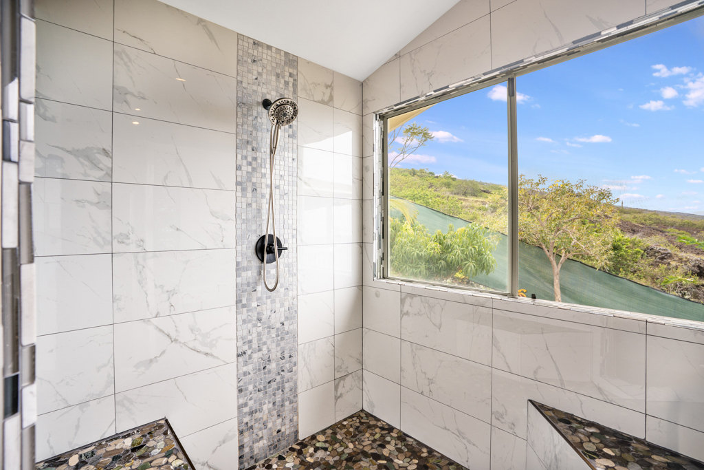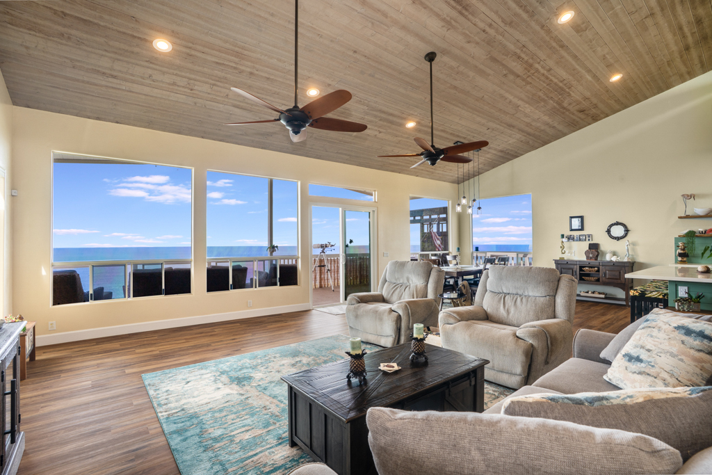 Sweeping, unobstructed ocean, sunset, and coastline views define this exceptional end-lot residence in highly desirable Kona Paradise. This private 4-bedroom, 3-bathroom home has been extensively upgraded with newly remodeled kitchen and bathrooms, complemented by striking custom woodworking throughout. A handcrafted vent hood serves as a true showpiece in the kitchen, reflecting the quality and attention to detail carried throughout the home. Vaulted ceilings, skylights, and expansive windows flood the interior with natural light while framing the Pacific from multiple living areas. Luxury vinyl flooring adds warmth, and the open-concept design flows seamlessly to a spacious lanai–ideal for entertaining, dining, or simply enjoying the sound of the waves below. The flexible layout offers privacy and versatility, including separate guest spaces with their own lanais and a primary suite positioned to capture horizon views. The fully fenced property is thoughtfully terraced with mature tropical landscaping, a gazebo, and an impressive array of fruit trees, raised garden beds, herbs, and a hydroponic greenhouse–creating a self-sustaining island retreat. Additional highlights include a 23-panel owned photovoltaic solar system, UV-filtered windows for enhanced comfort, a water filtration system, and recent exterior improvements. Located just minutes from Pebble Beach and Ho'okena Beach Park this is a rare opportunity to own a meticulously upgraded home on one of Kona Paradise’s most sought-after lots.