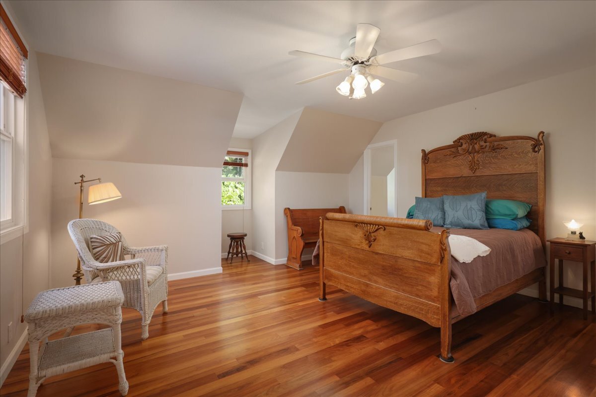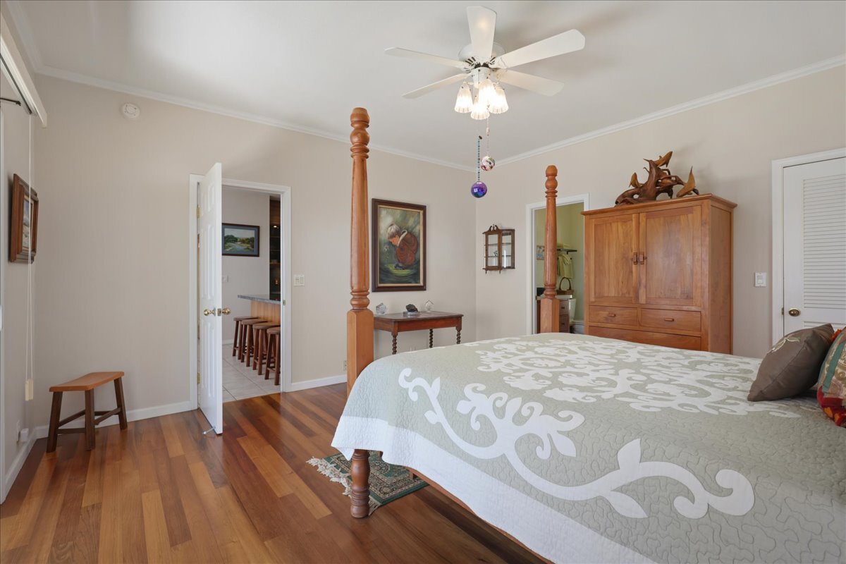 The gourmet kitchen has premium appliances and custom Koa cabinets, bringing island charm into everyday living. Tasmanian blackwood floors extend throughout the second primary suite and the upstairs bedrooms.
