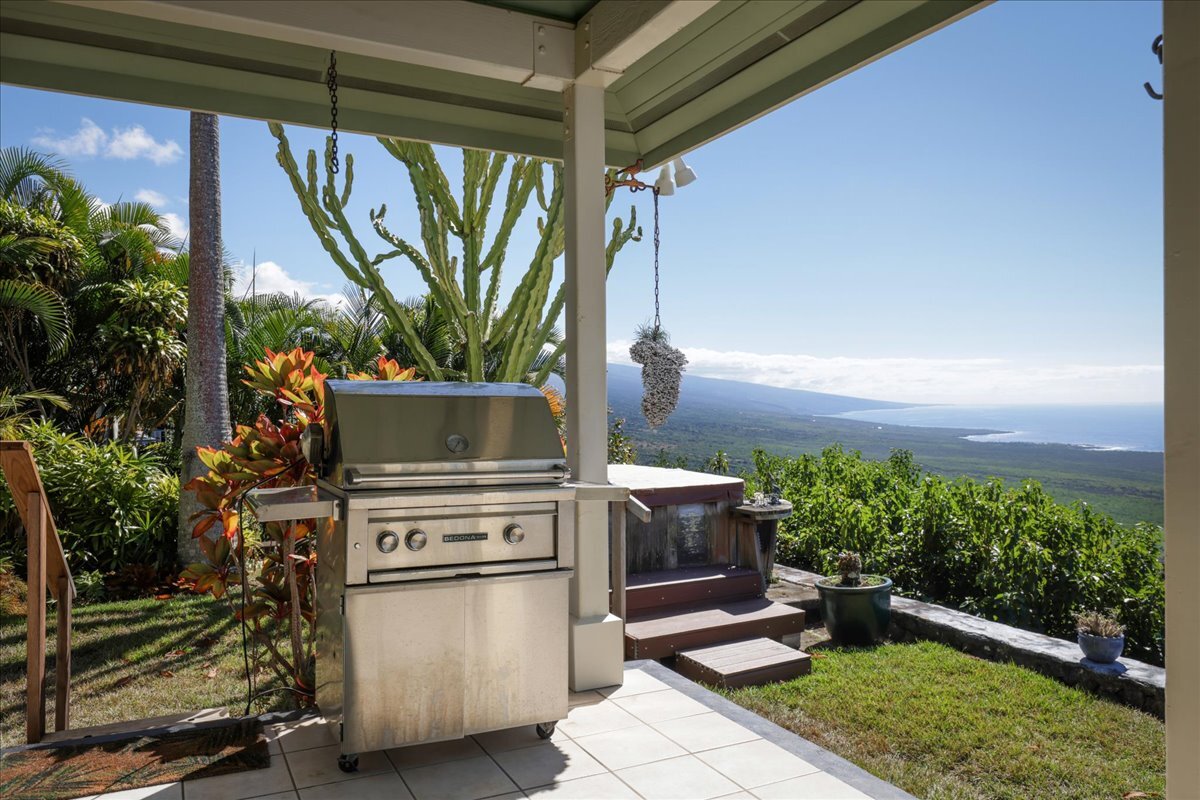 Lanais on both sides of the home provide versatile outdoor sitting areas, ideal for enjoying Kona’s gentle breezes and shifting light throughout the day. Relax in the serene hot tub or rinse off in the outdoor shower.