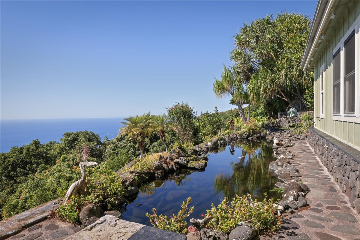 The lush one-acre lot features meandering rock walls, paths and steps that wind through the property in a gentle loop, leading to terraced gardens planted with avocados, citrus, pineapple, ‘ulu (Hawaiian breadfruit), and more.
