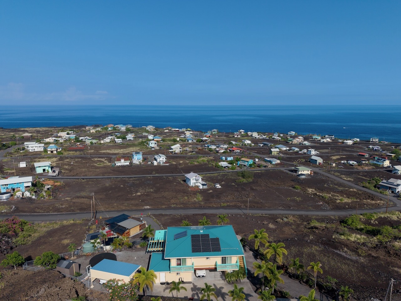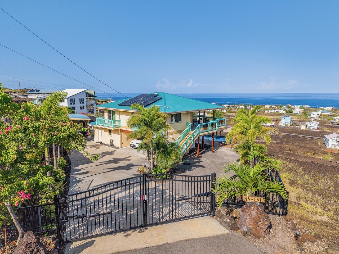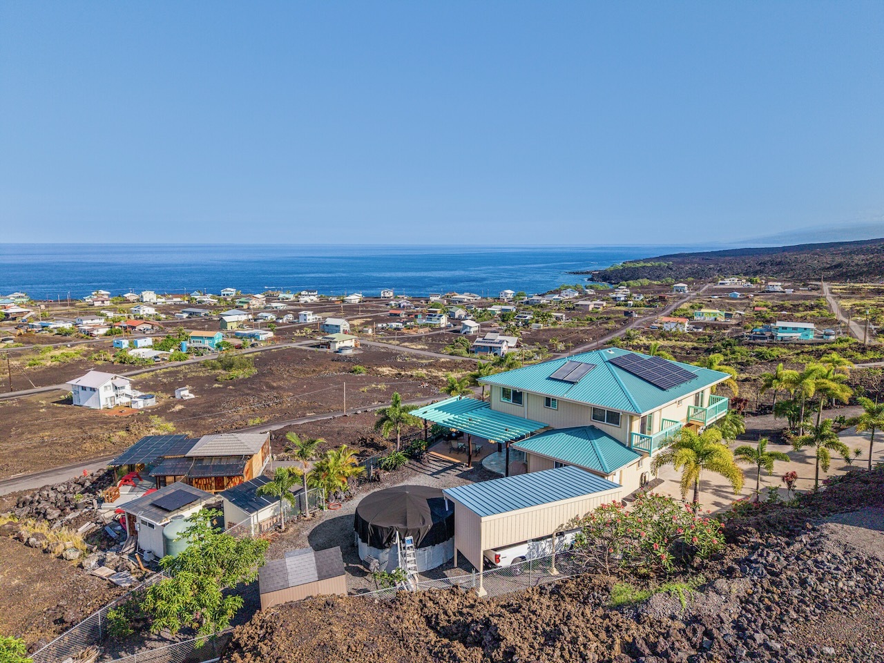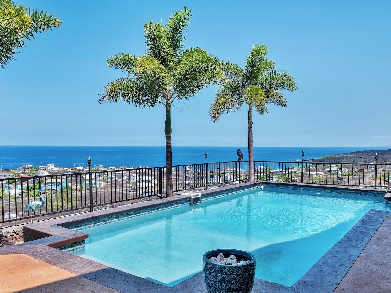 Commanding ocean, coastline, & sunset views create a truly breathtaking backdrop for this exceptionally refined, fully furnished island retreat where absolutely no detail has been left unfinished. Meticulously & comprehensively updated, the home reflects a level of care & craftsmanship that is immediately evident. Enhancements include fresh interior & exterior paint, designer light fixtures & fans, all new appliances, & newly sealed lanai concrete. A $20,000 pool upgrade, along w/ a new house pump & pool pump, elevate function & enjoyment. Upstairs features 2 bedrooms w/ private lanais, 2 baths, & an open-concept kitchen, living, & dining area with vaulted ceilings, striking ohia wood posts, & custom blinds. Designed to capture exceptional views from every angle, this layout flows seamlessly to the lanai for true indoor-outdoor living and decorative railings preserve the open feeling. Downstairs is a 1/1 living space with kitchenette, ideal for guests, extended living, or hosted rental opportunities. A newly converted rec room/she shed/man cave adds lifestyle flexibility. Outdoor living is nothing short of extraordinary. A sparkling pool (3’—8.5’ depth) with entertainment lighting anchors the space surrounded by stained concrete decking & a pergola lounge area perfect for admiring the ever-changing ocean and sunset views, relaxing or entertaining under the Hawaiian sky. Highlights: Owned Photovoltaic system - Tesla battery & 21 years remaining on the warranty 10,000-gallon catchment system with double UV filtration Solar driveway gate w/ remote, property fully fenced, security cameras & motion detectors Foxtail palms, meticulous easy landscaping & solar lighting Lime, lemon, mango, papaya, & pineapple. 2-car carport with W/D, new boat carport Septic system in place–no cesspool conversion required. A rare offering where luxury, beauty, & thoughtful design converge–impeccably maintained & 100% move-in ready.