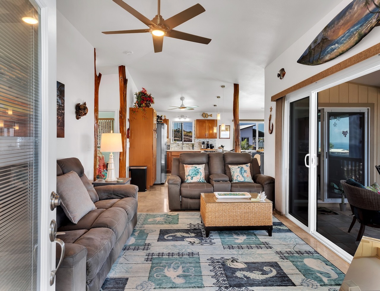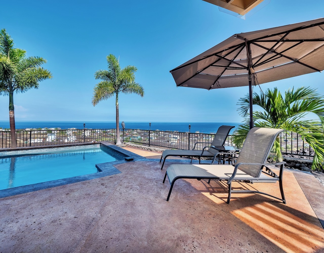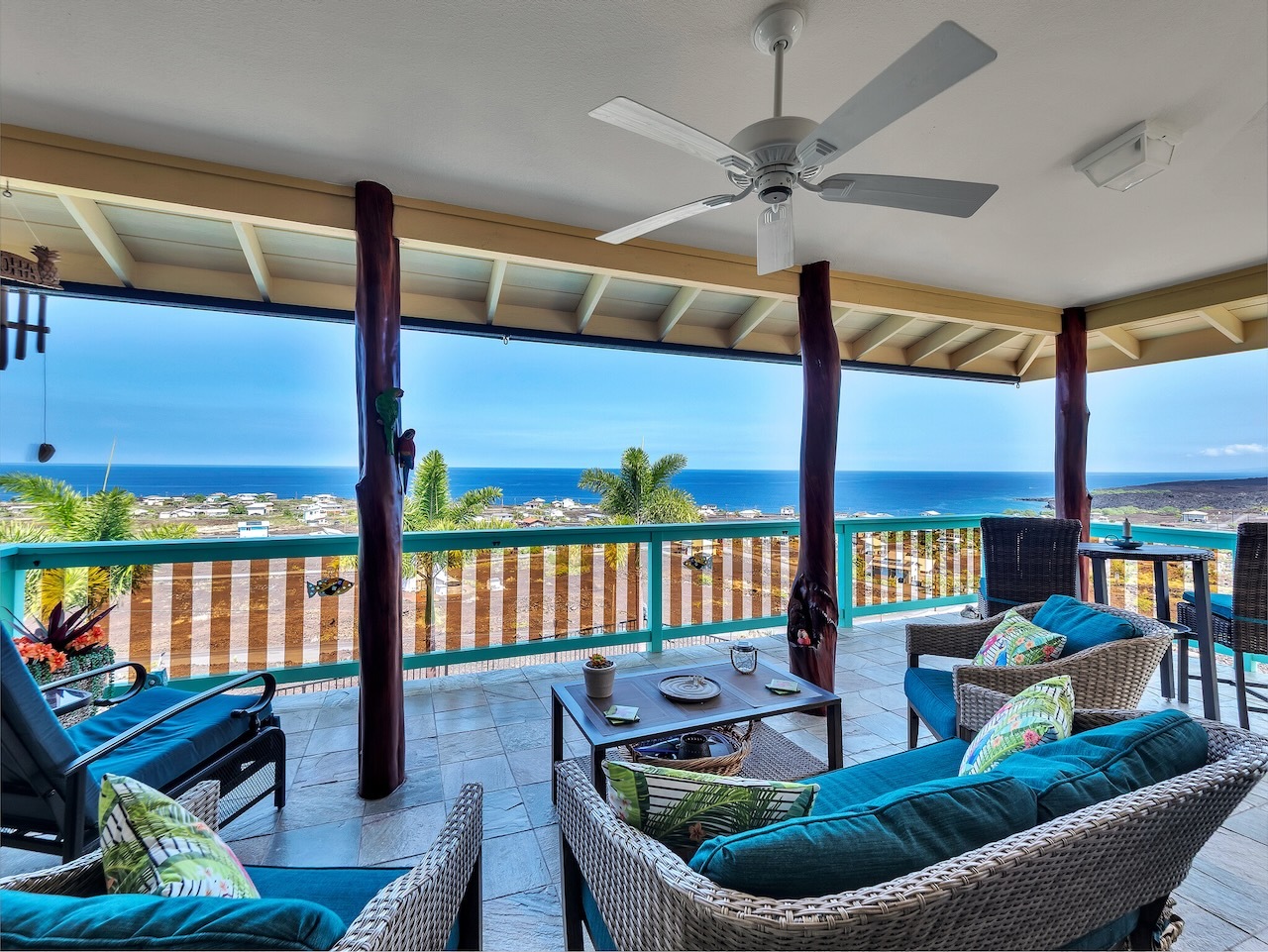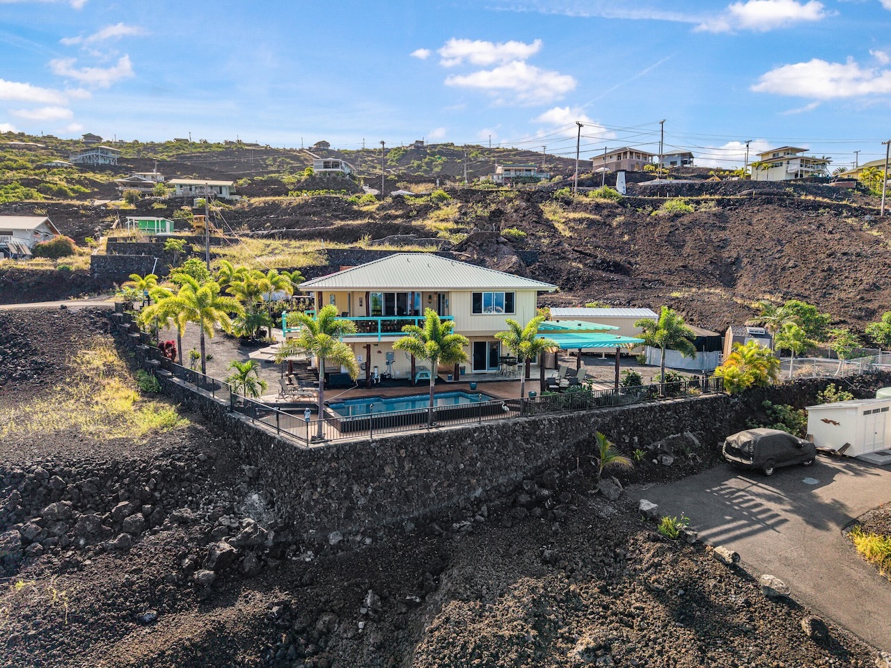 Commanding ocean, coastline, & sunset views create a truly breathtaking backdrop for this exceptionally refined, fully furnished island retreat where absolutely no detail has been left unfinished. Meticulously & comprehensively updated, the home reflects a level of care & craftsmanship that is immediately evident. Enhancements include fresh interior & exterior paint, designer light fixtures & fans, all new appliances, & newly sealed lanai concrete. A $20,000 pool upgrade, along w/ a new house pump & pool pump, elevate function & enjoyment. Upstairs features 2 bedrooms w/ private lanais, 2 baths, & an open-concept kitchen, living, & dining area with vaulted ceilings, striking ohia wood posts, & custom blinds. Designed to capture exceptional views from every angle, this layout flows seamlessly to the lanai for true indoor-outdoor living and decorative railings preserve the open feeling. Downstairs is a 1/1 living space with kitchenette, ideal for guests, extended living, or hosted rental opportunities. A newly converted rec room/she shed/man cave adds lifestyle flexibility. Outdoor living is nothing short of extraordinary. A sparkling pool (3’—8.5’ depth) with entertainment lighting anchors the space surrounded by stained concrete decking & a pergola lounge area perfect for admiring the ever-changing ocean and sunset views, relaxing or entertaining under the Hawaiian sky. Highlights: Owned Photovoltaic system - Tesla battery & 21 years remaining on the warranty 10,000-gallon catchment system with double UV filtration Solar driveway gate w/ remote, property fully fenced, security cameras & motion detectors Foxtail palms, meticulous easy landscaping & solar lighting Lime, lemon, mango, papaya, & pineapple. 2-car carport with W/D, new boat carport Septic system in place–no cesspool conversion required. A rare offering where luxury, beauty, & thoughtful design converge–impeccably maintained & 100% move-in ready.