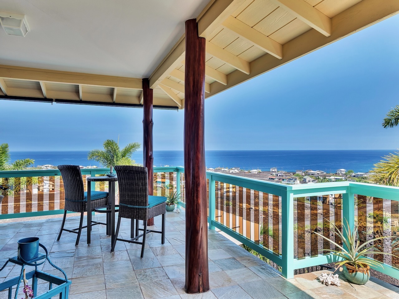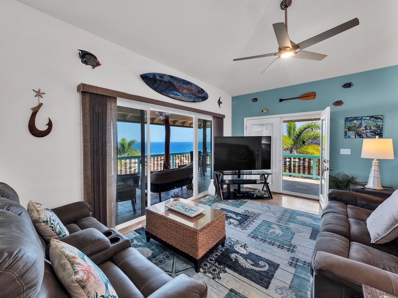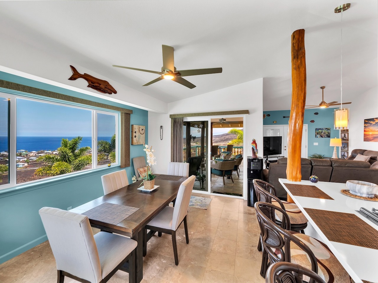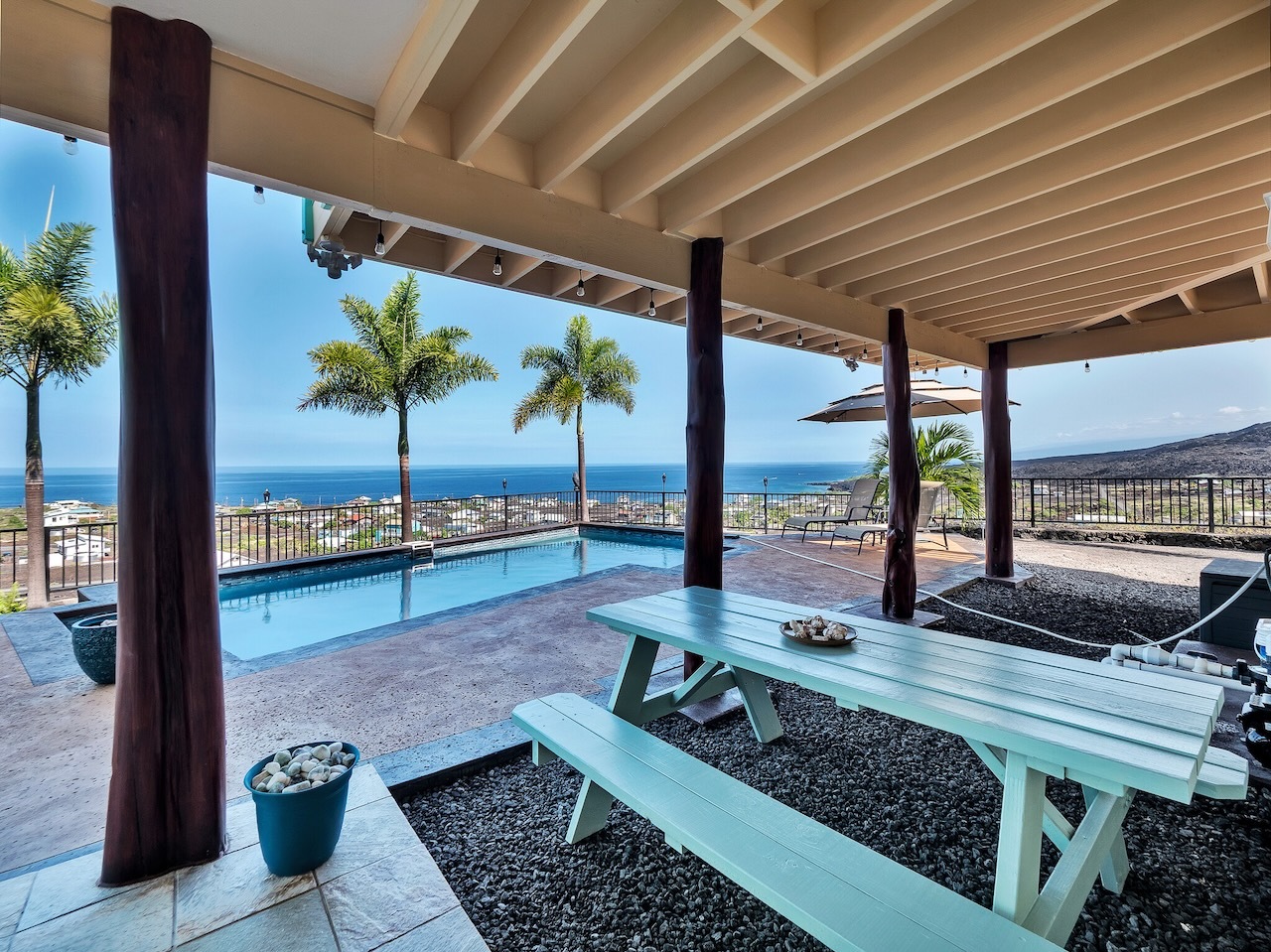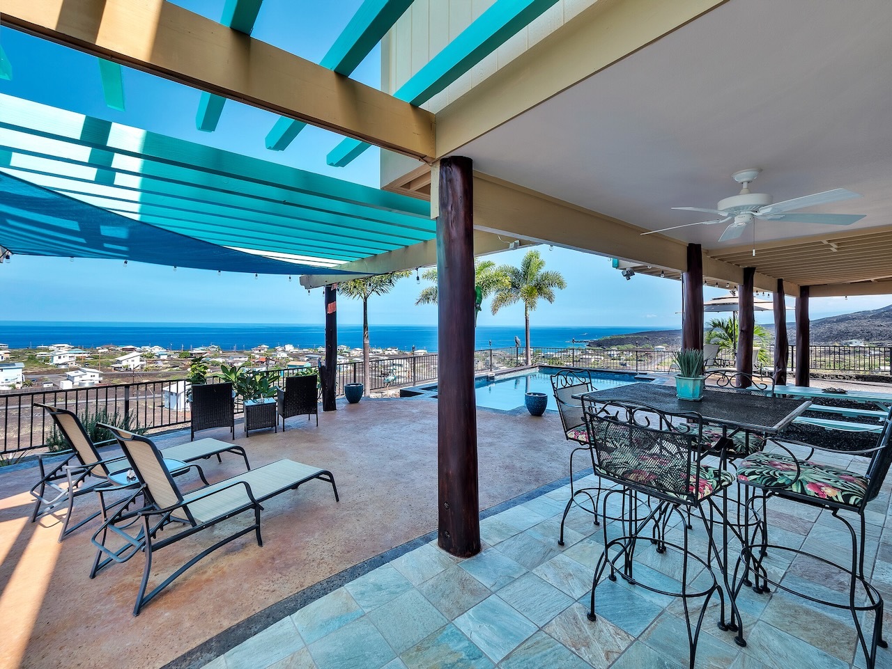 Commanding ocean, coastline, & sunset views create a truly breathtaking backdrop for this exceptionally refined, fully furnished island retreat where absolutely no detail has been left unfinished. Meticulously & comprehensively updated, the home reflects a level of care & craftsmanship that is immediately evident. Enhancements include fresh interior & exterior paint, designer light fixtures & fans, all new appliances, & newly sealed lanai concrete. A $20,000 pool upgrade, along w/ a new house pump & pool pump, elevate function & enjoyment. Upstairs features 2 bedrooms w/ private lanais, 2 baths, & an open-concept kitchen, living, & dining area with vaulted ceilings, striking ohia wood posts, & custom blinds. Designed to capture exceptional views from every angle, this layout flows seamlessly to the lanai for true indoor-outdoor living and decorative railings preserve the open feeling. Downstairs is a 1/1 living space with kitchenette, ideal for guests, extended living, or hosted rental opportunities. A newly converted rec room/she shed/man cave adds lifestyle flexibility. Outdoor living is nothing short of extraordinary. A sparkling pool (3’—8.5’ depth) with entertainment lighting anchors the space surrounded by stained concrete decking & a pergola lounge area perfect for admiring the ever-changing ocean and sunset views, relaxing or entertaining under the Hawaiian sky. Highlights: Owned Photovoltaic system - Tesla battery & 21 years remaining on the warranty 10,000-gallon catchment system with double UV filtration Solar driveway gate w/ remote, property fully fenced, security cameras & motion detectors Foxtail palms, meticulous easy landscaping & solar lighting Lime, lemon, mango, papaya, & pineapple. 2-car carport with W/D, new boat carport Septic system in place–no cesspool conversion required. A rare offering where luxury, beauty, & thoughtful design converge–impeccably maintained & 100% move-in ready.