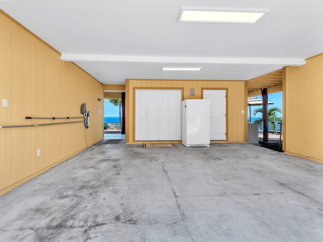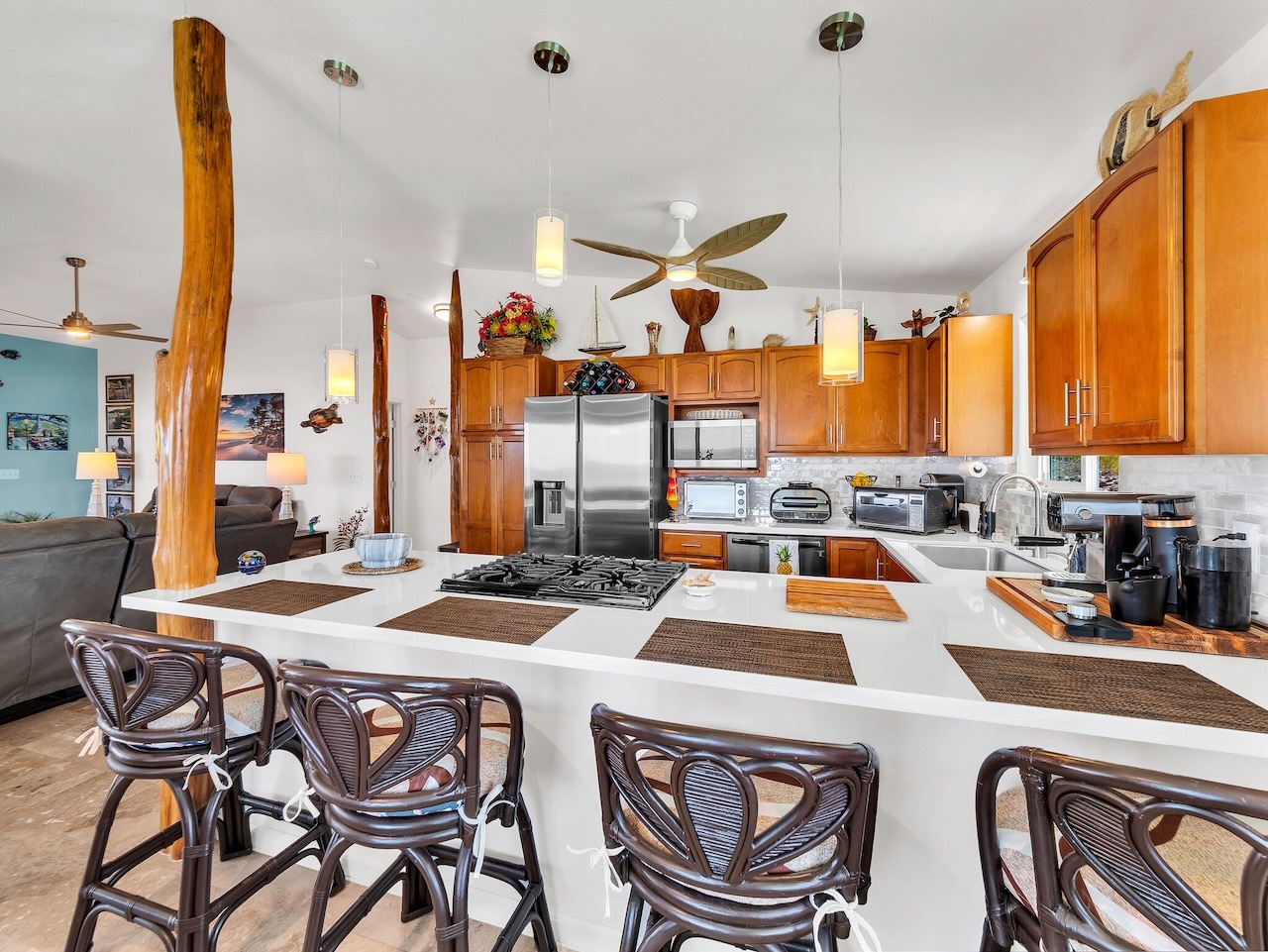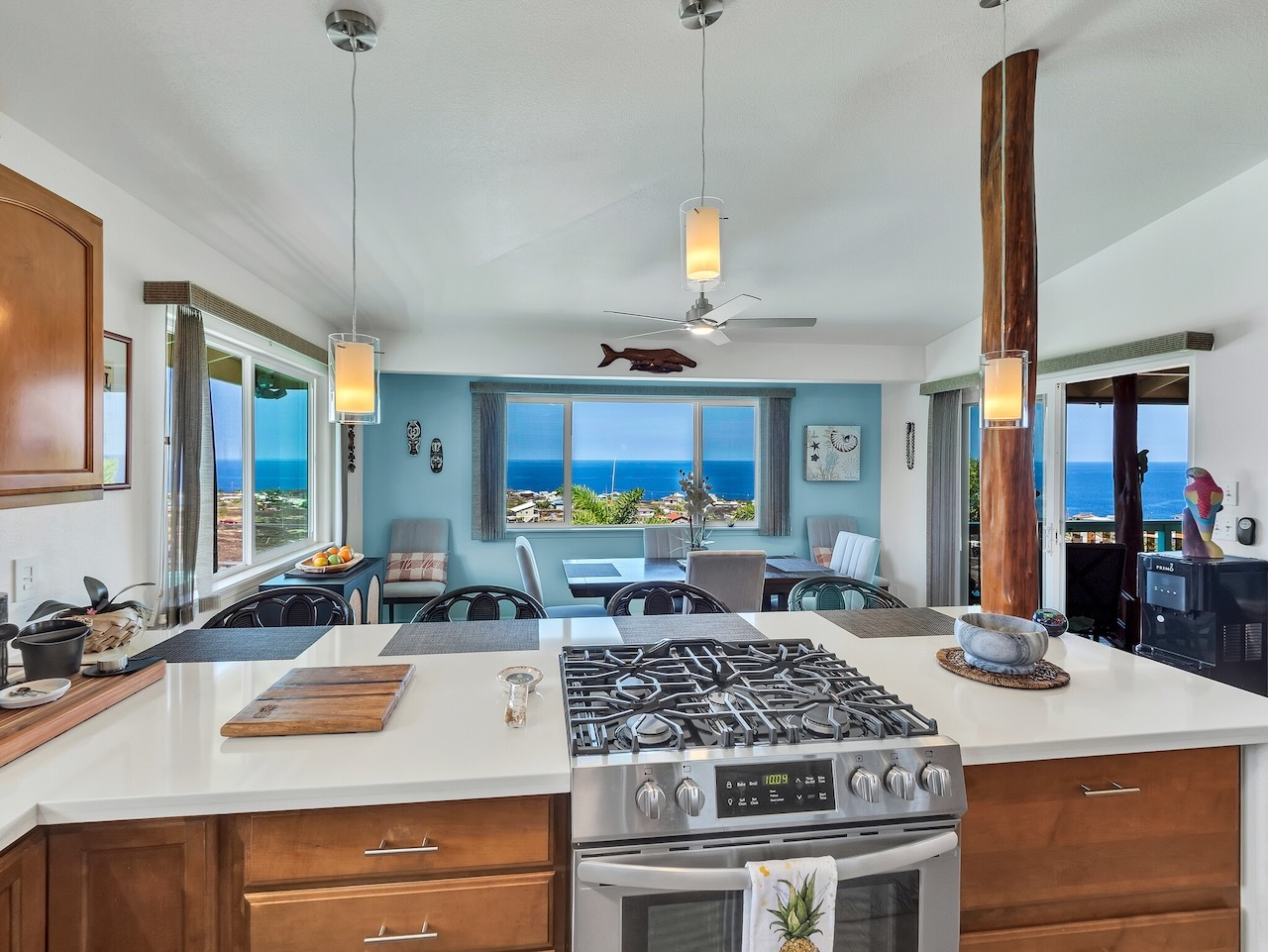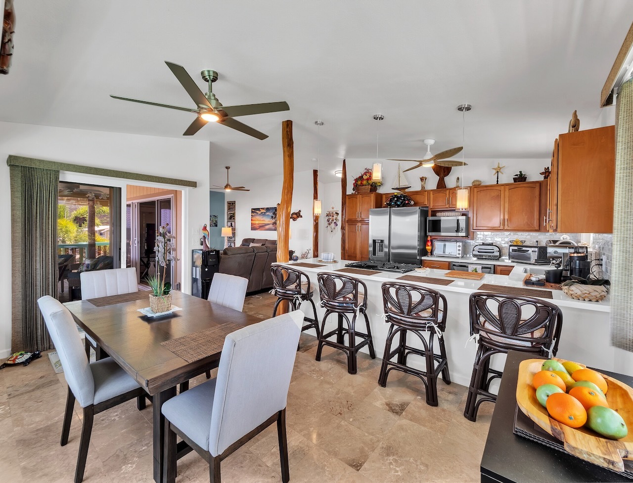 Commanding ocean, coastline, & sunset views create a truly breathtaking backdrop for this exceptionally refined, fully furnished island retreat where absolutely no detail has been left unfinished. Meticulously & comprehensively updated, the home reflects a level of care & craftsmanship that is immediately evident. Enhancements include fresh interior & exterior paint, designer light fixtures & fans, all new appliances, & newly sealed lanai concrete. A $20,000 pool upgrade, along w/ a new house pump & pool pump, elevate function & enjoyment. Upstairs features 2 bedrooms w/ private lanais, 2 baths, & an open-concept kitchen, living, & dining area with vaulted ceilings, striking ohia wood posts, & custom blinds. Designed to capture exceptional views from every angle, this layout flows seamlessly to the lanai for true indoor-outdoor living and decorative railings preserve the open feeling. Downstairs is a 1/1 living space with kitchenette, ideal for guests, extended living, or hosted rental opportunities. A newly converted rec room/she shed/man cave adds lifestyle flexibility. Outdoor living is nothing short of extraordinary. A sparkling pool (3’—8.5’ depth) with entertainment lighting anchors the space surrounded by stained concrete decking & a pergola lounge area perfect for admiring the ever-changing ocean and sunset views, relaxing or entertaining under the Hawaiian sky. Highlights: Owned Photovoltaic system - Tesla battery & 21 years remaining on the warranty 10,000-gallon catchment system with double UV filtration Solar driveway gate w/ remote, property fully fenced, security cameras & motion detectors Foxtail palms, meticulous easy landscaping & solar lighting Lime, lemon, mango, papaya, & pineapple. 2-car carport with W/D, new boat carport Septic system in place–no cesspool conversion required. A rare offering where luxury, beauty, & thoughtful design converge–impeccably maintained & 100% move-in ready.