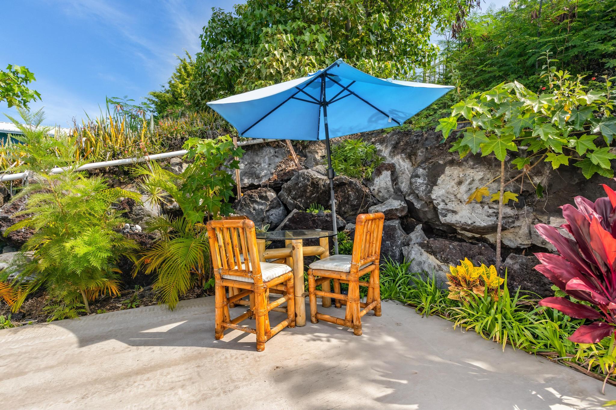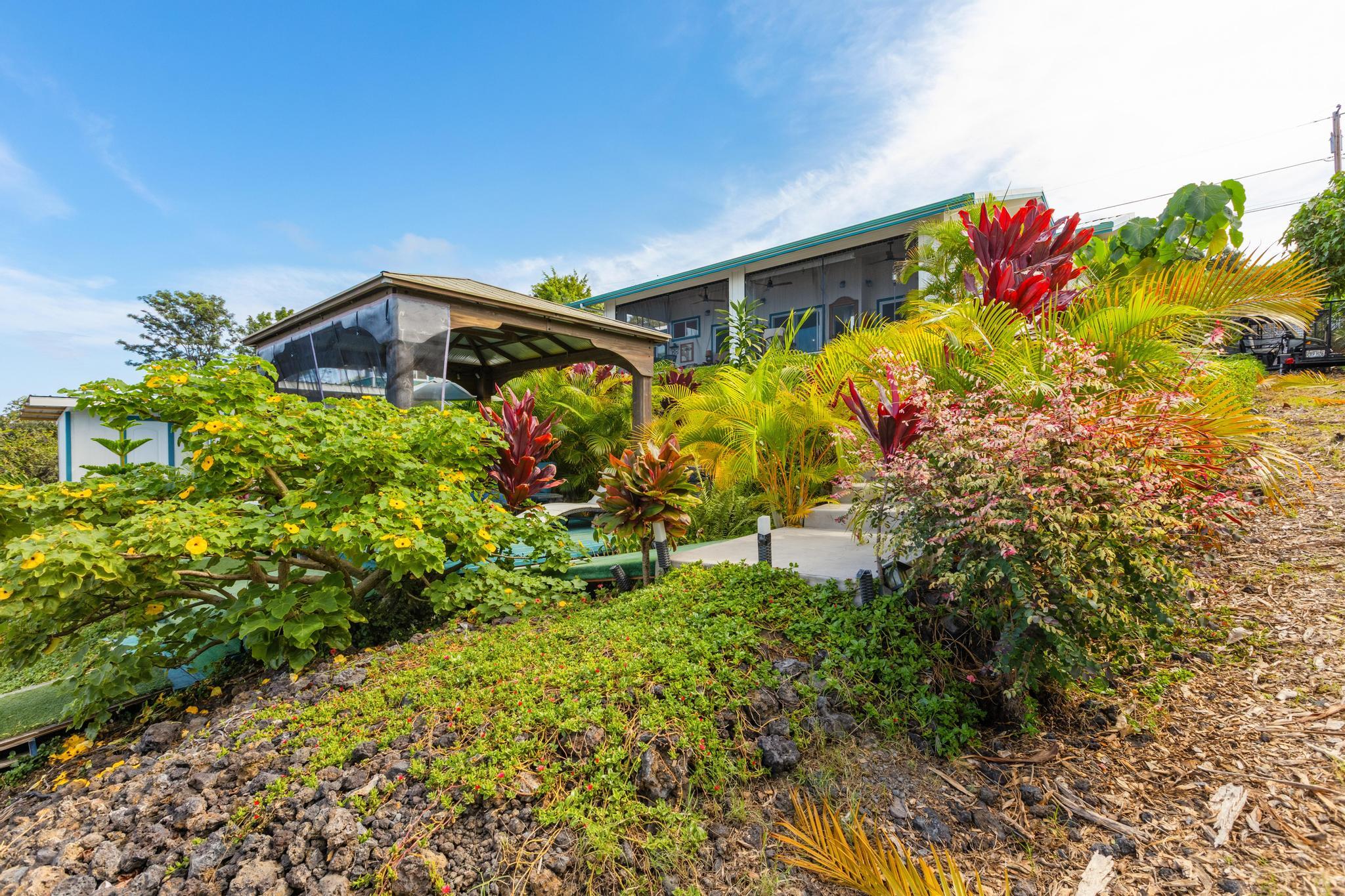 The landscaped has fruit trees and flowering plants, including coffee, papaya, banana, key lime, soursop, mulberry, star gooseberry, loquat, rambutan, jaboticaba, coconut, taro, avocado, and mango.