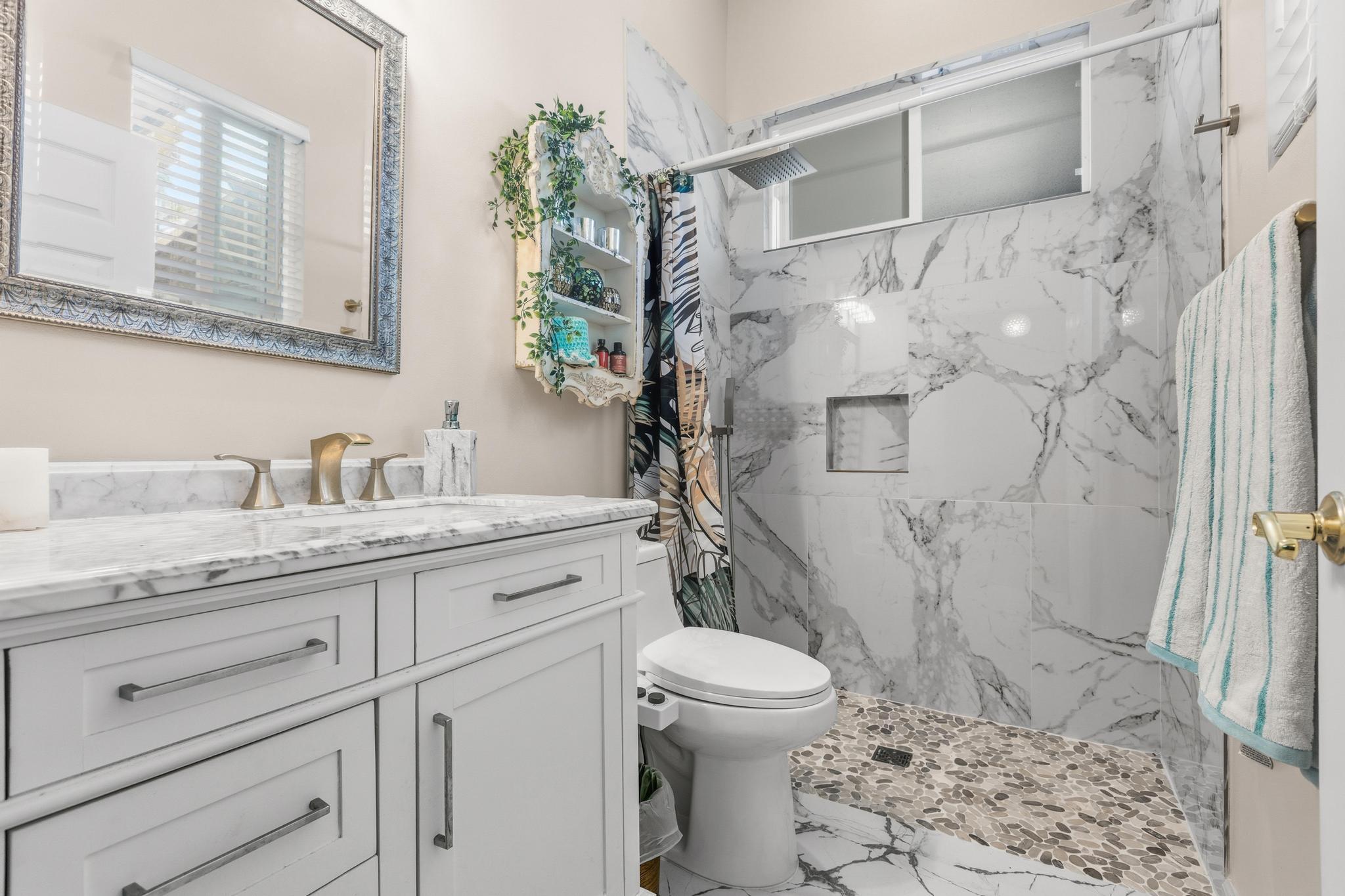 The primary suite offers ocean views through glass sliding doors, a walk-in closet, and a luxurious marble en suite bathroom featuring marble floors, countertops, walk-in shower with gold fixtures, and a bidet. The guest suite on the opposite side of the home also enjoys ocean views and a marble-finished bathroom.