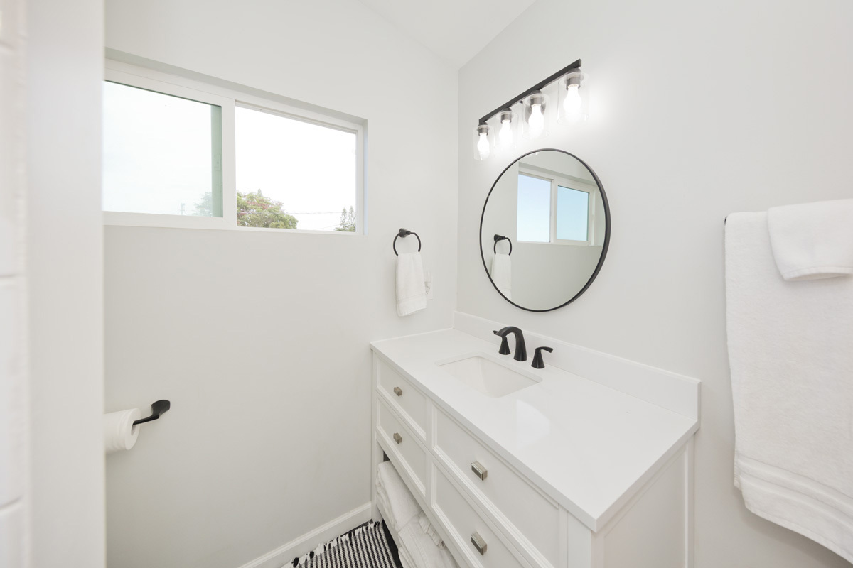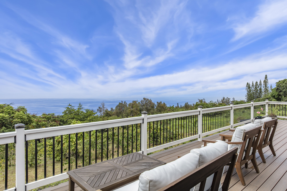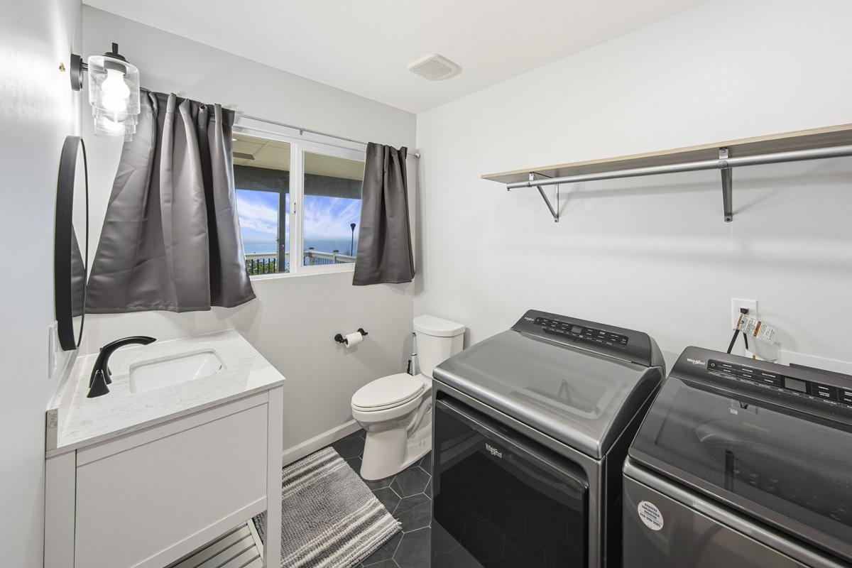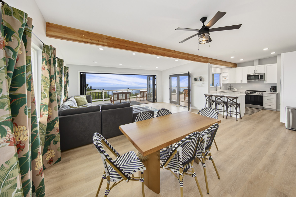 This beautifully renovated home offers stunning ocean views and features 2 bedrooms and 2.5 bathrooms. Each spacious bedroom includes a full bath and a walk-in closet. The entire home has been completely updated, featuring new laminate flooring throughout, as well as tile flooring in all bathrooms. Every room is equipped with a ceiling fan, and the main living area, including the dining room and kitchen, showcases recessed lighting. Experience a beautifully bright and highly functional kitchen, featuring quartz countertops and sleek stainless steel appliances. Enjoy cooking with a propane gas stove and oven, complemented by a convenient overhead microwave. This kitchen also includes a dishwasher and a spacious refrigerator/freezer combo. The laundry and utility rooms are conveniently located inside the home. The open-concept floor plan allows for a seamless transition between the outdoors and indoors, featuring bi-fold accordion doors with unobstructed ocean views. The open deck features a stylish railing for optimal views, Trex decking, and a great place to entertain. The covered deck features tile flooring and is equipped with two ceiling fans overhead.