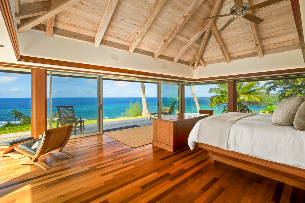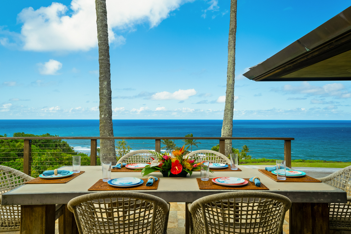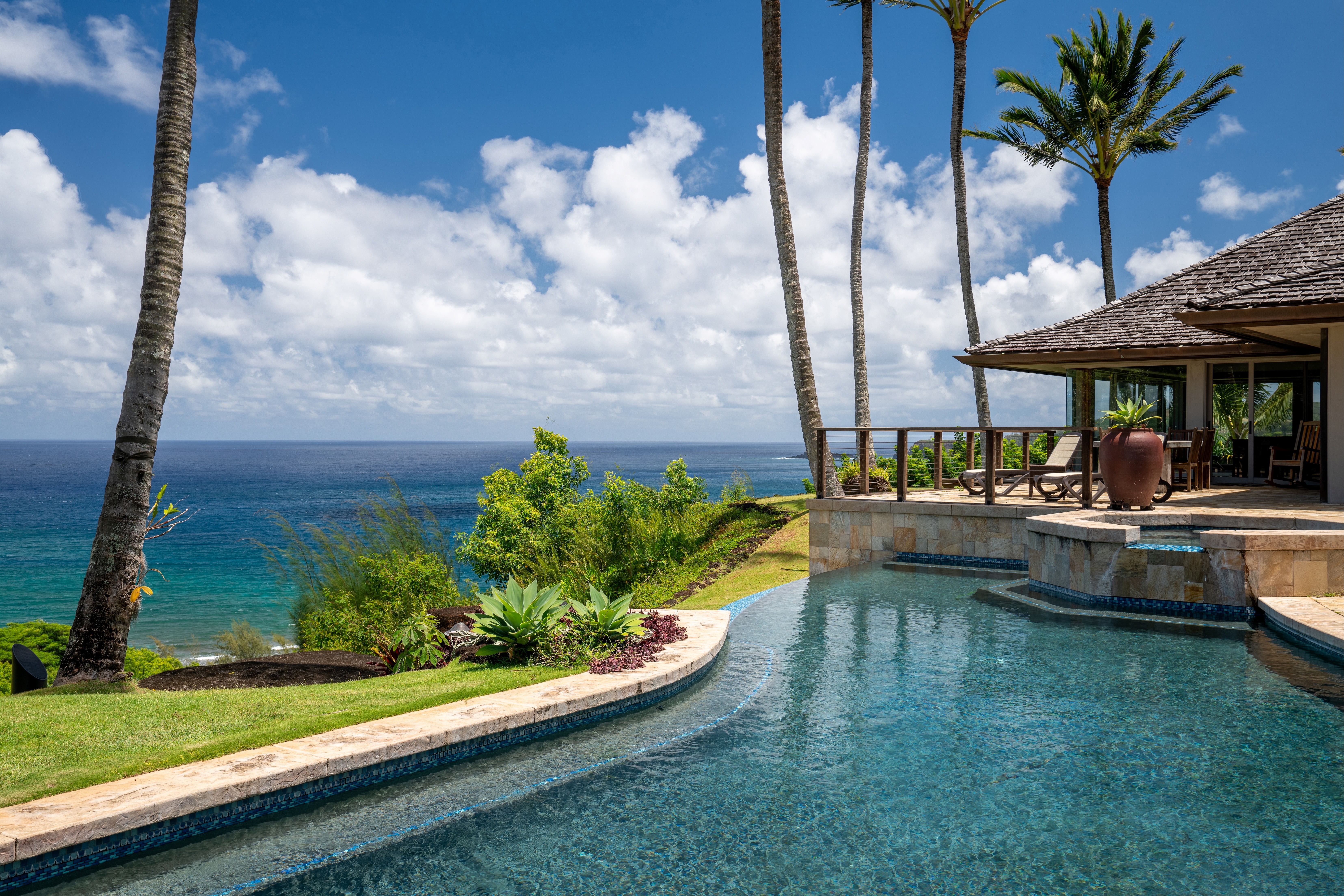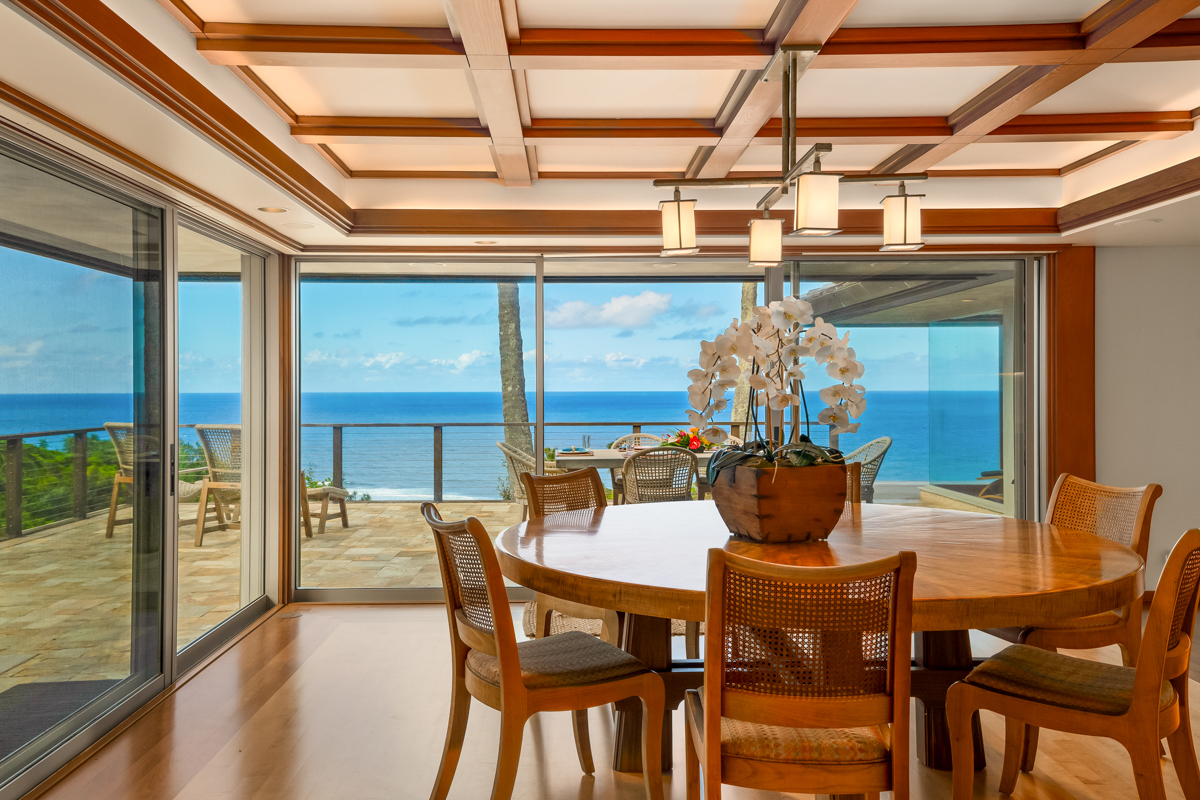 An elegant modern oceanview estate in Anini Vista on the North Shore of Kaua'i, this four-bedroom residence sits within a private gated enclave atop the bluffs overlooking Anini's reef-sheltered waters, with sweeping views from nearly every room. Upon entry, a covered breezeway welcomes you into an outdoor dining and entertainment space, where the pavilion design creates a natural flow between indoor and outdoor living. The eastern pavilion serves as the heart of the home, with living and dining areas, a well-appointed kitchen, and spacious primary suite. Views extend from Anini's reef to Kilauea Lighthouse. Across the breezeway, three bedrooms offer comfort and privacy, two with ensuite baths alongside the pool and private ocean-view lanais. An infinity-edge pool and spa with generous lanai complete the setting. The property offers access to Kilauea, Princeville, and Hanalei, with world-class golf, dining, beaches, and surf. Anini Beach and its calm, protected waters are minutes away. An opportunity to experience island living at its finest on Kaua'i's North Shore.