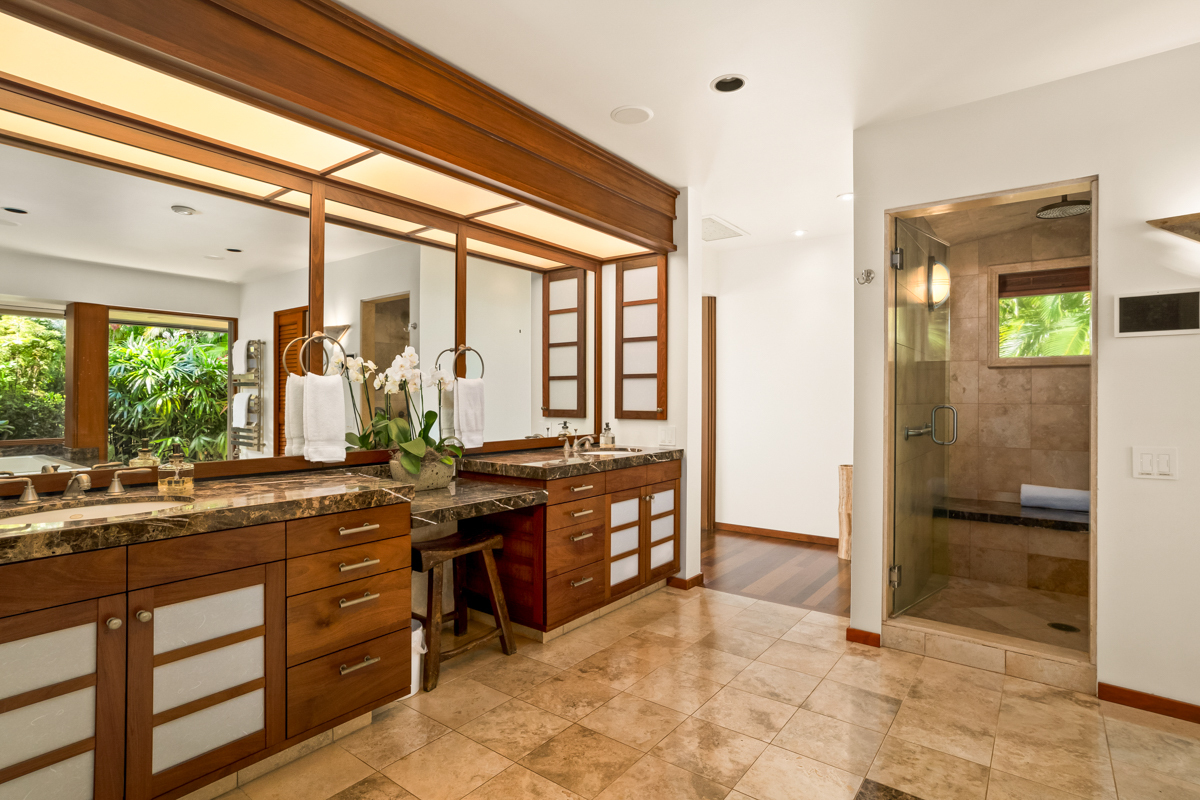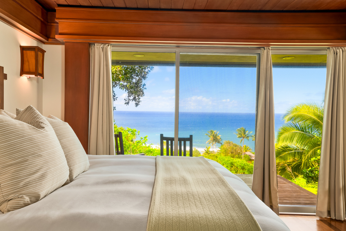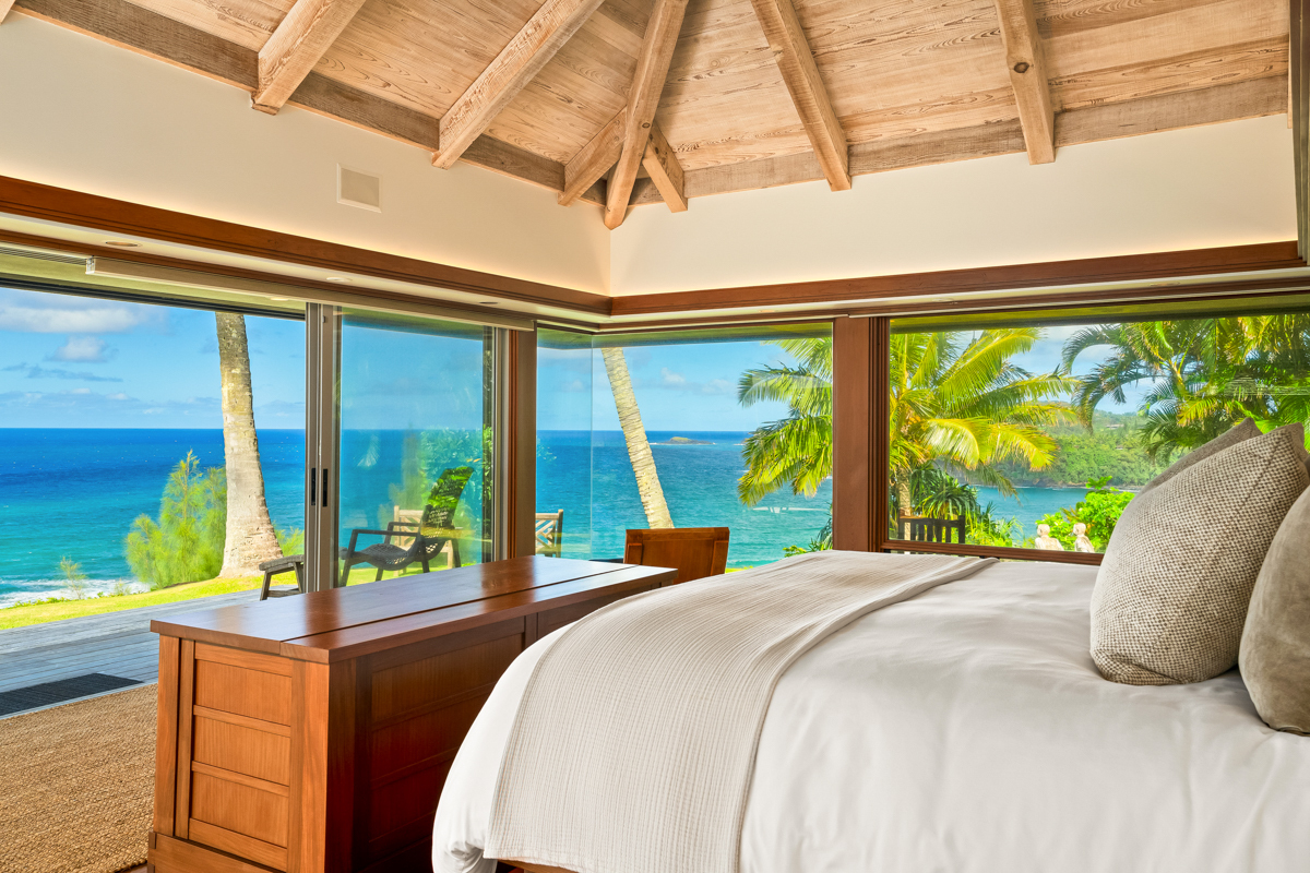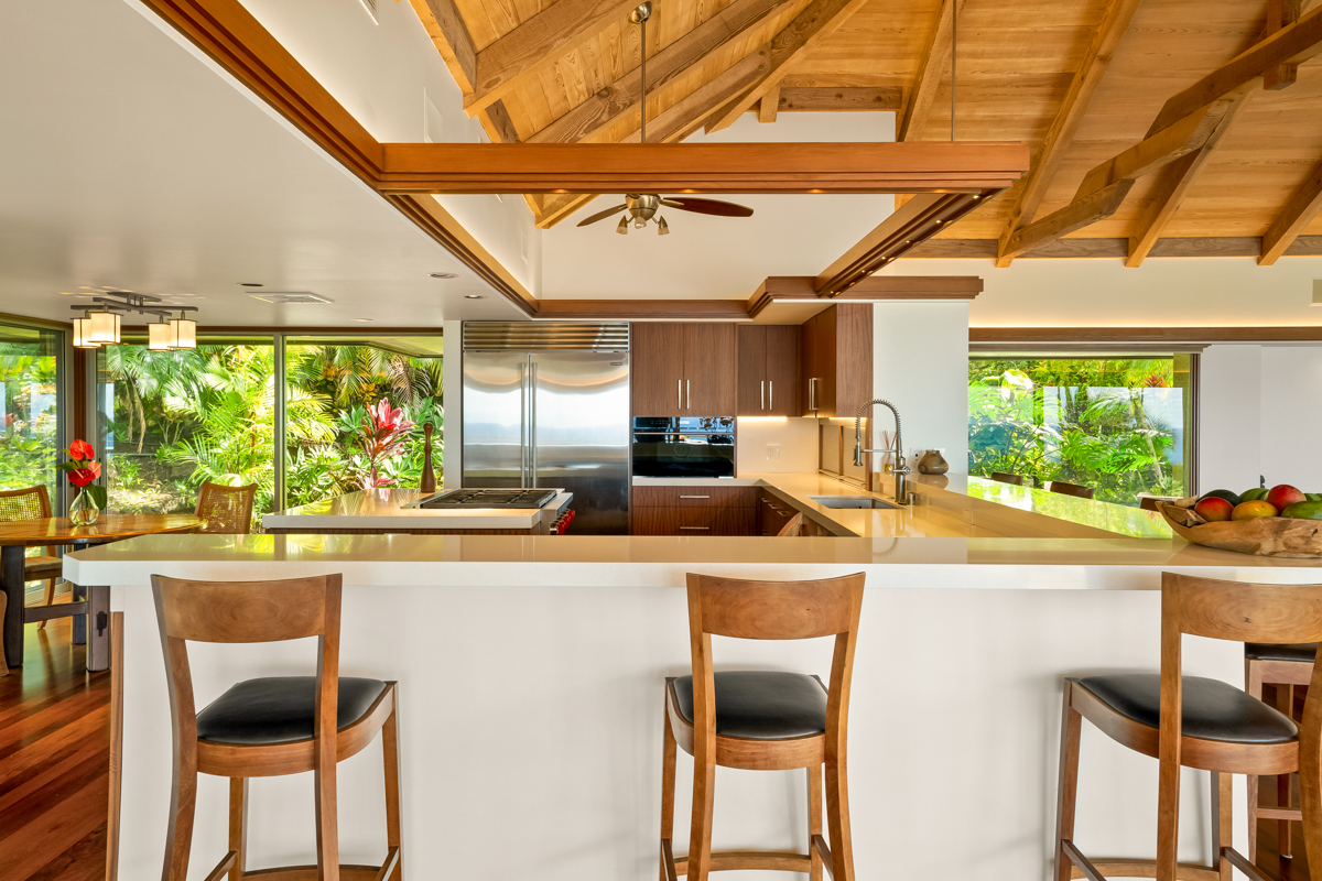 An elegant modern oceanview estate in Anini Vista on the North Shore of Kaua'i, this four-bedroom residence sits within a private gated enclave atop the bluffs overlooking Anini's reef-sheltered waters, with sweeping views from nearly every room. Upon entry, a covered breezeway welcomes you into an outdoor dining and entertainment space, where the pavilion design creates a natural flow between indoor and outdoor living. The eastern pavilion serves as the heart of the home, with living and dining areas, a well-appointed kitchen, and spacious primary suite. Views extend from Anini's reef to Kilauea Lighthouse. Across the breezeway, three bedrooms offer comfort and privacy, two with ensuite baths alongside the pool and private ocean-view lanais. An infinity-edge pool and spa with generous lanai complete the setting. The property offers access to Kilauea, Princeville, and Hanalei, with world-class golf, dining, beaches, and surf. Anini Beach and its calm, protected waters are minutes away. An opportunity to experience island living at its finest on Kaua'i's North Shore.