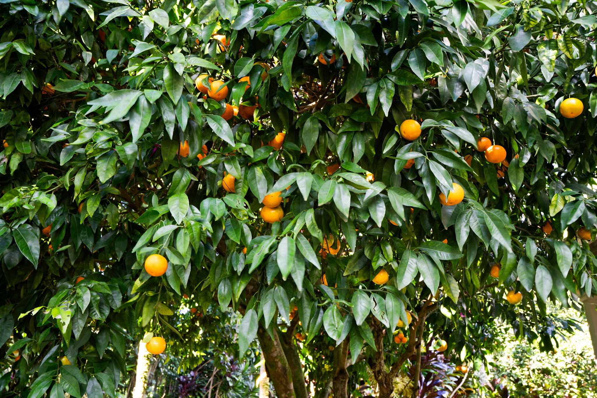 The grounds feature extensive ornamental plantings and numerous fruit trees, including avocado, lychee, banana, navel orange, tangerine, lime, guava, papaya, noni, and more.