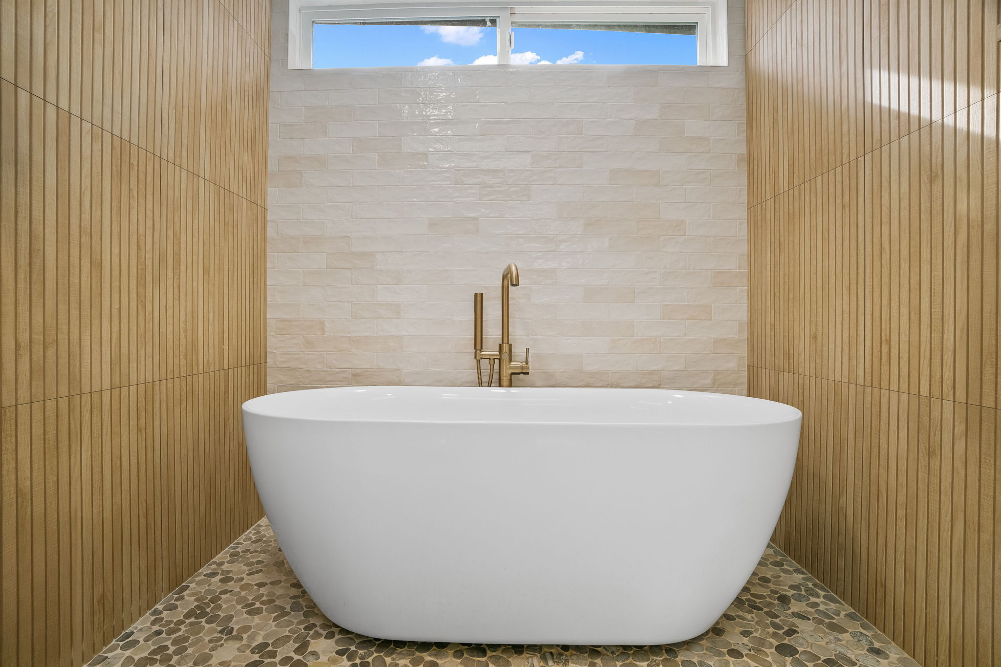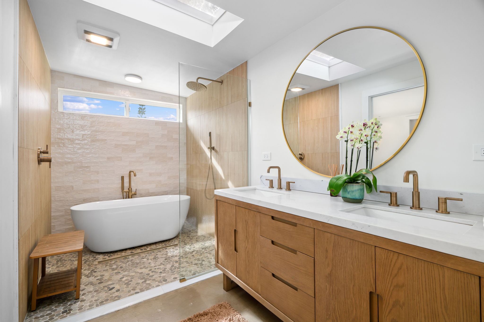 The spacious primary suite has polished concrete floors, a sitting area that leads to an outdoor lanai and a new bathroom with dual-sink vanity, walk-in shower, soaking tub, and Delta bronze fixtures with a rain shower head.
