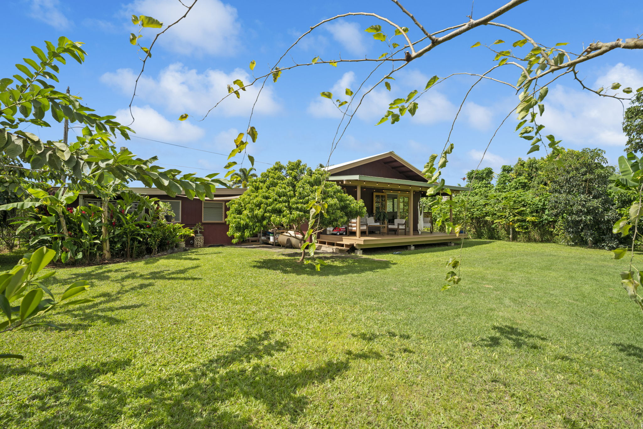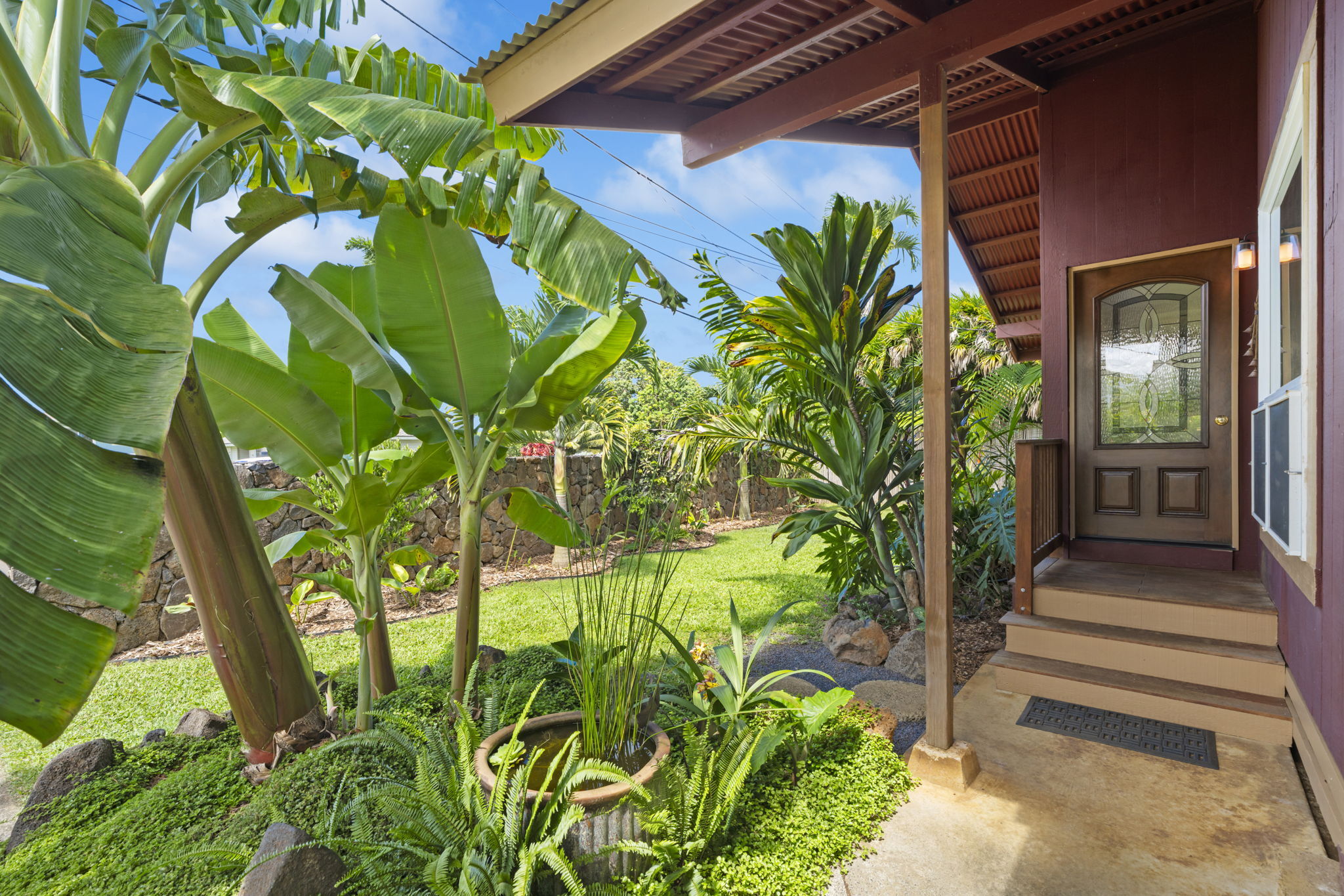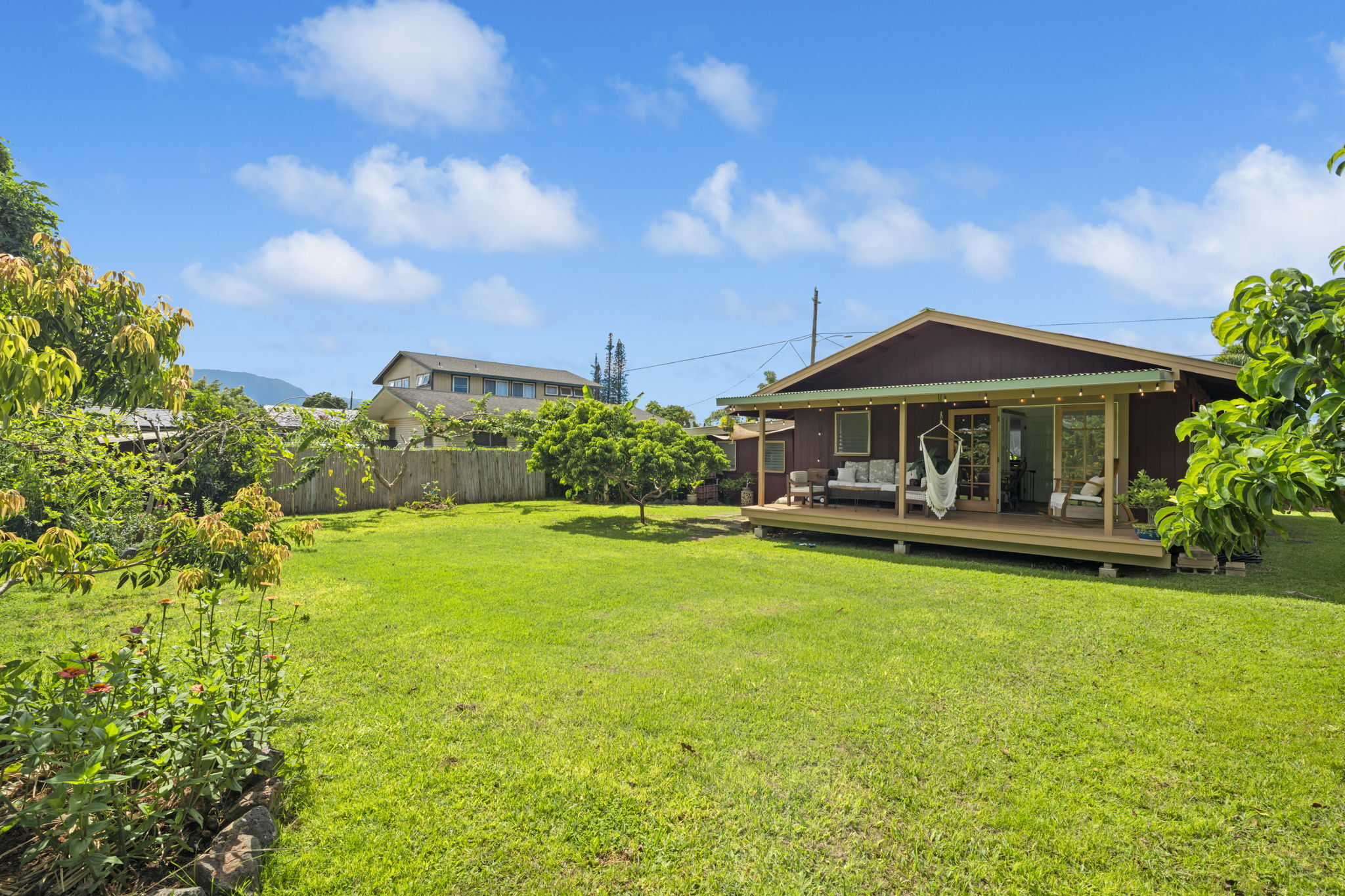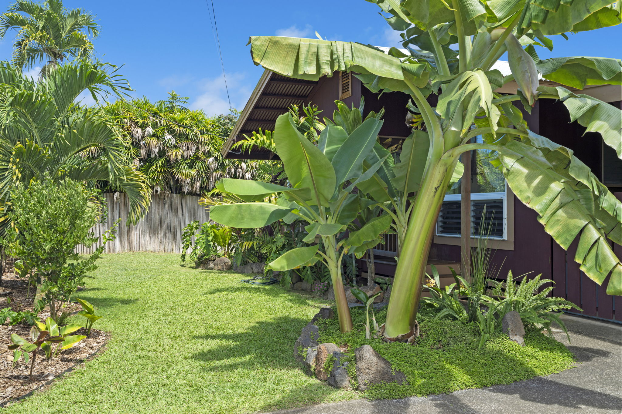The backyard is spacious, fully fenced, and beautifully landscaped with Brazilian cherry, dragon fruit, mulberry, guava, avocado, banana, macadamia nut, lychee, limes, orange, grapefruit, pineapple, papaya, bread fruit, and more. A vegetable garden and a small chicken coop add to the property's unique island charm.